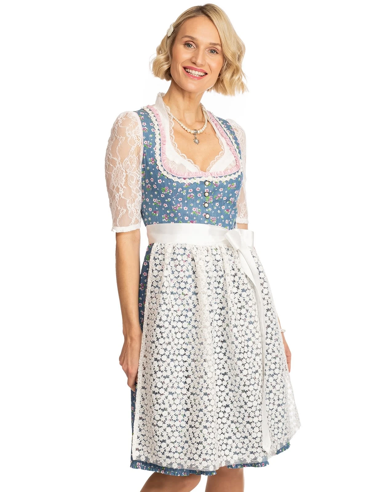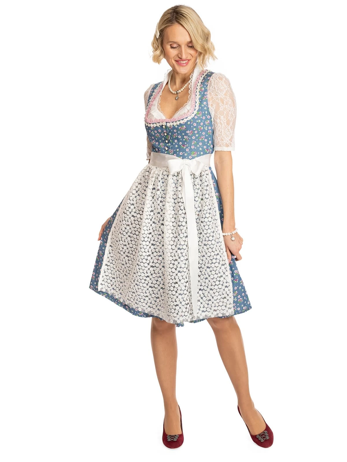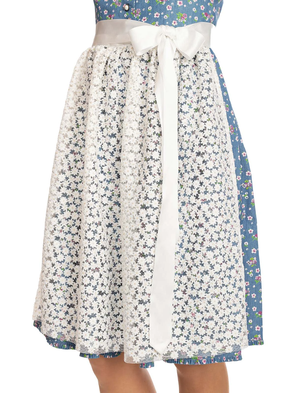 Zweiteiliges Midi-Dirndl Uta in frischem Blau. 60 Zentimeter lang ist dieses frühlingshaft-sommerliche Dirndl der Marke Alpenfee. Der himmelblaue Oberstoff aus Baumwolle ist mit einem niedlichen Blümchenmuster versehen. Das weit ausgeschnittene Mieder verfügt über einen attraktiven Knopfverschluss. Das Besondere an dem Dirndl ist die transparente Schürze, die sich aus vielen aneinandergereihten weißen Blüten zusammensetzt. Dieses frisch-fröhliche Modell eignet sich für Ausflüge, traditionelle Feste und Umzüge sowie für berufliche Anlässe.•Hinweis: Angebot ohne Dirndlbluse. •Dieses Dirndl fällt größengerecht aus. •Oberstoff und Rock 100% Baumwolle, Futter 50% Baumwolle 50% Polyester, Schürze 77% Polyester 15% Pol •Rocklänge ca. 60cm •Chemische Reinigung