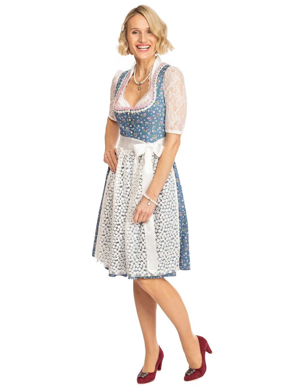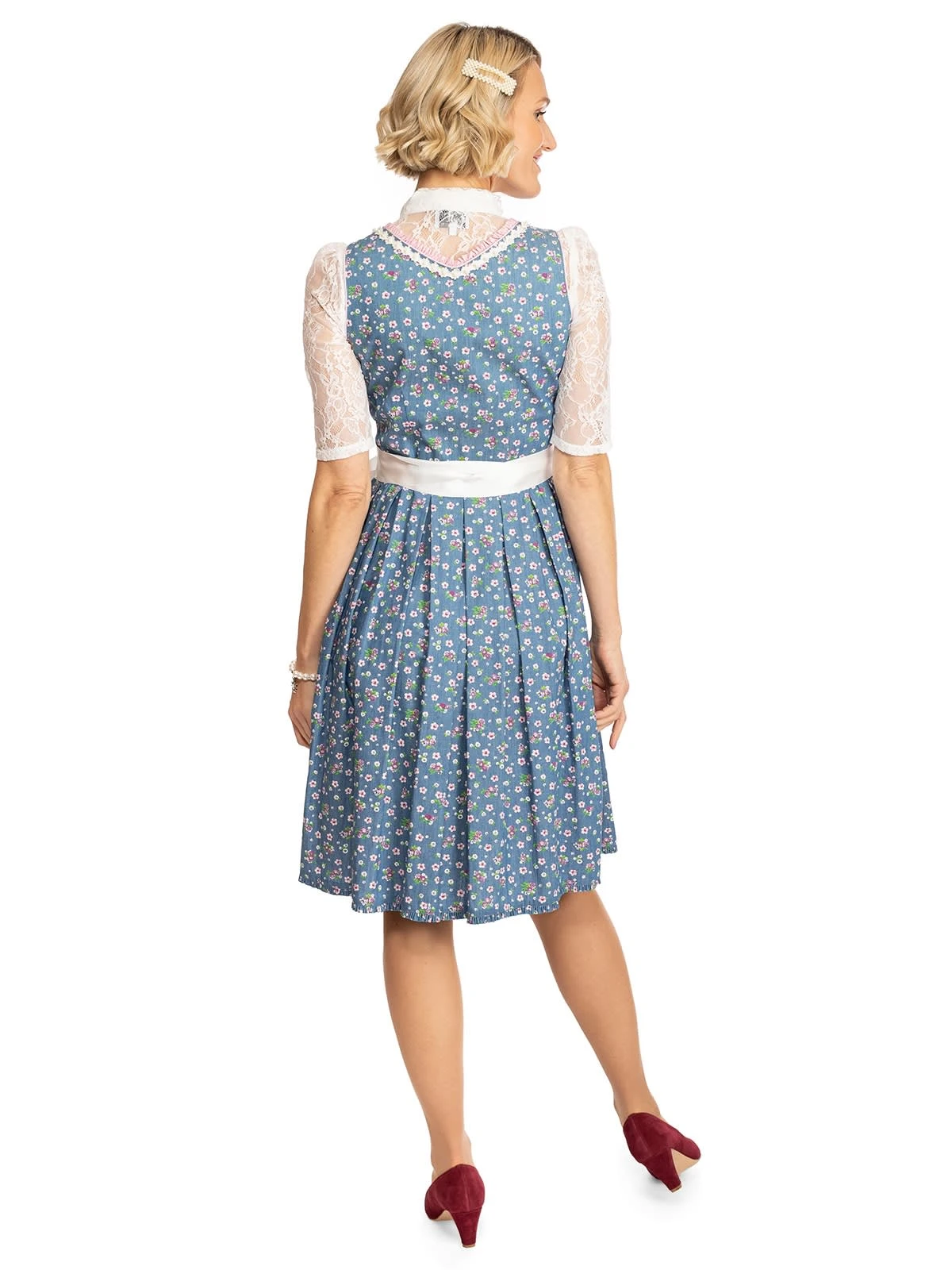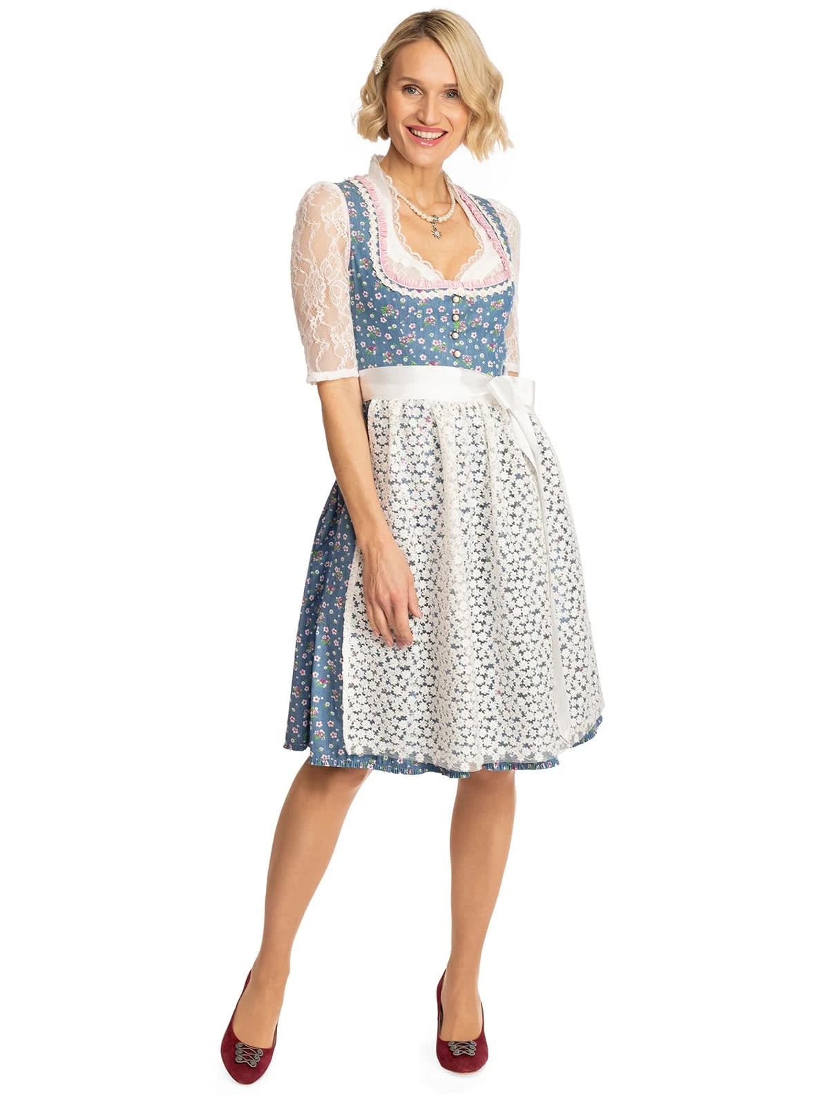 Zweiteiliges Midi-Dirndl Uta in frischem Blau. 60 Zentimeter lang ist dieses frühlingshaft-sommerliche Dirndl der Marke Alpenfee. Der himmelblaue Oberstoff aus Baumwolle ist mit einem niedlichen Blümchenmuster versehen. Das weit ausgeschnittene Mieder verfügt über einen attraktiven Knopfverschluss. Das Besondere an dem Dirndl ist die transparente Schürze, die sich aus vielen aneinandergereihten weißen Blüten zusammensetzt. Dieses frisch-fröhliche Modell eignet sich für Ausflüge, traditionelle Feste und Umzüge sowie für berufliche Anlässe.•Hinweis: Angebot ohne Dirndlbluse. •Dieses Dirndl fällt größengerecht aus. •Oberstoff und Rock 100% Baumwolle, Futter 50% Baumwolle 50% Polyester, Schürze 77% Polyester 15% Pol •Rocklänge ca. 60cm •Chemische Reinigung