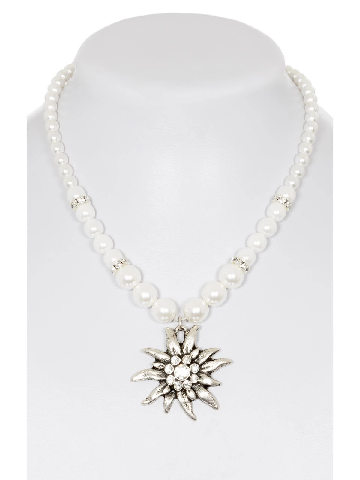 Auffällige Wachsperlenkette mit großem Edelweiß-Anhänger. Mit dieser Wachsperlenkette aus unserem Onlineshop lässt sich jedes Dirndl um einen auffälligen Hingucker bereichern. Die 41 bis 47 cm lange Kette ist aus weißen Wachsperlen und Elementen aus Strass gefertigt. Der dekorative Edelweiß-Anhänger zieht sowohl im Alltag als auch bei Festlichkeiten alle Blicke auf sich.•Trachtenketten •Wachsperlenkette •Alpenwahn