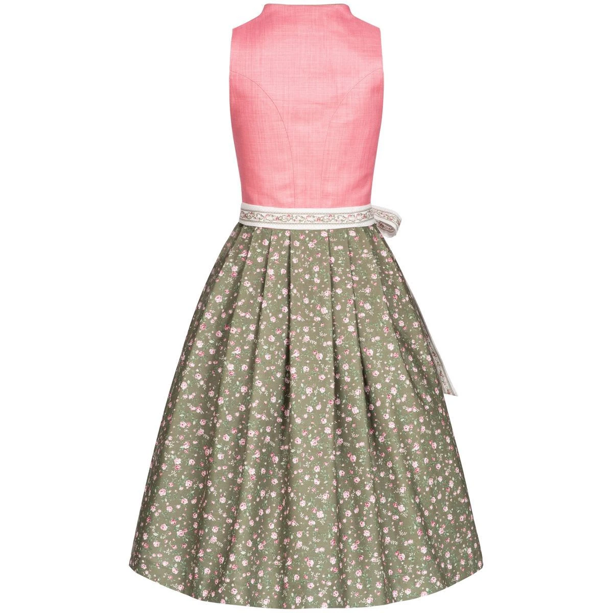Ein bezauberndes Midi Dirndl in Rosa von Berwin und Wolff. Das Dirndl hat einen eleganten Stehkragen, der zu einem Herz-Ausschnitt übergeht. Das Mieder aus Leinen wurde schlicht gehalten. Den grünen Dirndlrock hingegen schmückt ein schönes florales Muster. Die weiße Schürze mit einem Blumenrankenmuster, ergänzt das tolle Gesamtbild. Das Dirndl wird mit einer schlichten Knopfleiste auf der Vorderseite verschlossen. Der Dirndlrock hat eine Länge von 70cm und besitzt zwei praktische Einschubtaschen.