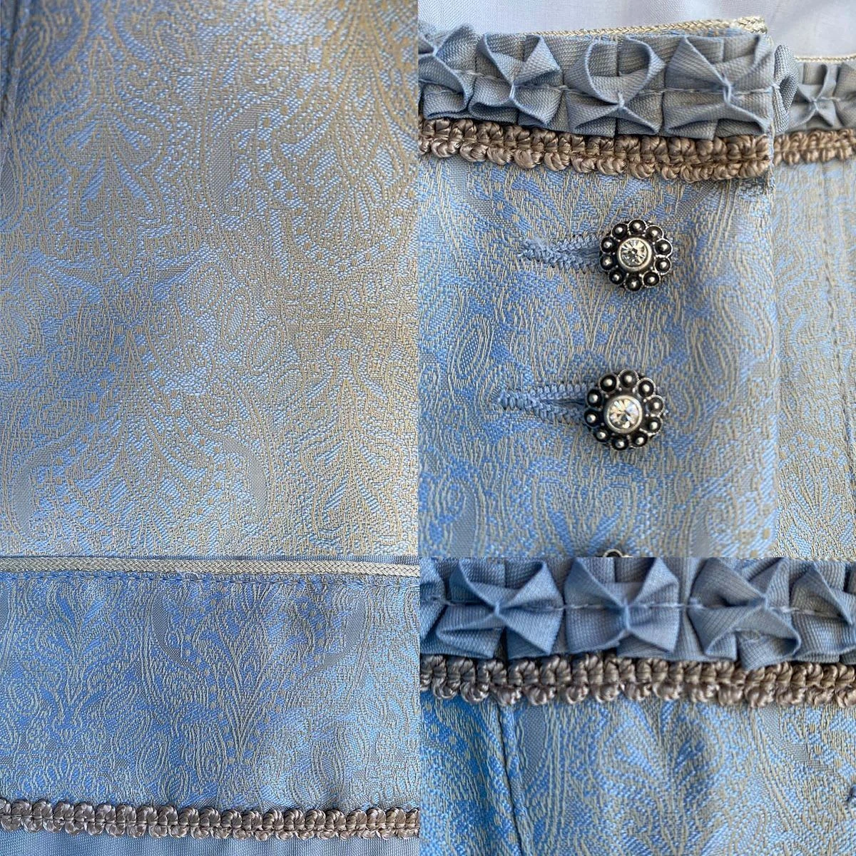 Ein tolles Midi Dirndl Sandra in Hellblau von Country Line. Das komplette Dirndlkleid erstreckt sich in einem tollen Hellblau Farbton. Durch den Balkonett Ausschnitt, der mit einer hübschen Borte verziert wurde, wird das Dirndl zu etwas Besonderem. Das Dirndl lässt sich Knöpfen. Das Dirndl ist eher etwas für einen klassischen Abend ohne auszufallen. Der Grundstoff ist floral akzentuiert. Der Dirndlrock misst eine Länge von 70 cm.