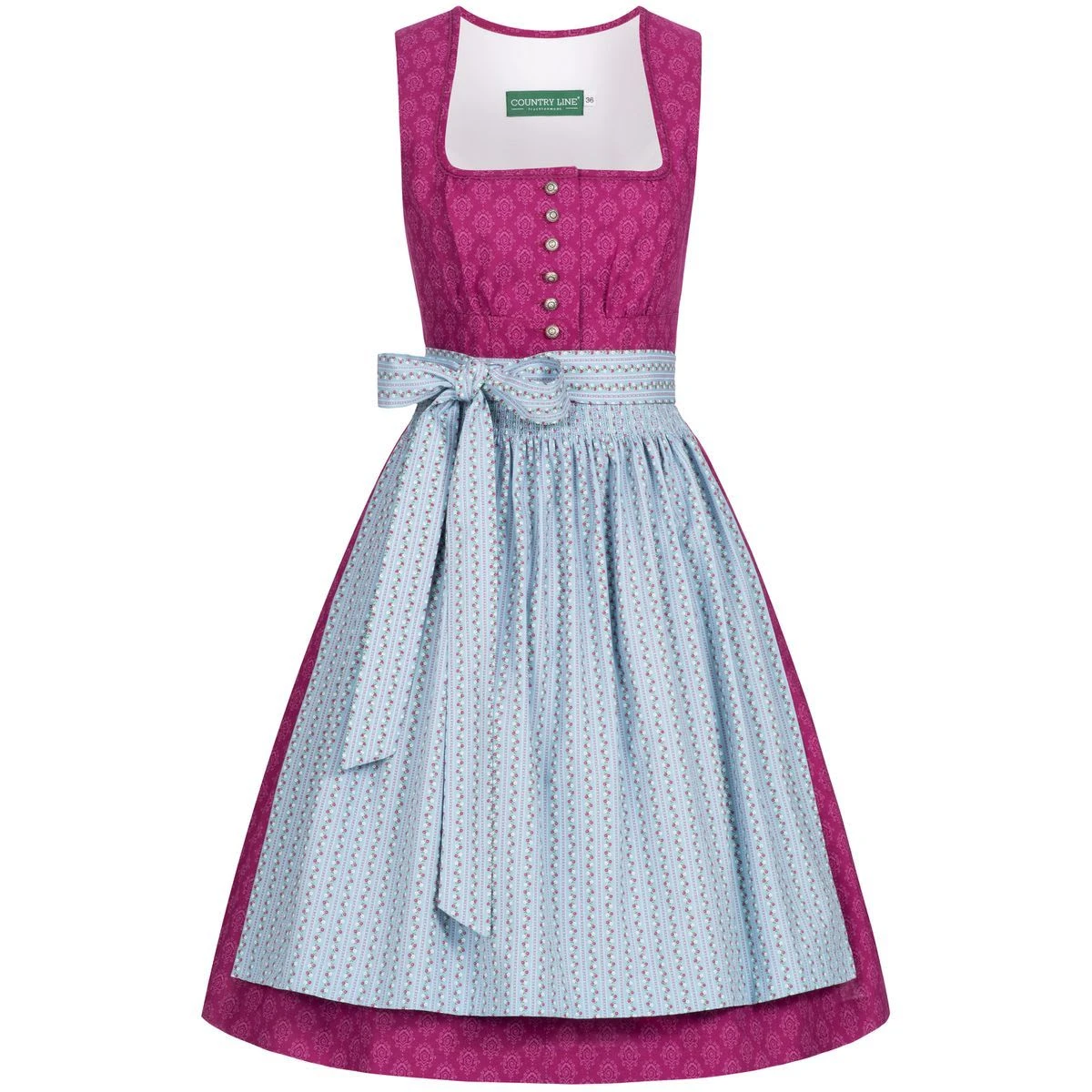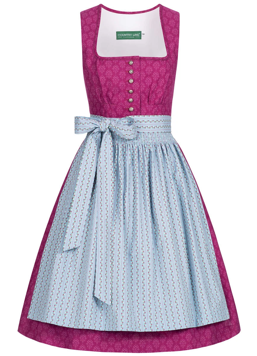 Ein reizendes Midi Dirndl Cindy in Pink von Country Line. Das komplette Dirndlkleid erstreckt sich in einem weißen Ornamentmuster. Die hellblaue Schürze mit floralen Muster, harmoniert perfekt zum Dirndl und sorgt somit für ein tolles Gesamtbild. Das Dirndl lässt sich mit einer Knopfleiste auf der Vorderseite verschließen. Der Balkonett Ausschnitt zaubert ein hübsches Dekolleté. Der Dirndlrock misst eine Länge von 60cm.