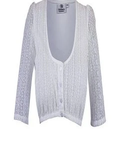 Elegant zurückhaltend ist unsere schicke Dirndlbluse Kassandra aus einem Spitzenstoff, der von traditionellen Blumenranken geschmückt wird. Sie wird mit schillernden Knöpfen in Perlmutt-Optik geschlossen. Die anliegenden Ärmel sind 3/4 lang und wurden an der Schulterpartie ganz leicht gerafft. Die Dirndlbluse erhält somit ganz leichte Puffärmel, die jedoch nicht auftragen