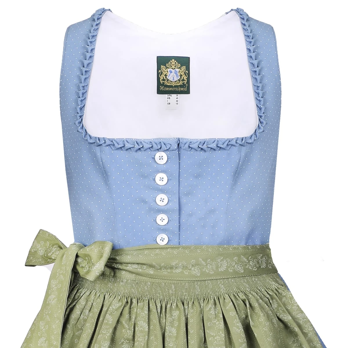 – Das Dirndl von Hammerschmid hat eine Länge von 70 cm. Das Drindl lässt sich mit einer hübschen Knopfleiste auf der Vorderseite schließen.