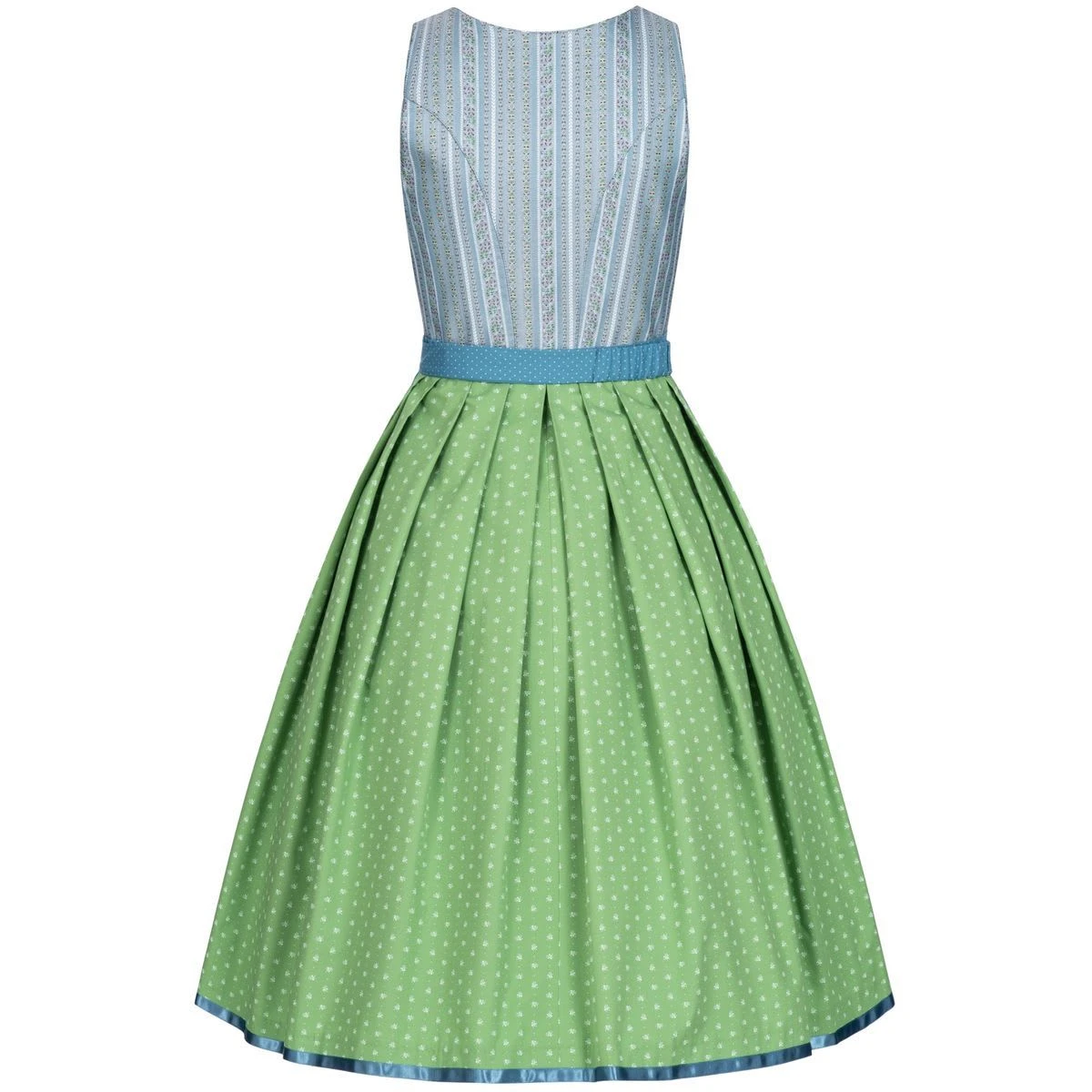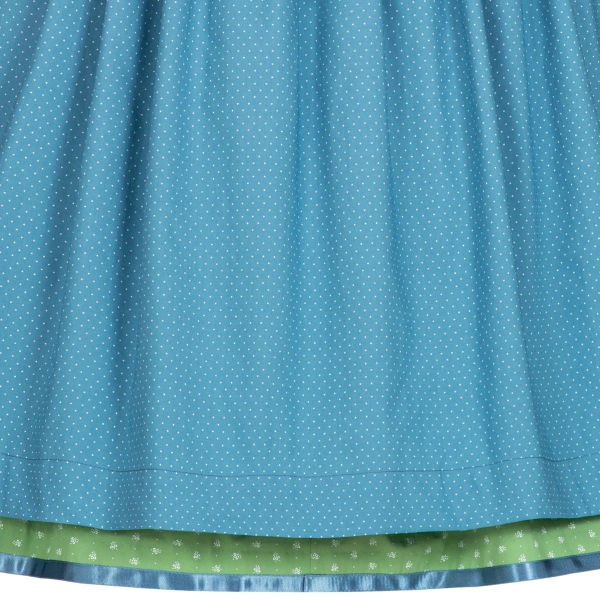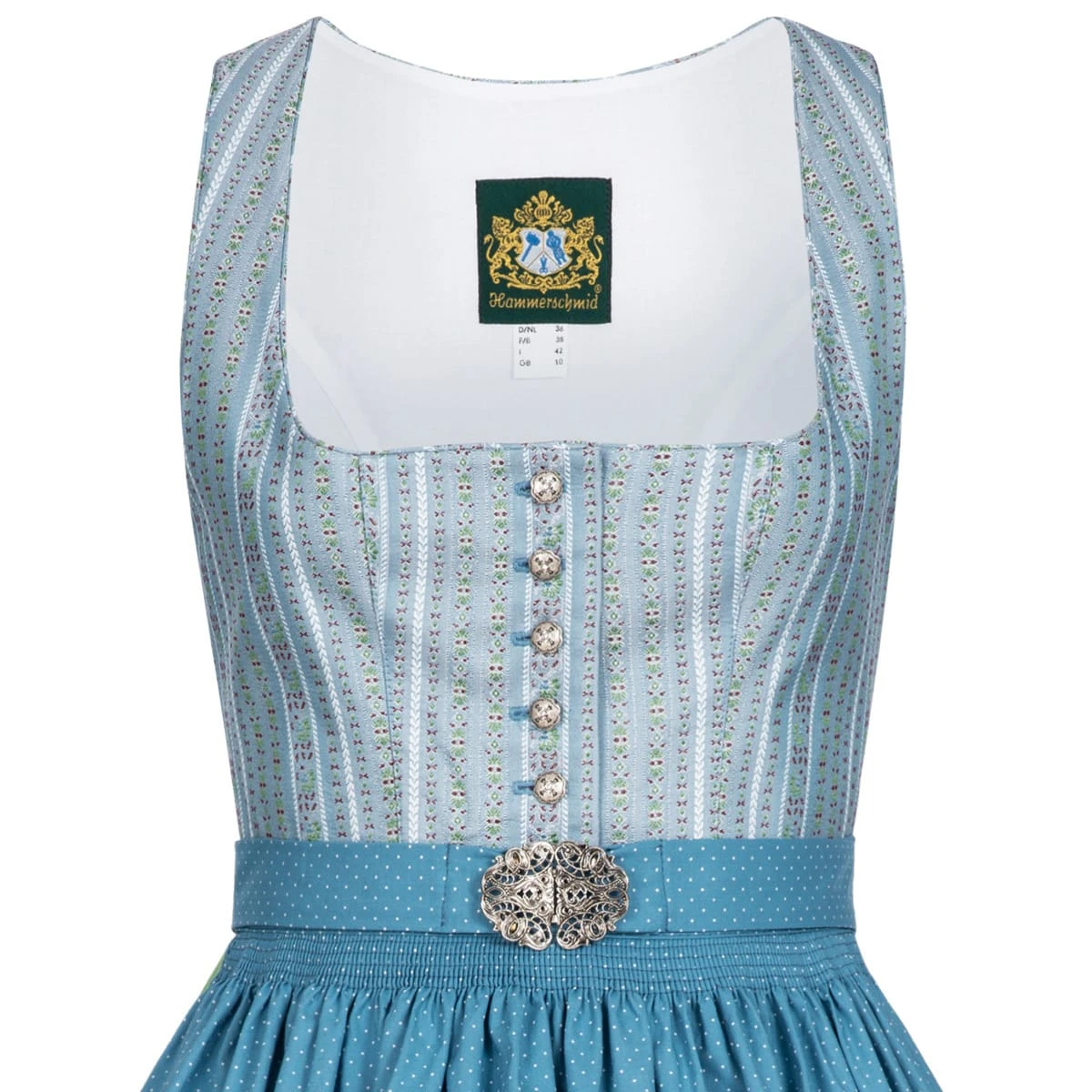 Ein Midi Dirndl Pillersee in Blau von der Marke Hammerschmid. Sehr schön zeigt sich das Modell Pillersee mit einem gestreiften Mieder, welches mit hübschen Knöpfen zu öffnen ist. Der Balkonett Ausschnitt zaubert das perfekte Dekolleté. Der grüne Trachtenrock ist in einem Trachtenmuster gestaltet. Passend dazu ist die blaue Schürze mit weißen Punkten versehen, die auf der Vorderseite mit einer Brosche zu schließen ist. Dieses Dirndl hat eine Rocklänge von 70 cm.