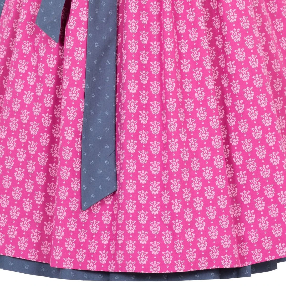 – Das Mieder zeigt sich in schlichtem Grau mit dezentem Punktemuster und einer edlen Knopfleiste. Das Dirndl wird perfekt durch einen blauen Rock mit elegantem Blumenmuster und lila Schürze ergänzt. Der Trachtenrock misst eine Länge von 70cm.