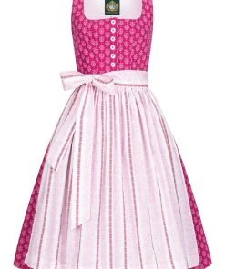 Ein Midi Dirndl Chiemsee in Pink von der Marke Hammerschmid. Sehr schön zeigt sich das Modell Chiemsee mit einem traditionellen Mieder, welches mit hübschen Knöpfen zu öffnen ist. Das Dekolleté am gemusterten Mieder ist mit einer schlichten Paspel versehen. Das pinkfarbene Dirndl ist mit einem edlen Ornamentmuster gestaltet. Passend dazu ist die helle Schürze mit zweifarbigen Streifenmuster, die auf der Vorderseite mit einem Band zu schließen ist. Dieses Dirndl hat eine Rocklänge von 70 cm.