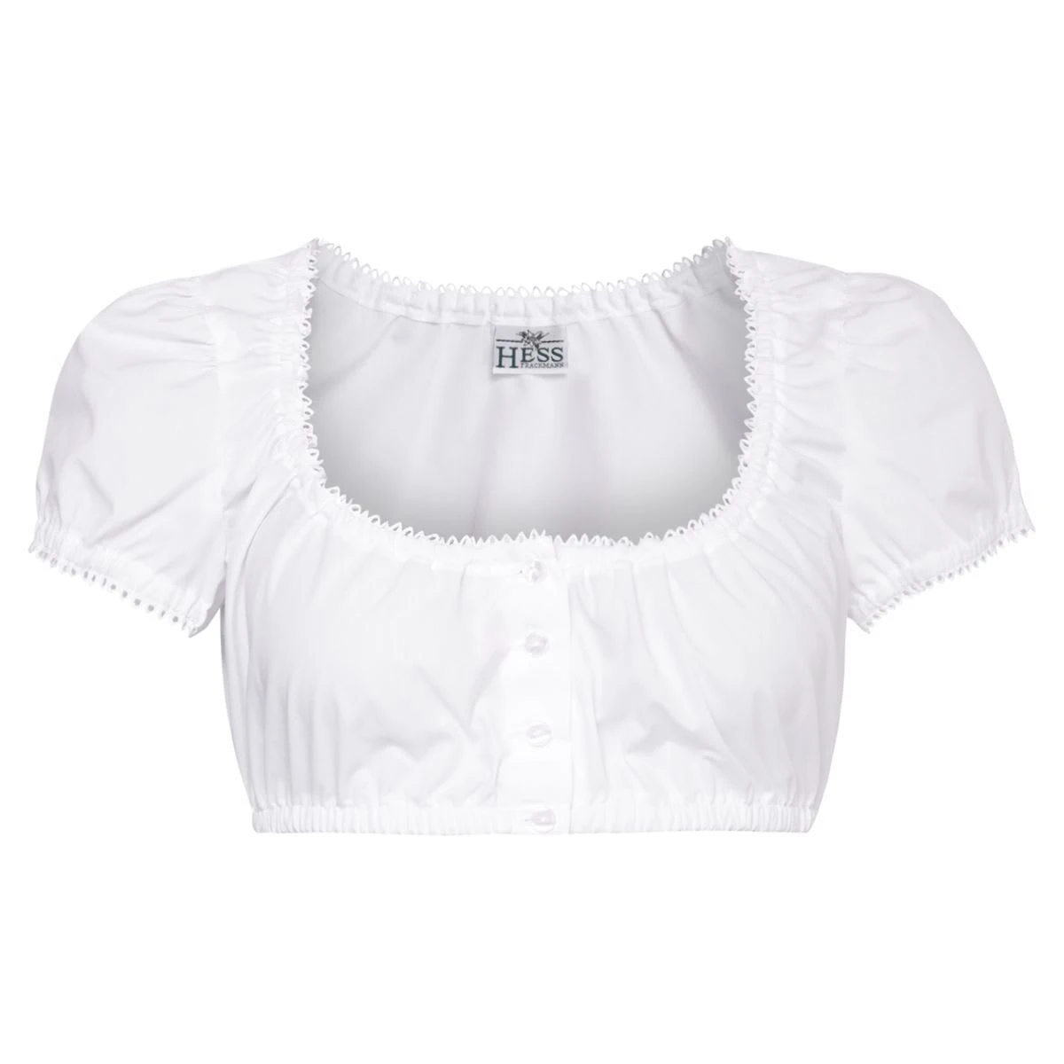 Eine bezaubernde Dirndlbluse Elisabeth in Weiß von Hess. Bei dieser Dirndlbluse handelt es sich um die Bluse, welche auch dem offiziellen Paulanerdirndl zugehörig ist. Am Ausschnitt entlang zieht sich eine edle Mäusezahnborte, die man an den Ärmeln wiederfindet. Die Dirndlbluse ist zu 65% Polyester und zu 35% aus Baumwolle gefertigt. Die Marke Hess produziert ausnahmslos höchste Qualität.Zur Wiesn brauchen Sie die passende Dirndlbluse. Bitte achten Sie darauf das die Dirndlbluse zu Ihrem Dirndlausschnitt passt. An dieser Stelle können wir Ihnen folgende Dirndlblusen Hilfestellung geben: Es gibt den Balkonettausschnitt, den eckigen Balkonettausschnitt und den Herzausschnitt sowie den Unterbrustausschnitt und V-Ausshnitt. der tiefest Ausschnitt ist der Unterbrustausschnitt, bei diesem gewähren Sie den meisten Einblick. Im Anschluss kommt der Herzausschnitt, dieser ich leicht zu erkenne, da die Aschnittform wie ein Herz aussieht welches auf dem Kopf steht. Der Balkonettauschnitt ist am Dirndl sehr gut zu erkennen, weil der Ausschnitte gerade von links nach rechts verläuft. Der eckige Balkonett-Auschnitt am Dirndl als auch der Dirndlbluse ist ein 90 Grad Winkel. Der Stehkragen oder auch Schalkragen (Schneewittchenkragen) orientiert sich nur am Kragen. Und passt auch nur zu den Dirndln die ebenfalls einen Stehtkragen haben. Der V-Asuschnitt ist die eleganteste Variante an einer Dirndlbluse. Außerdem sollten Sie darauf achten welche Armlänge ihre Dirndbluse haben sollte. Ein langarm Dirndbluse kann bei kühlerem Wetter sehr warm sein und edel sieht die Dirndbluse auch noch aus. Für ein schönes Dekoltee mit der Dirndlbluse sollten Sie sich eventuell auch einen DirndBH zulegen. Wir können Ihnen den Dirndl Push-UP BH in Weiß von My Choice empfehlen. Dieses Modell ist ein Wundermittel für Ihre Dirndlbluse mit Dirndl. Bei großer BH Größe und ohne Push Wirkung haben wir seit Jahren sehr gute Erfahrung mit dem Modell Hammerschmid Dirndl BH in weiß oder Hammerschmid Dirndl BH Annemarie in weiß. Unsere BH´s sind eine reine Empfehlung.