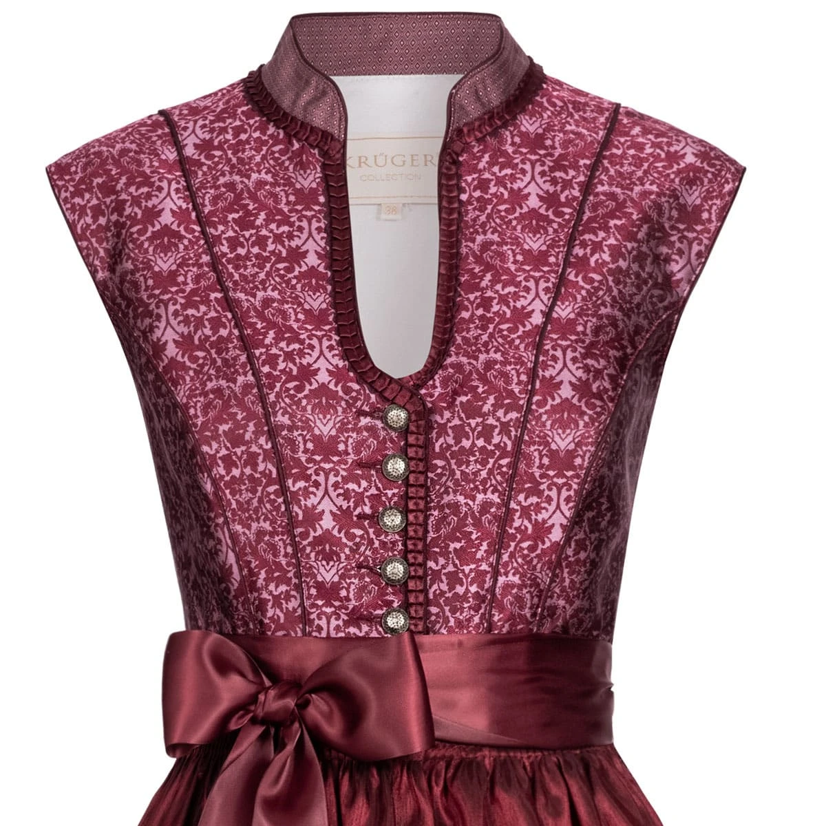 – Auf der Suche nach einem Damen Dirndl in Bordeaux von der Marke Krüger Collection. Haben wir dieses Modell mit elegantem Stehkragen und Knopfleiste. Das Dirndl schmückt sich komplett mit einem hübschen Muster.