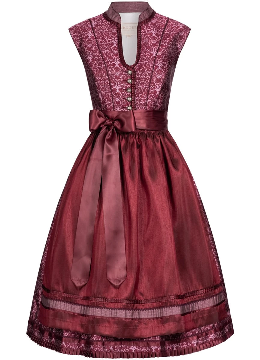 Ein hübsches Midi Dirndl Astrid in Bordeaux von Krüger Collection. Das komplette Dirndlkleid ist mit einem hübschen Muster verziert. Der Kragen und V-Ausschnitt zieren sich mit einer Zierborten. Ebenso am Saumabschluss ist eine schlichte Zierborte. Durch die Knopfleiste auf der Vorderseite wird das Dirndl verschlossen. Die schlichte Schürze wird mit Zierborten geschmückt. Der Rock misst eine Länge von 70 cm und besitzt zwei praktische Einschubtaschen. Dieses besondere Modell besitzt eine überschnittene Schulter und kann somit auch ohne Bluse getragen werden.