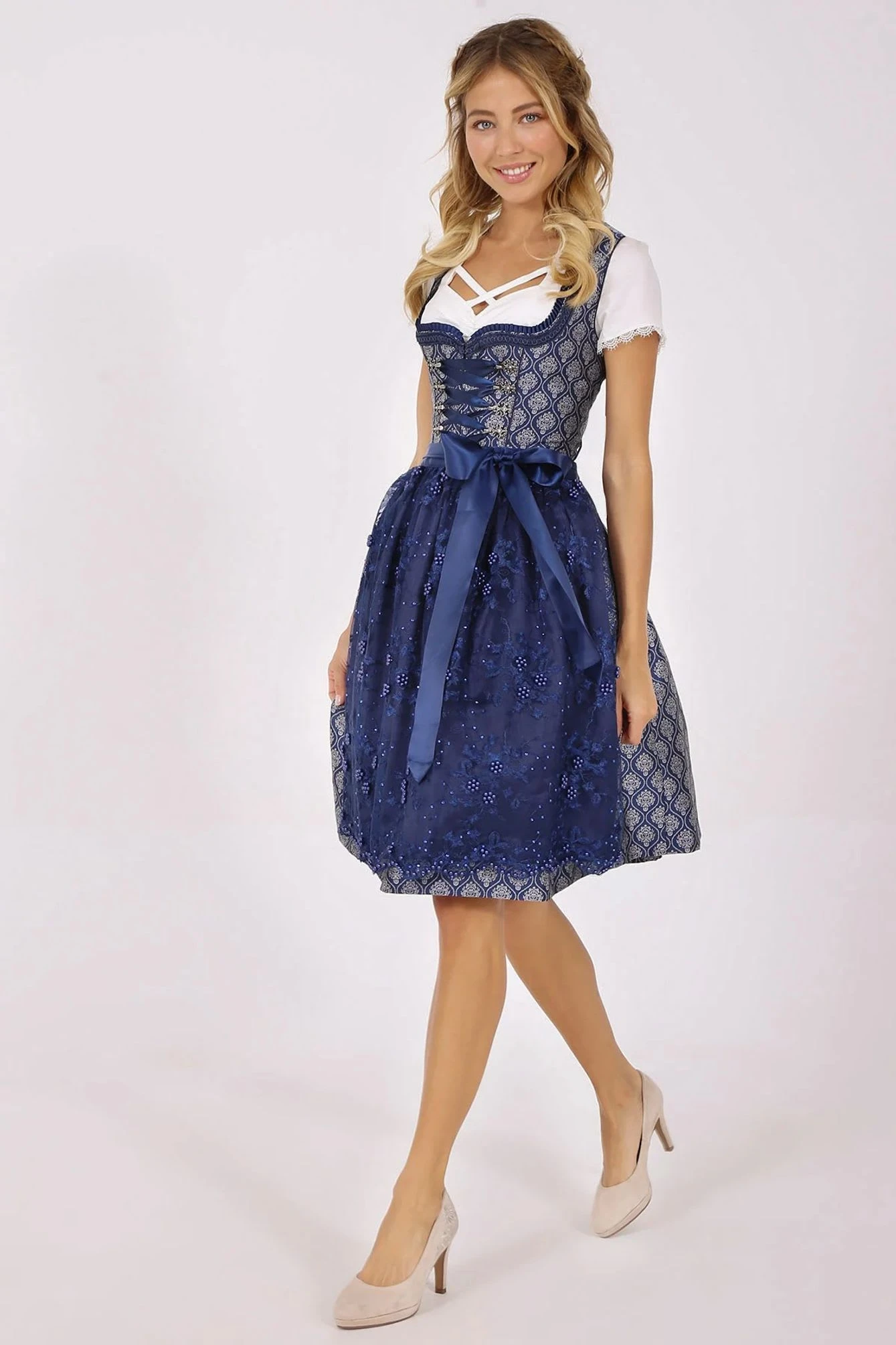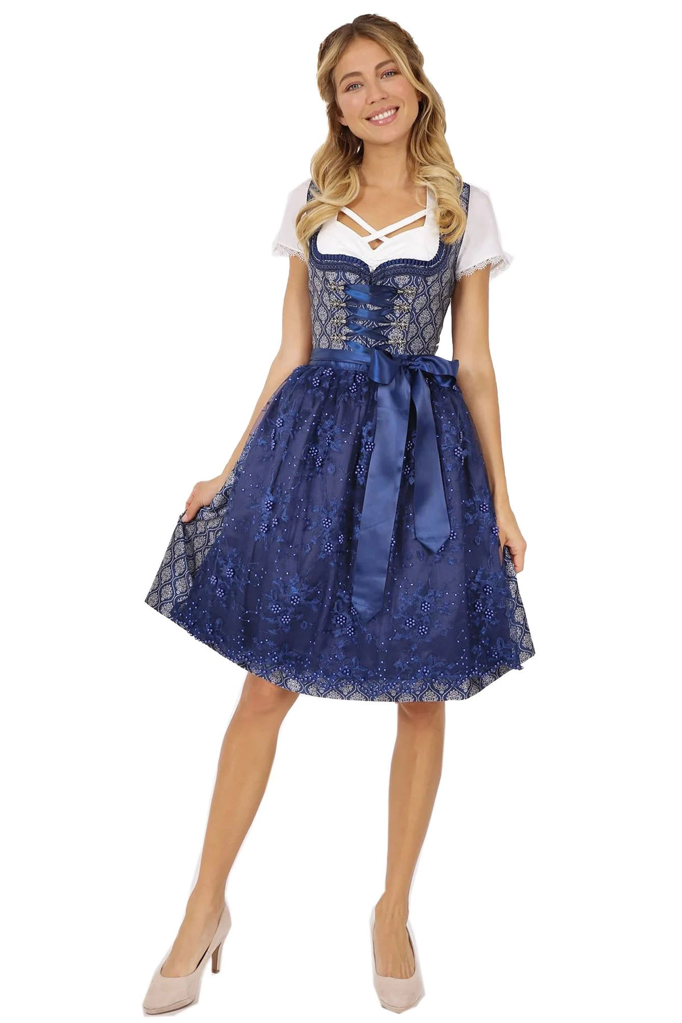 Wunderschönes Dirndl. Das Dirndl Freya verfügt über eine aufwendige Perlenschürze. Eine detailreiche Borte schmückt das Dekolleté.