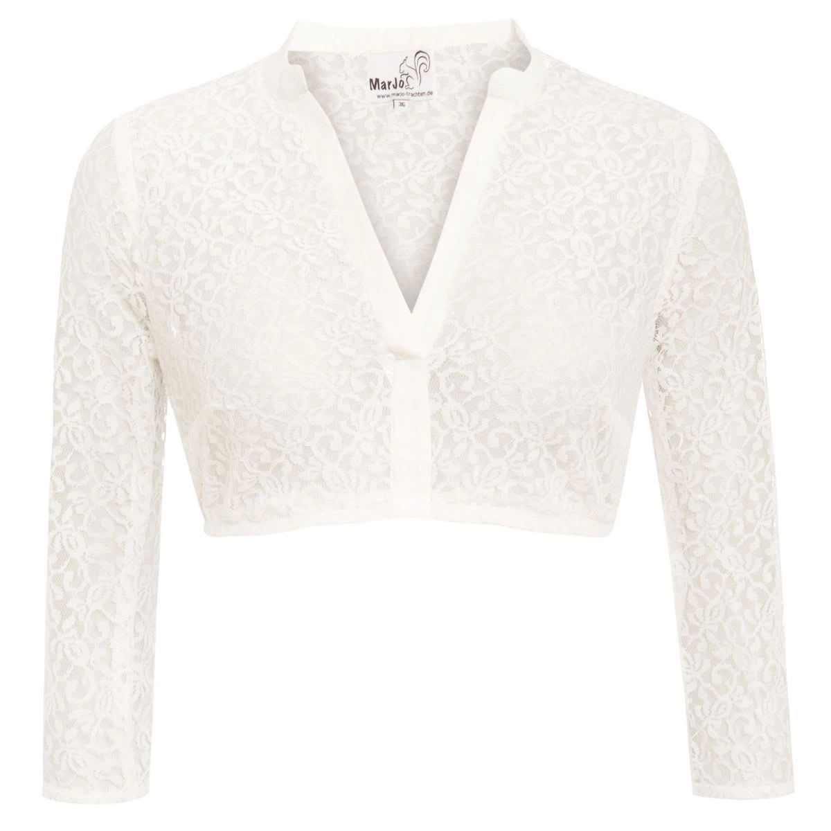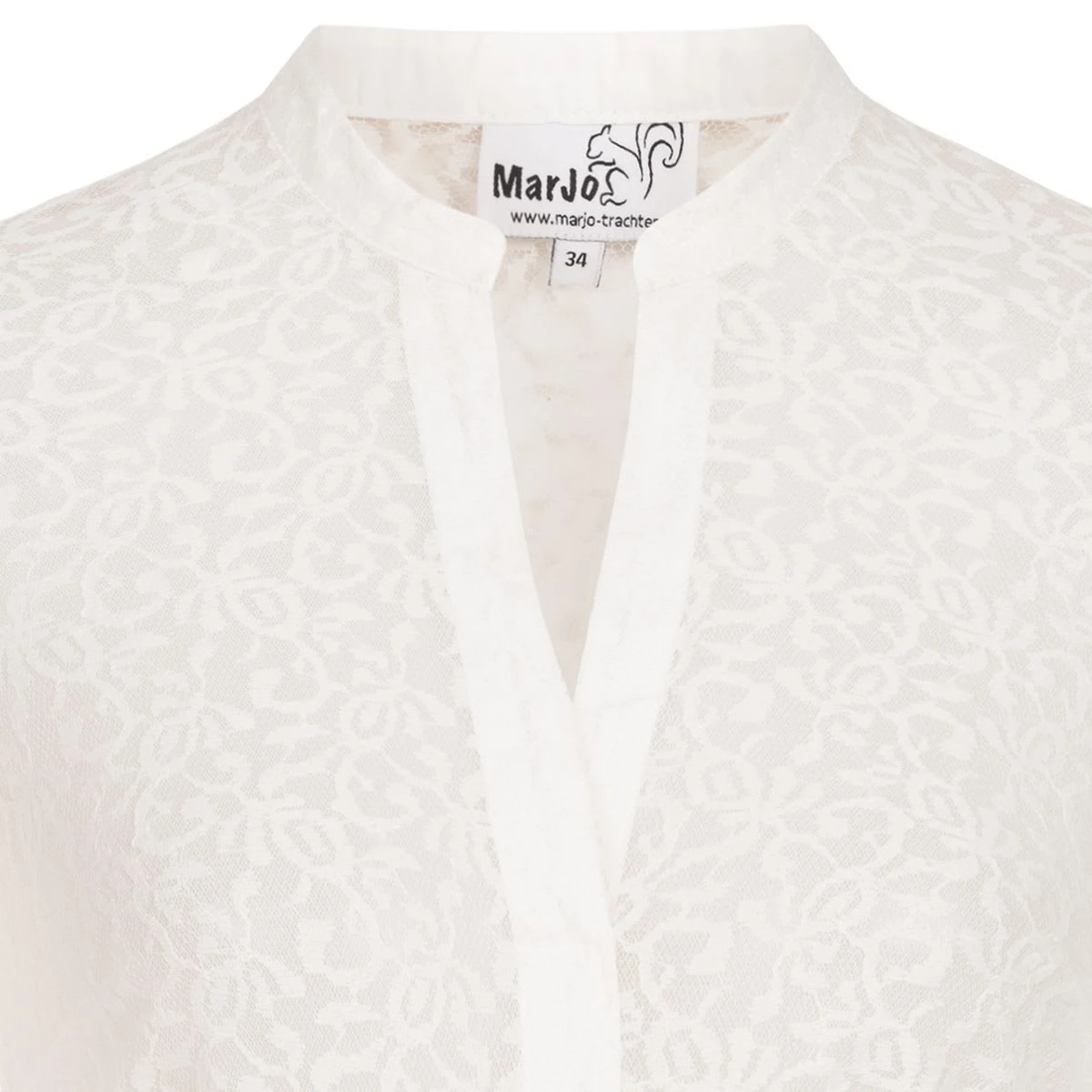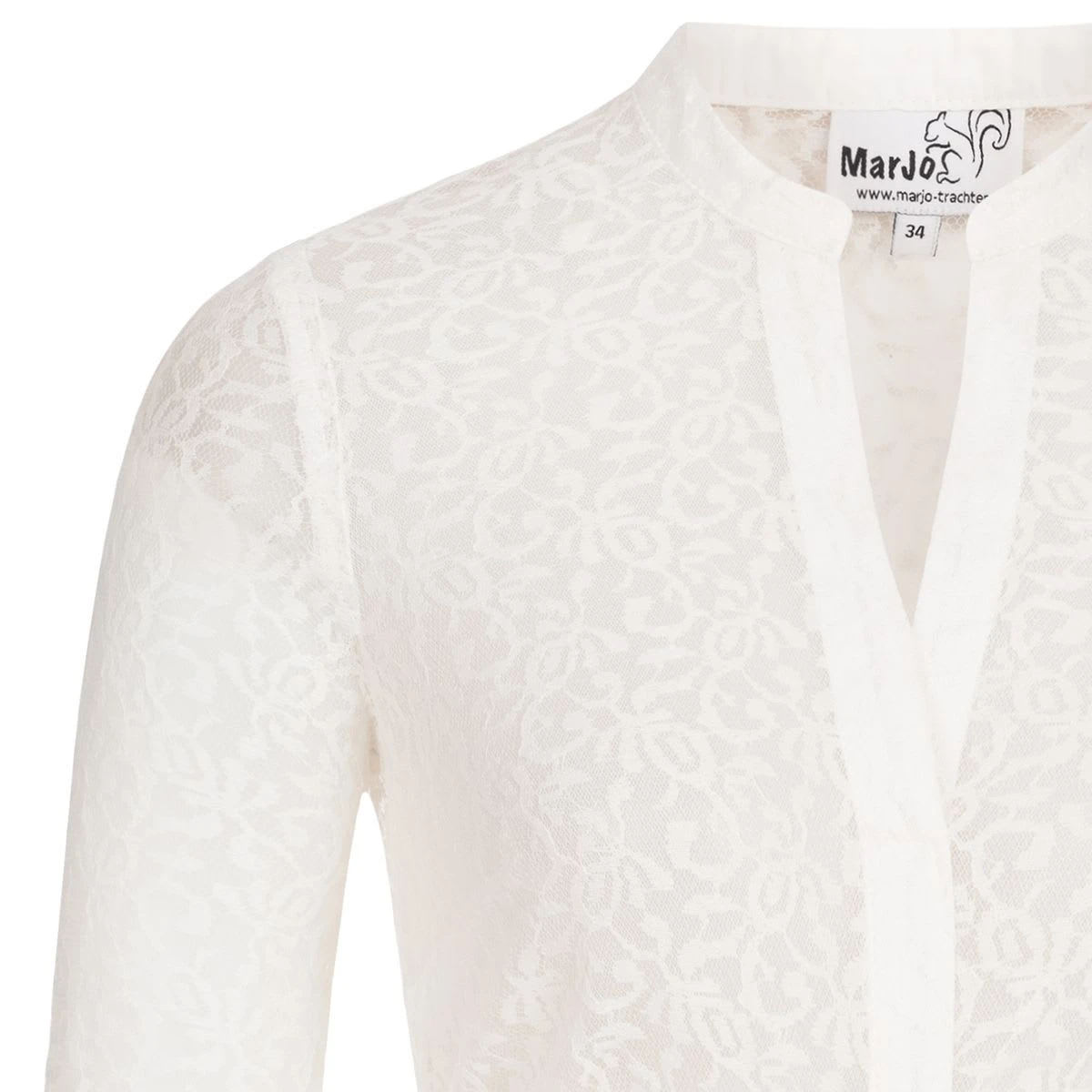 Eine bezaubernde Dirndlbluse Dilana Linda mit Kragen in Weiß von der Firma Marjo Trachten. Die Bluse mit V-Ausschnitt ist durchgehend mit transparenter Spitze in floralem Muster verarbeitet. Das Modell mit dreiviertellangen Ärmeln ist besonders vorteilhaft geschnitten. Durch das elastische Unterbrustband ist die Bluse besonders angenehm zu tragen. Die Dirndlbluse passt perfekt zum hochgeschlossenen Dirndl oder zum Dirndl mit Balkonett-Ausschnitt. Mit Spitzenblusen liegen Sie momentan voll im Trend! Die Dirndl Bluse Dilana Linda in Weiß aus angesagter Spitze kann problemlos zu ihrem neuen Oktoberfest Dirndl kombiniert werden. Denn Spitzenblusen zählen dieses Jahr absolut zu den Mega Modetrends! Diese Bluse passt also hervorragend zu jedem Wiesn Dirndl gekonnt. Das Dirndl, welches Sie sich dazu ausgesucht haben, kann gerne ein kurzes oder langes Dirndl, ein etwas schlichteres Dirndl aus Baumwolle, ein schwarzes Dirndl, ein Buntes, oder auch ein weißes Dirndl sein. Da haben Sie die Wahl und können frei nach ihrem Geschmack ihren persönlichen Favoriten unten den Dirndl für Damen wählen. Die verlängerten Spitzenärmel dieser Dirndl Bluse wirken besonders gekonnt kombiniert zum hochgeschlossenen Dirndl Damen. Aber durch die schicke Spitze am Dekolleté ist das Modell auch in Kombination mit einem Damen Trachten Dirndl mit Balkonett-Ausschnitt durchaus stimmig! Auch traditionelle Dirndl passen wunderbar zu dieser Dirndl Bluse Spitze. Was das Thema Schmuck für Dirndl betrifft, so können Sie zu dieser Bluse gerne eine feine Trachtenkette tragen, dann noch hübsche Ohrringe dazu un der Look ist komplett. Die weiße Dirndlbluse Diana Linda von Marjo Trachten ist auf jeden Fall eine große Bereicherung für ihr neues Dirndl Kleid, auch für ihr traditionelles Dirndl.