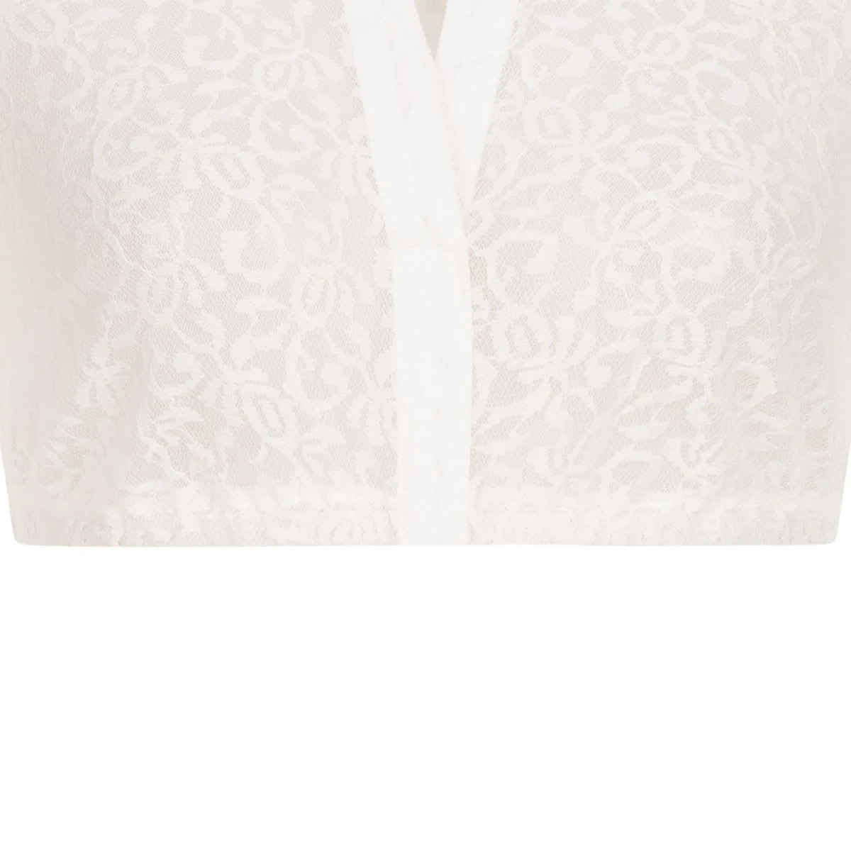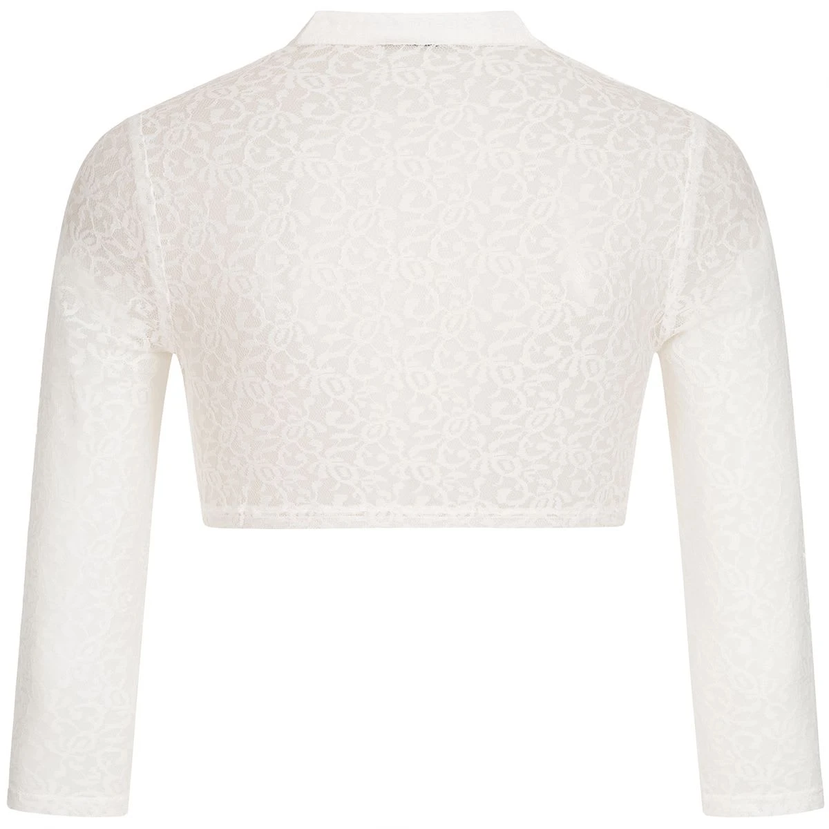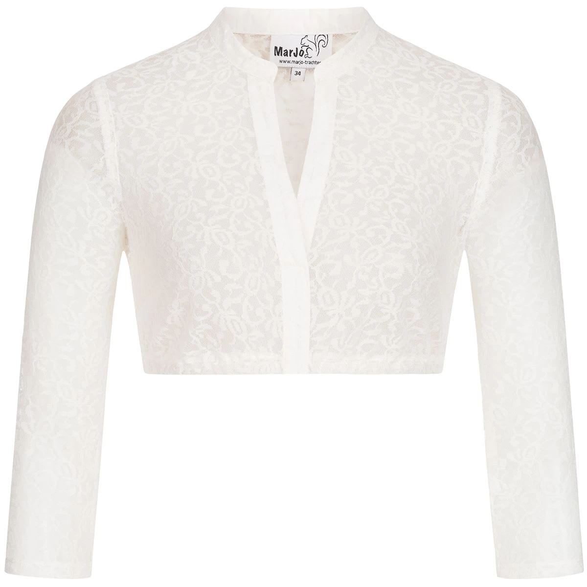 Eine bezaubernde Dirndlbluse Dilana Linda mit Kragen in Weiß von der Firma Marjo Trachten. Die Bluse mit V-Ausschnitt ist durchgehend mit transparenter Spitze in floralem Muster verarbeitet. Das Modell mit dreiviertellangen Ärmeln ist besonders vorteilhaft geschnitten. Durch das elastische Unterbrustband ist die Bluse besonders angenehm zu tragen. Die Dirndlbluse passt perfekt zum hochgeschlossenen Dirndl oder zum Dirndl mit Balkonett-Ausschnitt. Mit Spitzenblusen liegen Sie momentan voll im Trend! Die Dirndl Bluse Dilana Linda in Weiß aus angesagter Spitze kann problemlos zu ihrem neuen Oktoberfest Dirndl kombiniert werden. Denn Spitzenblusen zählen dieses Jahr absolut zu den Mega Modetrends! Diese Bluse passt also hervorragend zu jedem Wiesn Dirndl gekonnt. Das Dirndl, welches Sie sich dazu ausgesucht haben, kann gerne ein kurzes oder langes Dirndl, ein etwas schlichteres Dirndl aus Baumwolle, ein schwarzes Dirndl, ein Buntes, oder auch ein weißes Dirndl sein. Da haben Sie die Wahl und können frei nach ihrem Geschmack ihren persönlichen Favoriten unten den Dirndl für Damen wählen. Die verlängerten Spitzenärmel dieser Dirndl Bluse wirken besonders gekonnt kombiniert zum hochgeschlossenen Dirndl Damen. Aber durch die schicke Spitze am Dekolleté ist das Modell auch in Kombination mit einem Damen Trachten Dirndl mit Balkonett-Ausschnitt durchaus stimmig! Auch traditionelle Dirndl passen wunderbar zu dieser Dirndl Bluse Spitze. Was das Thema Schmuck für Dirndl betrifft, so können Sie zu dieser Bluse gerne eine feine Trachtenkette tragen, dann noch hübsche Ohrringe dazu un der Look ist komplett. Die weiße Dirndlbluse Diana Linda von Marjo Trachten ist auf jeden Fall eine große Bereicherung für ihr neues Dirndl Kleid, auch für ihr traditionelles Dirndl.