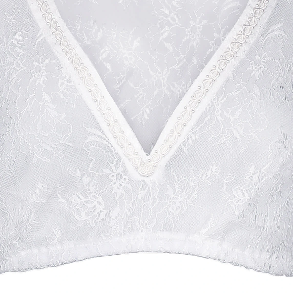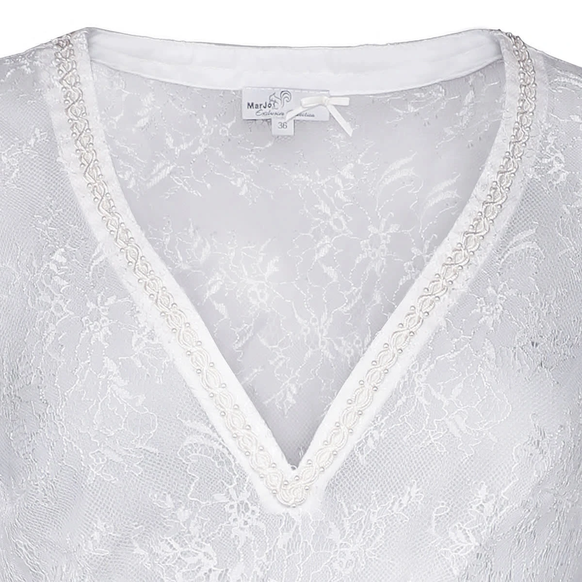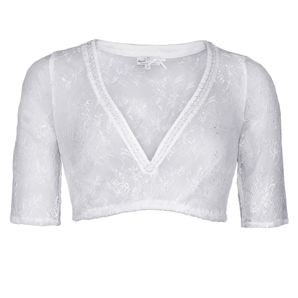 Eine bezaubernde Dirndlbluse Ciara-Vida in Weiß von der Marke Marjo Trachten. Die Dirndlbluse ist ringsum mit sehr hübschen Spitzen versehen. Sie ist dadurch transparent und luftig, leicht zu tragen. Der V-Ausschnitt ist sehr schlicht und dezent gehalten und mit eleganter perlenbesetzter Borte geschmückt.