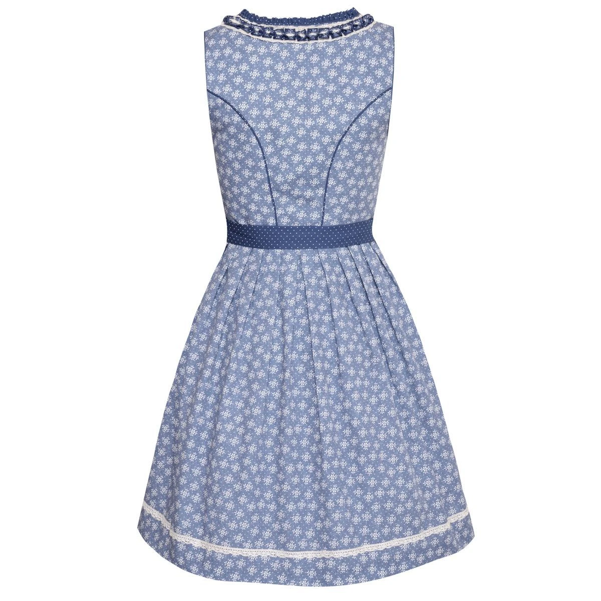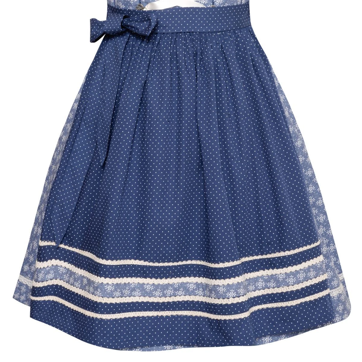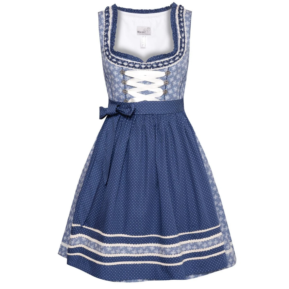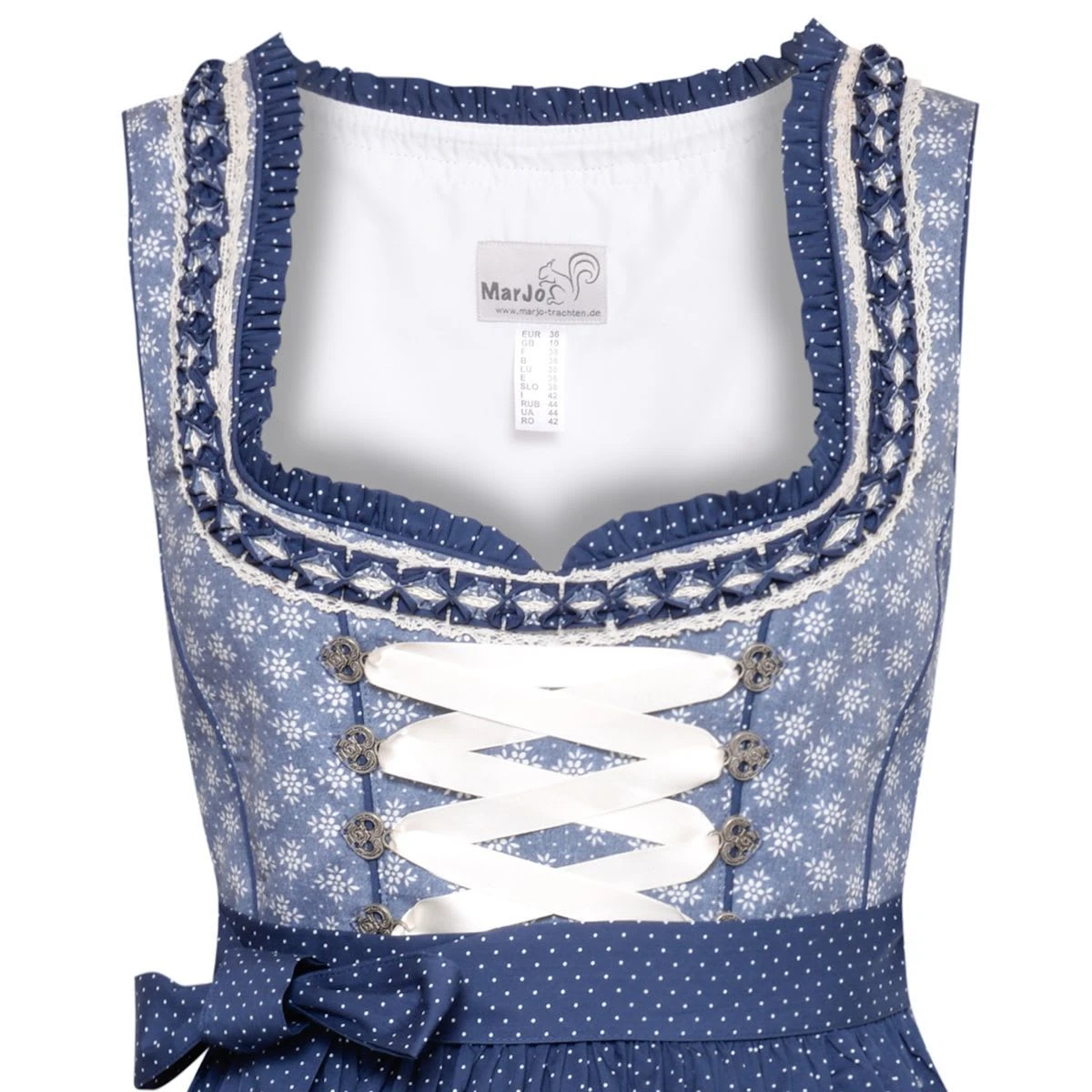 Ein bezauberndes mini Dirndl Birgit in Blau von Marjo Trachten. Das gesamte Kleid ist mit einem wunderschönen Blumenmuster in Weiß versehen. Am Ausschnitt entlang ziehen sich sich verschiedene Borten und Spitzen. Diese bringen Ihre Vorzüge schön zur Geltung. Die Haken für die Schnürung sind in der Form eines Herzens. Darin können Sie das helle Satinband ganz nach Belieben schnüren. Die Schürze mit den kleinen weißen Polka- Dots und der aufwendigen Bordüre, lässt Ihr Dirndl zusätzlich toll feminin wirken. Der Trachtenrock misst eine Länge von 55 Zentimetern.Hinweis zur Abbildung: Sofern nicht anders beschrieben, werden unsere Dirndl ohne Dirndlbluse geliefert. Dirndl und Bluse können Sie bei uns in verschiedenen Größen bestellen, so passt die Tracht perfekt. Unser Tipp: Variieren Sie z. B. zwischen weißen und schwarzen Dirndlblusen, viele unserer Dirndl können mit beiden Farben und verschiedenen Dirndlblusen (z. B. Langarmbluse, Kurzarmbluse) getragen werden. Zudem können fast alle unsere Dirndl für kleines Geld (ca. 15 Euro) beim Schneider angepasst werden wenn es einmal nicht passt. So wird ein wunderschönes Dirndl zu Ihrem perfekt sitzenden Dirndl Unikat! Die Damen Dirndl in blau können unterschieden werden nach Balkonettausschnitt, den eckigen Balkonettausschnitt und den Herzausschnitt sowie den Unterbrustausschnitt und V-Ausshnitt. Wir haben die passenden Dirndblusen Dekoleéformen passend zu Ihrem neuen blauen Dirndl zum Oktoberfest haben. Sollten Sie ein blaues Dirndl kaufen mit Unterbrustschnitt, dann sollten Sie auch eine passende Dirndlbluse bestellen.Ein blaues Dirndl welches keine 100 Euro kostet ist perse kein schlechtes Dirndl. Wir achten auf Marken und Qualität beim Einkaukfen und können Ihnen die Marjo Trachten Dirndl nur empfehlen.
