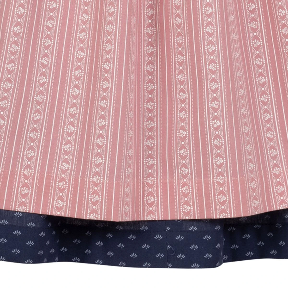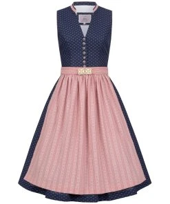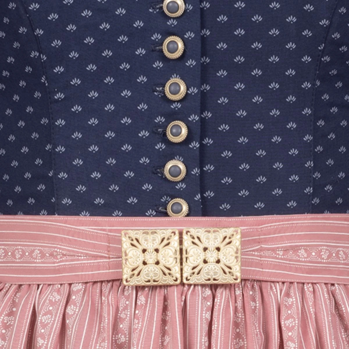 Ein hübsches Midi Dirndl Lisa in Blau von Marjo Trachten. Das Dirndl mit V-Ausschnitt wird auf der Vorderseite mit Knopfleiste verschlossen. Der Kragen und Ausschnitt wurden mit einer hübschen Zierborten geschmückt. Das gesamte Dirndlkleid schmückt sich mit einem Ornament – Muster. Die hübsche Schürze bietet der Trägerin ein klassisches Muster. Der Trachtenrock misst eine Länge von 65cm. Der Oberstoff am Oberteil ist blau mit rosaner Schürze. Der Rock ist blau.