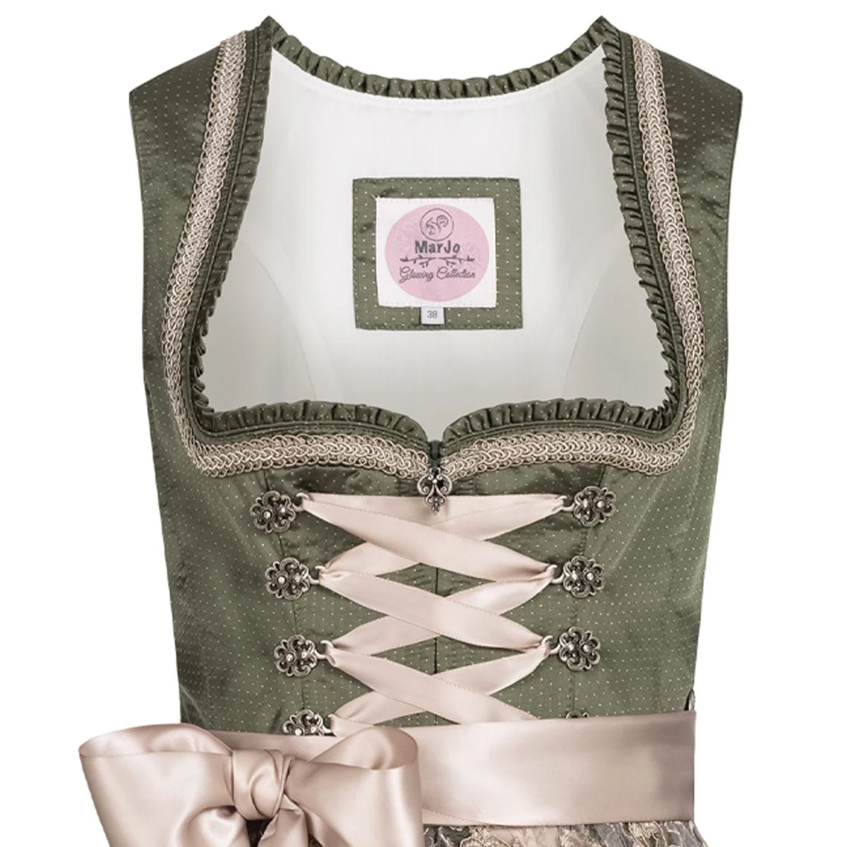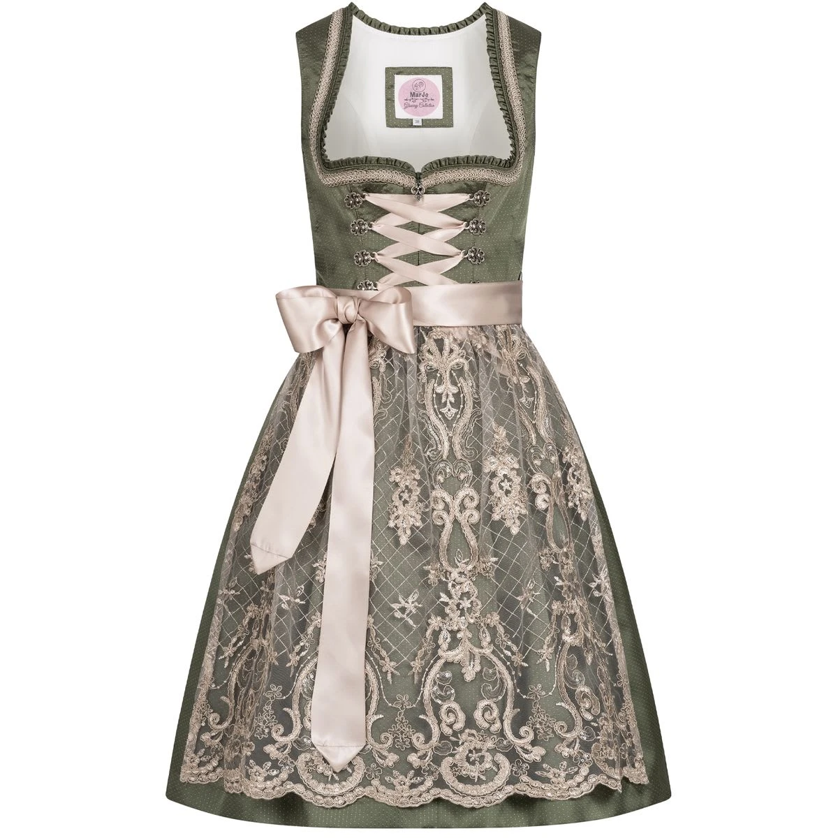 – Midi Dirndl Amira von der Marke Marjo Trachten. Das hübsche Meisterwerk aus Passau zeigt sich verspielt klassisch mit ruhigen Farben.