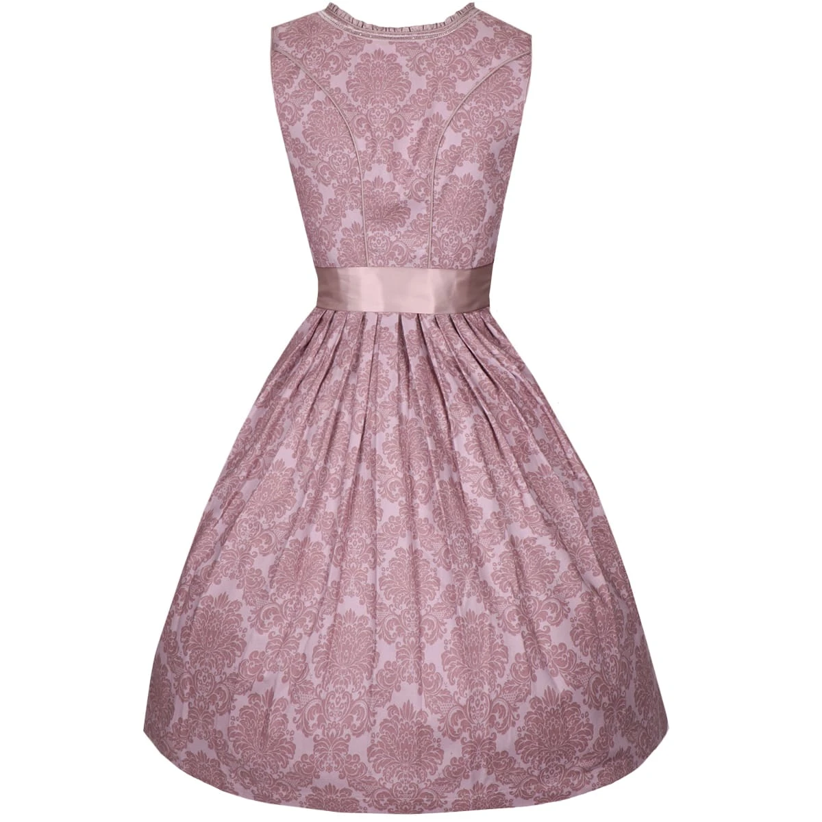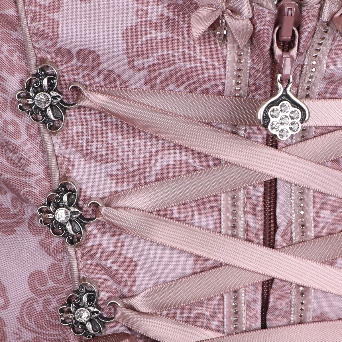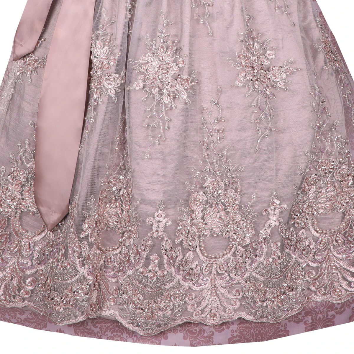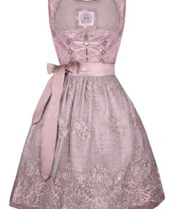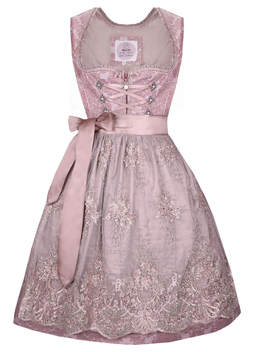 Ein hübsches Midi Dirndl Nara in Mauve von Marjo Trachten. Das Dirndl mit Herzausschnitt wird auf der Vorderseite mit einem Reißverschluss verschlossen, dieser besitzt einen hübschen Anhänger. Die Schnürung mit Satinband zeigt sich auf der Vorderseite. Der Kragen und Ausschnitt wurden mit einer schlichten Strassstein-Borte geschmückt. Am Ausschnitt wurden zusätzlich zwei Schleifen mit Herzanhänger angebracht. Das gesamte Dirndlkleid schmückt sich mit einem floralen Muster. Die doppellagige Schürze wurde aus Spitze gefertigt und mit Perlen und Pailletten besetzt. Der Trachtenrock misst eine Länge von 58cm.