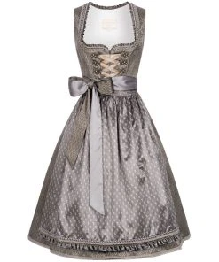 Ein bezauberndes Midi Dirndl Josefa in Grau von Marjo Trachten. Das Dirndl mit Herzausschnitt wird auf der Vorderseite mit einem Reißverschluss verschlossen. Die Schnürung mit Satinband zeigt sich auf der Vorderseite. Der Kragen und Ausschnitt wurden mit einer hübschen Zierborten geschmückt. Zudem wurde ein Froschgoscherl am Ausschnitt angebracht. Das gesamte Dirndlkleid schmückt sich mit einem Blumen – Muster. Die hübsche Schürze wurde aus Spitze gefertigt und mit floralen Stickereien besetzt. Der Trachtenrock misst eine Länge von 65cm.
