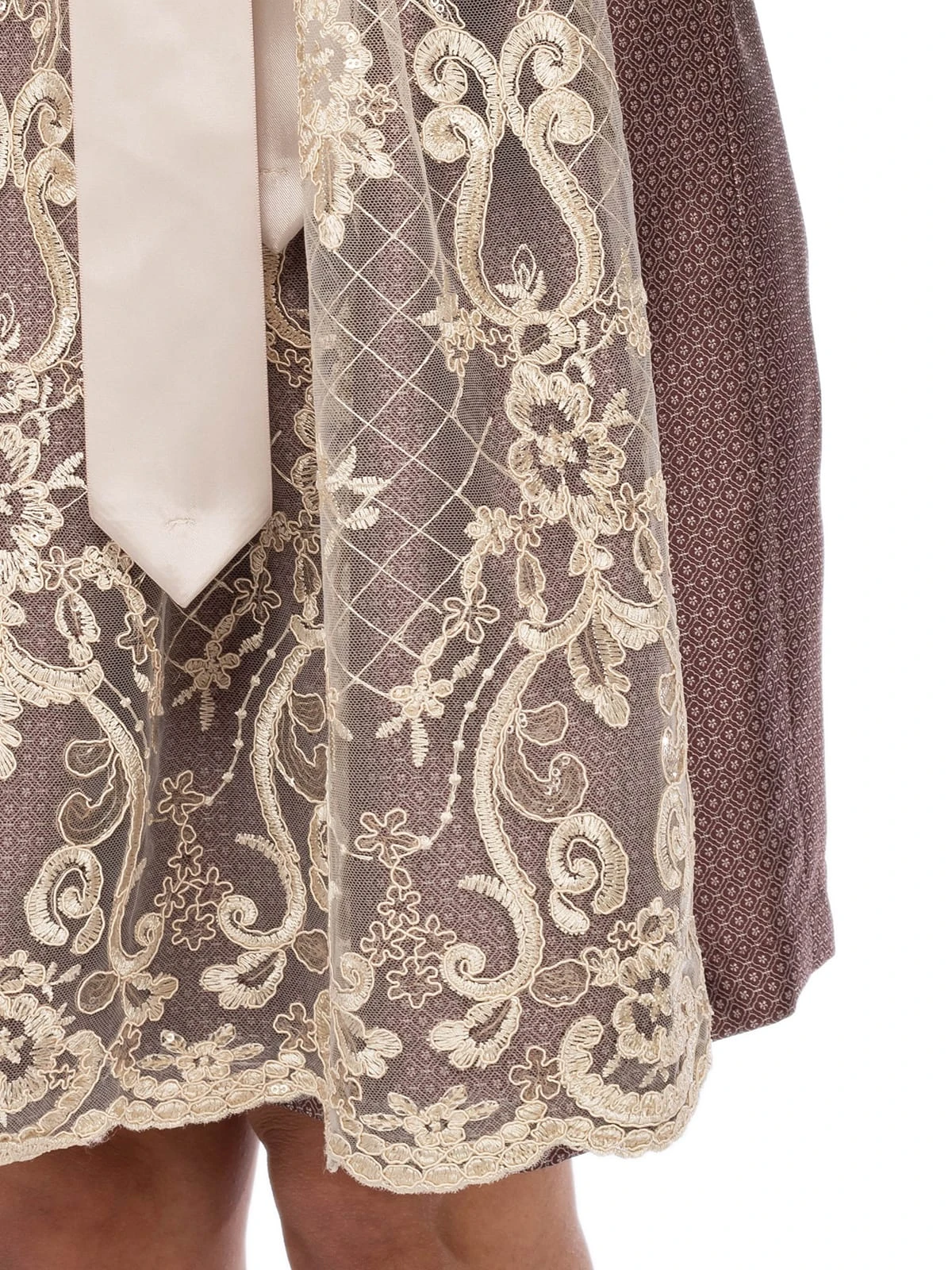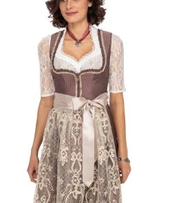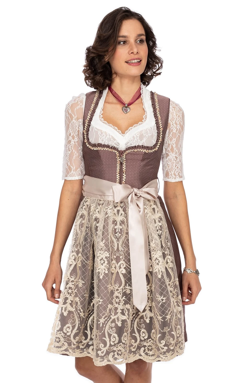 Elegantes Mini-Dirndl in der Farbe Rosenholz. Das zweiteilige Mini-Dirndl HENRIKE ist ein aparter Hingucker bei jeder traditionellen Festlichkeit. Das 58 cm lange Kleid ist in der Farbe Rosenholz gehalten, während die Schürze aus cremefarbener Spitze besteht. Das Mieder ist mit einer stilvollen Borte verziert und mit einem praktischen Reißverschluss ausgestattet. Eine klassische Schleife macht den traditionellen Look perfekt und lässt Sie beim Oktoberfest und ähnlichen Anlässen erstrahlen.•Dieses Dirndl fällt größengerecht aus. •Marjo •Trachtenmode •Handwäsche •Oberstoff1 55% Polyester 45% Viskose, Oberstoff2 65% Polyester 35% Baumwolle, Unterkleid 100% Acalat
