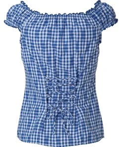 Wunderschöne blaukarierte Trachtenbluse Brenda Edina von der Marke Marjo Trachten. Die Bluse ist mit Glitzer Hirschen an den Schulterärmeln verziert, ebenfalls hat sie besonders schöne Rosenknöpfe. Am Rücken befindet sich eine Schnürung für den optimalen Tragekomfort. Die Trachtenbluse hat einen Herzausschnitt und ist ideal für jeden Anlass. Lässt sich perfekt mit einem Trachtenrock oder auch Ihrer Lieblingsjeans für den Alltag kombinieren.