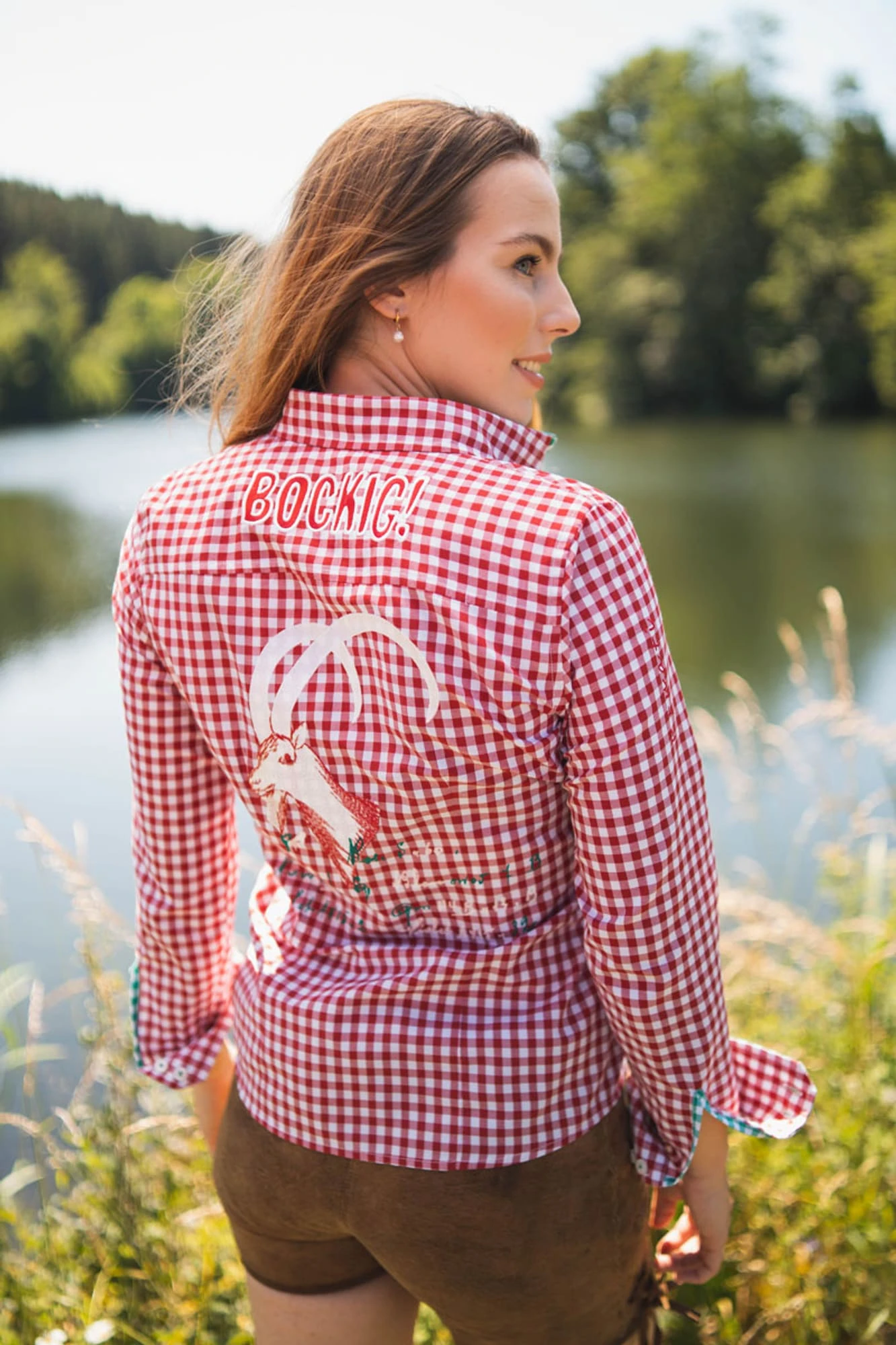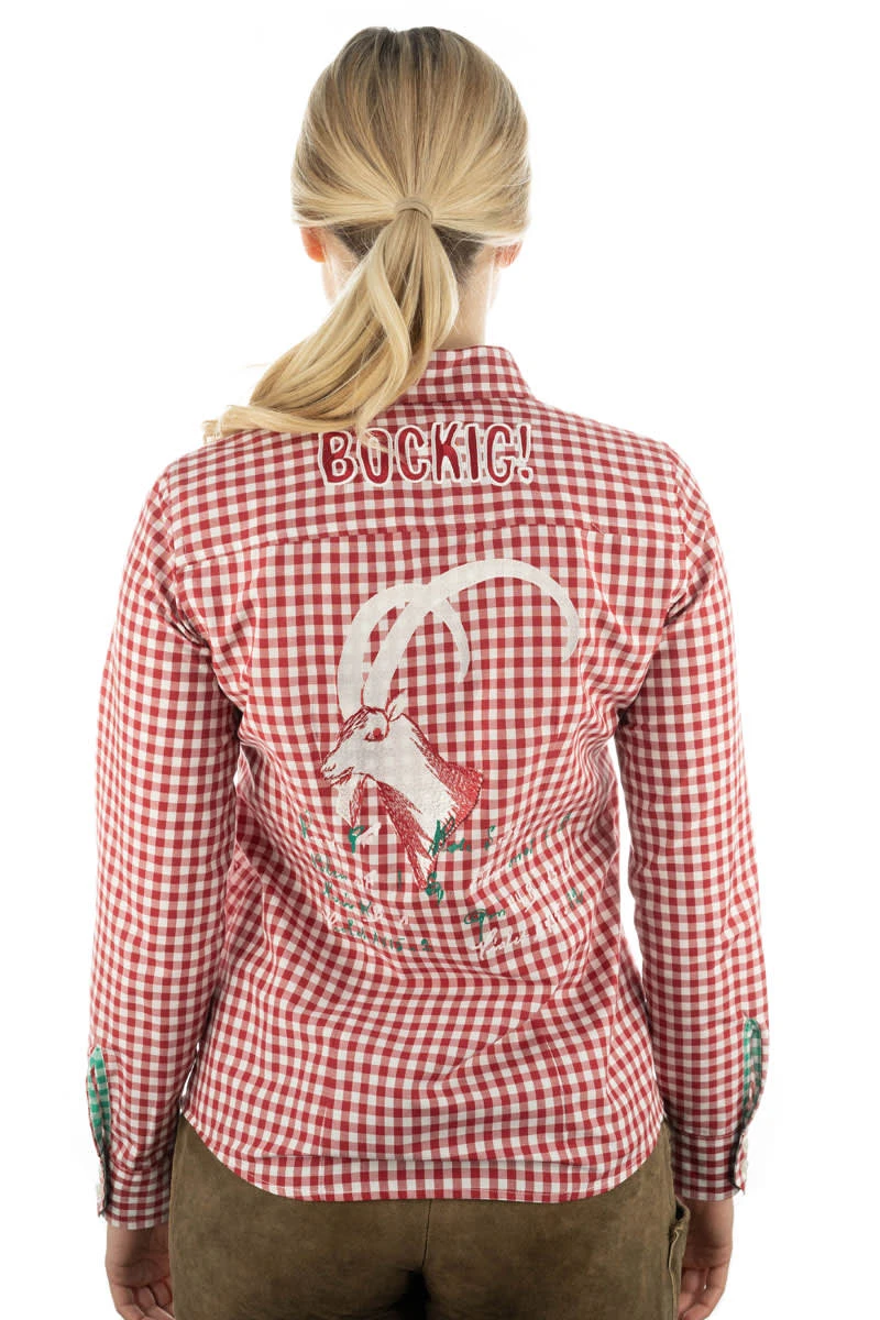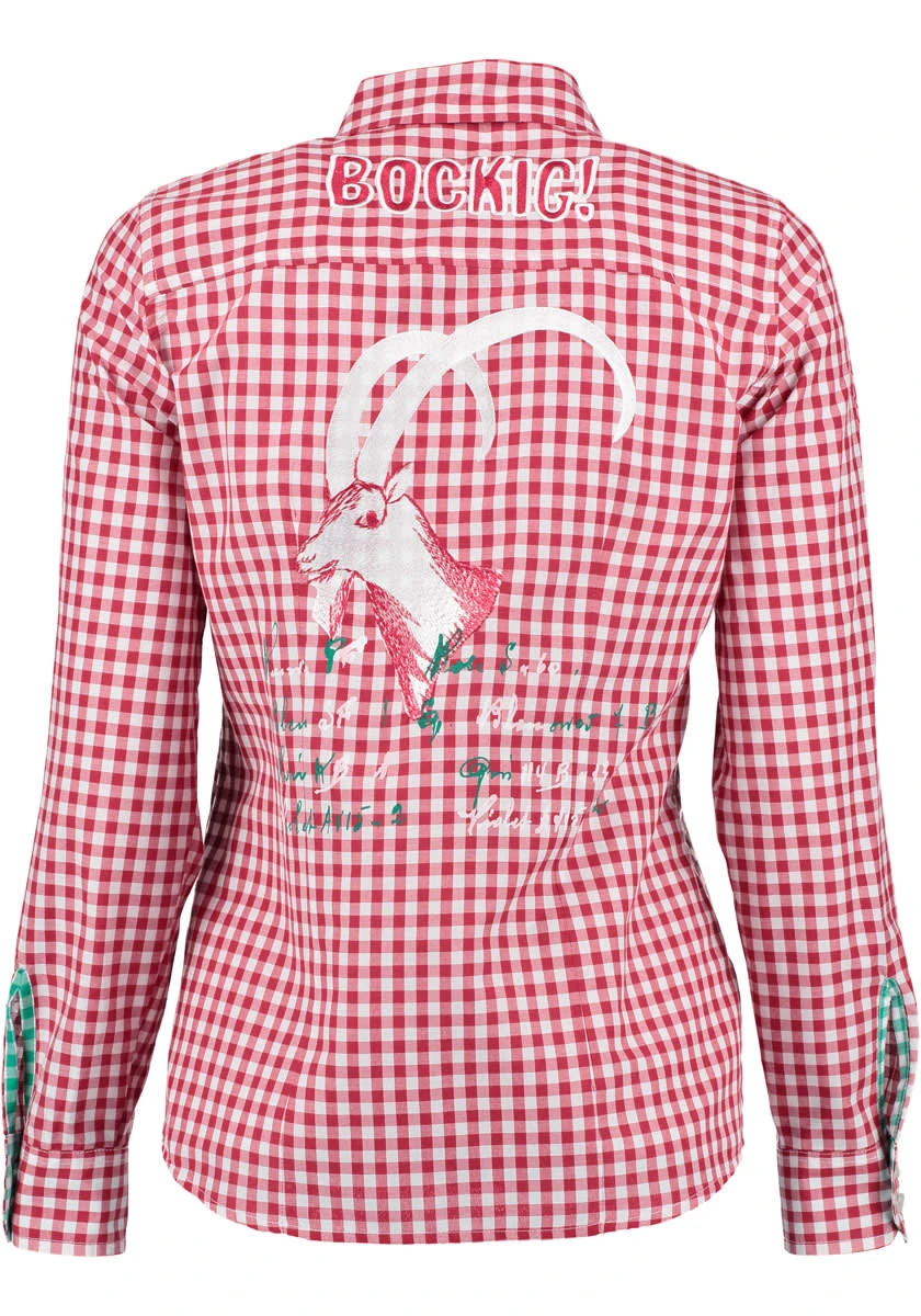 Diese besonders reichhaltig ausgestattete Bluse ist ein deutliches Bekenntnis zur Tracht. Der extrem aufwendige Steinbockstick auf der Rückenpartie prägt diese Wiesnbluse. Das ist moderne Tracht. Auch jetzt im Alltag kann sie ideal zur Jeans getragen werden und setzt markante alpine Akzente. Die gedruckten und gestickten Schriftzüge machen die Bluse jung und sportlich. Eine sehr aufwendige Bluse zu einem tollen Preis.