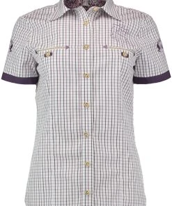 Wer die Farbe Lila mag, wird diese Halbarm-Bluse lieben! Dezent taucht die Farbe in dem sommerlichen Karo auf, ein dunkler Pflaumen-Ton betont die Ärmel und blitzt im Kragen hervor. Kleine Stickereien auf dem Vorderteil und den Ärmeln nehmen die Farbe Lila ebenso auf wie die Webbändchen an den zwei Brusttaschen. Aus reiner Baumwolle von OS Trachten geschneidert. Der leicht taillierte Schnitt macht von Größe 34 bis 54 eine gute Figur.