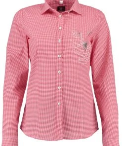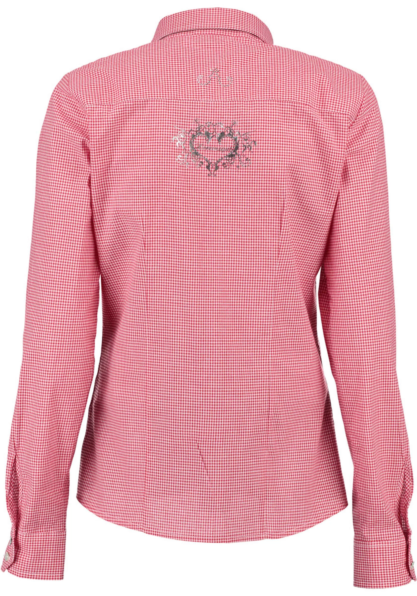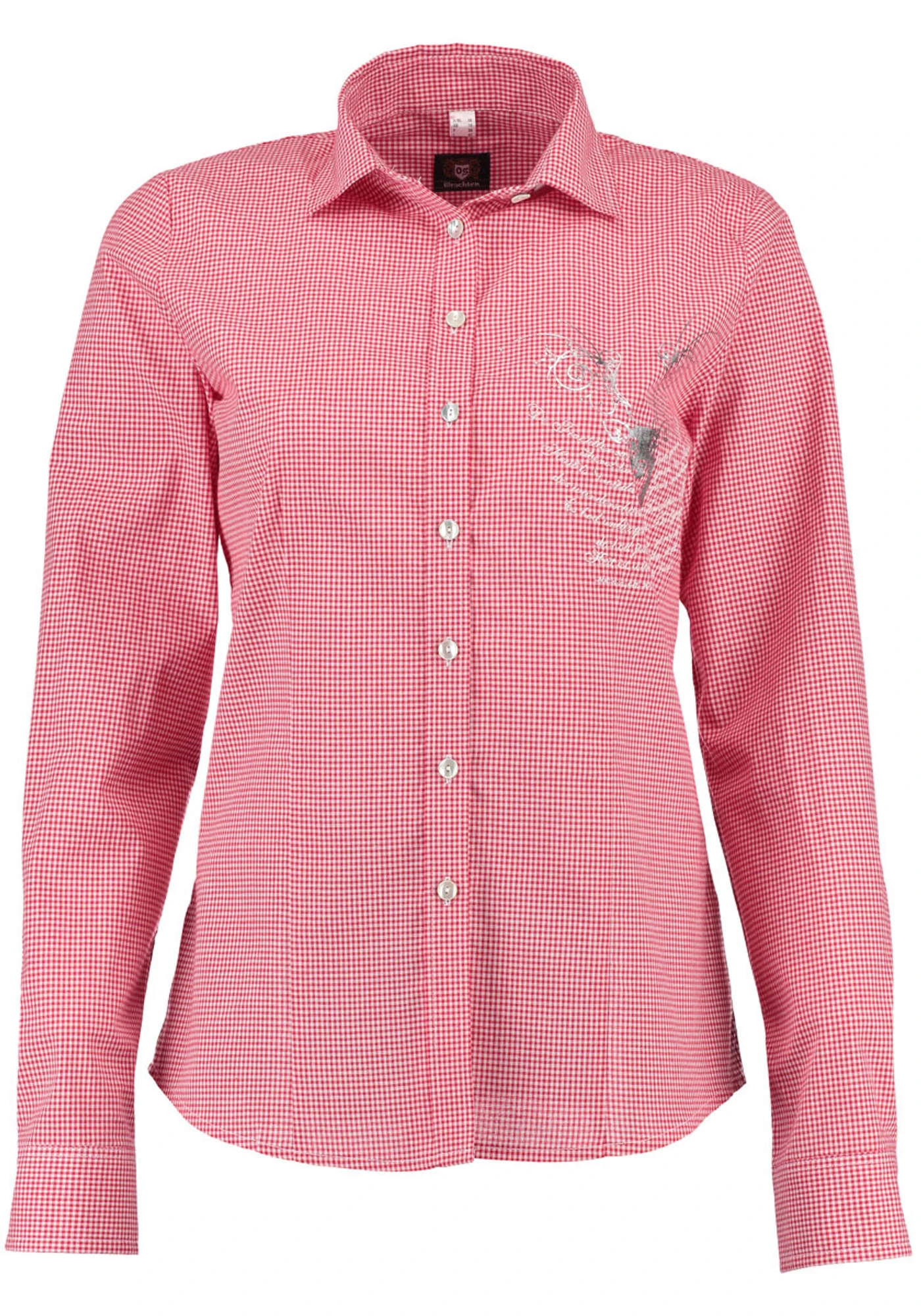 Ein Blusen-Highlight von der Marke OS Trachten. Mit dem Haifischkragen, den echten Perlmuttknöpfen und der schmalen Knopfleiste ist dieses Vichykarobluse topmodisch ausgestattet. Eine wertvolle Hirschdruckapplikation wird durch einen leicht trachtigen Schriftendruck ergänzt. Auf der Rückepasse und der Rückenpartie sind wiederum reichverzierte Herzmotive appliziert. Die Glanzeffekte der Applikationen lassen das Stück ganz besonders wirken. Made in Europe.