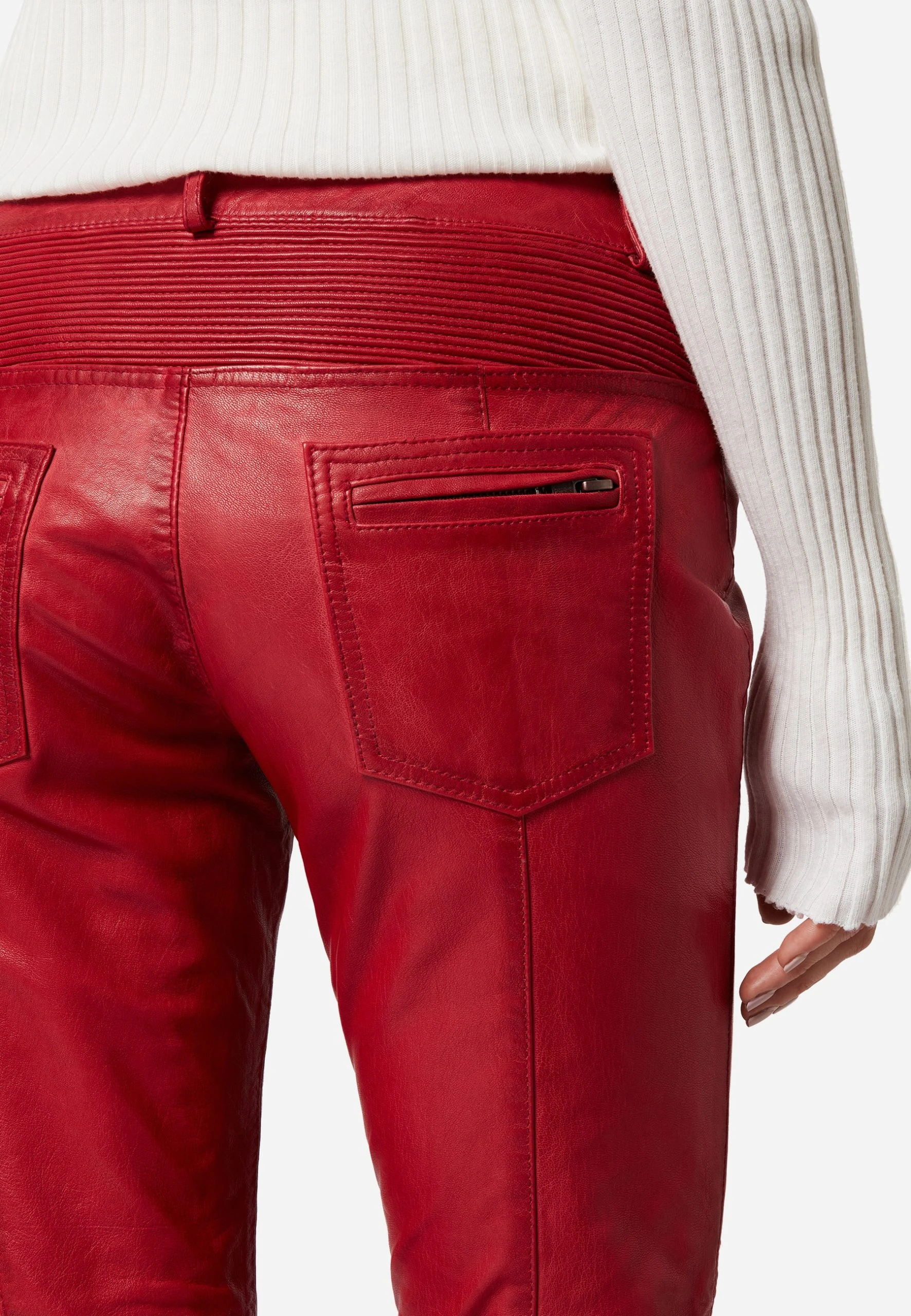 Lederhose Donna in Rot für Damen von Ricano® aus Ziegen-Nappa Leder – Regular Waist / Medium Rise – Femininer und figurbetonter Slim Fit – Futter: 100% atmungsaktives Polysatin – Ganzjahresartikel – von Frühling bis Winter zu jeder Jahreszeit passend – Größenausfall: Artikel fällt eine Nummer kleiner aus – Bitte eine Nummer größer wählen als gewohnt – Italienisches Fitting. Enthält nichttextile Bestandteile tierischen Ursprungs.