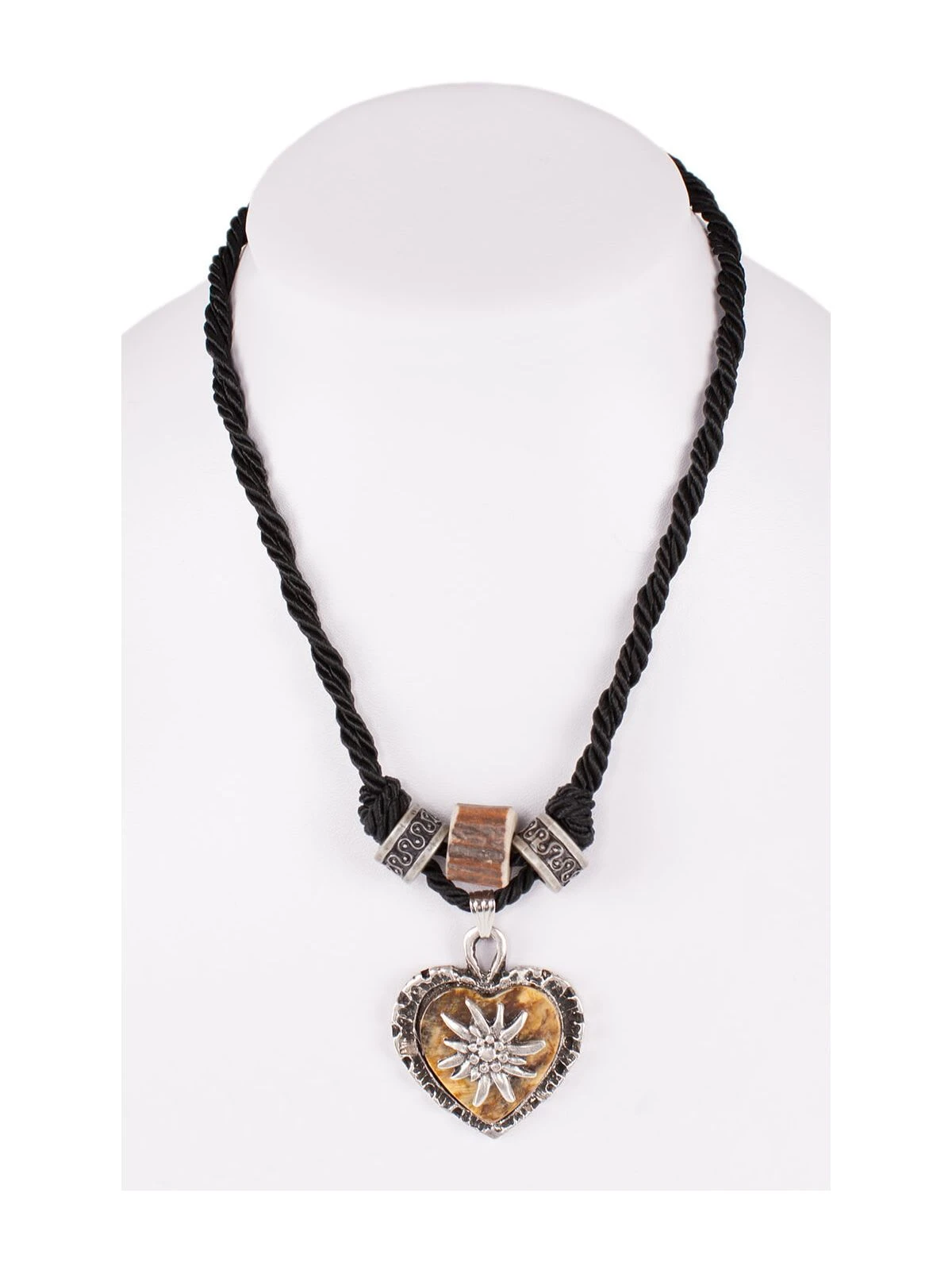 Halskette aus Textil und Metall. Zünftig, aber nicht altbacken – modisch, aber seine Wurzeln nicht verleugnend: Die Halskette von Schuhmacher weiß Tradition und Moderne auf formschöne Weise zu vereinen. Die schwarze Textilkordel bildet den „roten Faden“ und nimmt Zierperlen und einen Anhänger in Herzform auf. Das Edelweiß-Motiv auf dem Anhänger verweist auf die traditionelle Herkunft, der Einsatz von Satin bildet einen spannenden Kontrast. Kombiniert man den Halsschmuck mit einer tief dekolletierten Dirndlbluse kommt der edel anmutende Schmuck voll zur Geltung und inszeniert seine Trägerin, ganz gleich zu welchem Anlass, im besten Licht. Nicht nur auf dem Festzelt-Parkett ein liebliches Accessoire – ganz Schuhmacher eben!•Trachtenketten •Kordelband •Schuhmacher
