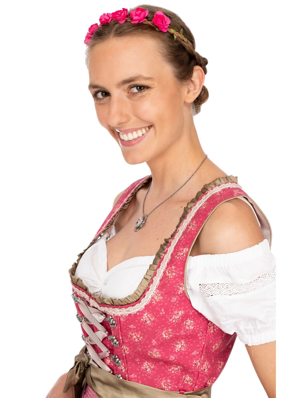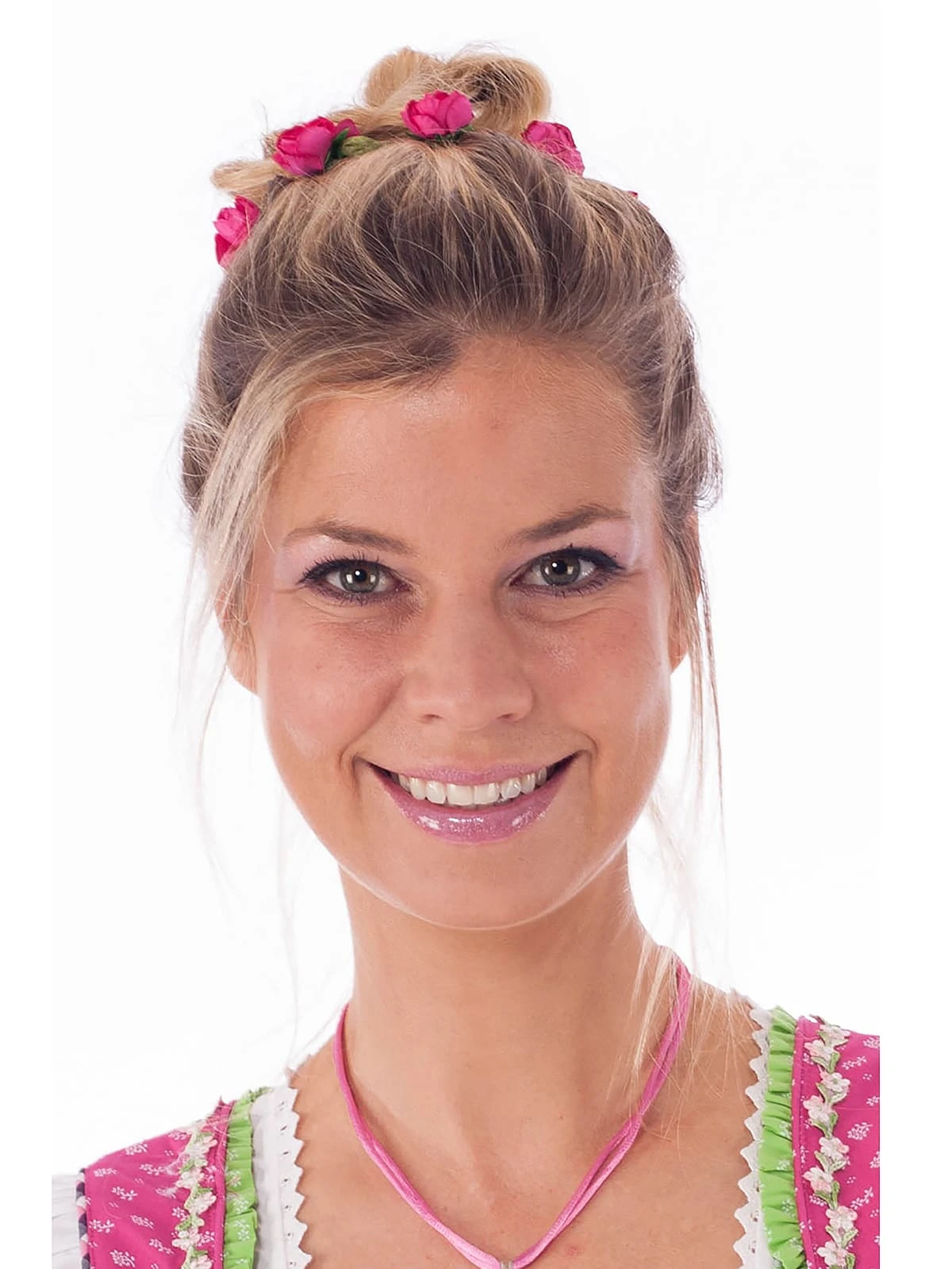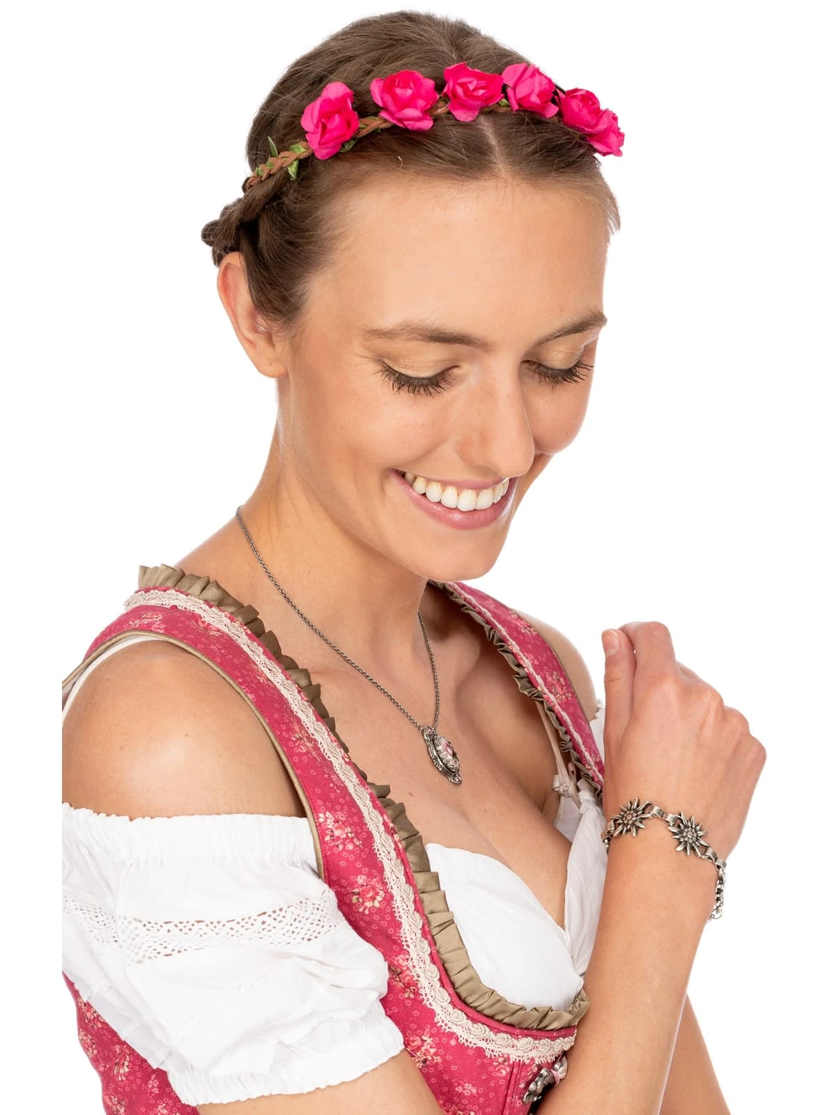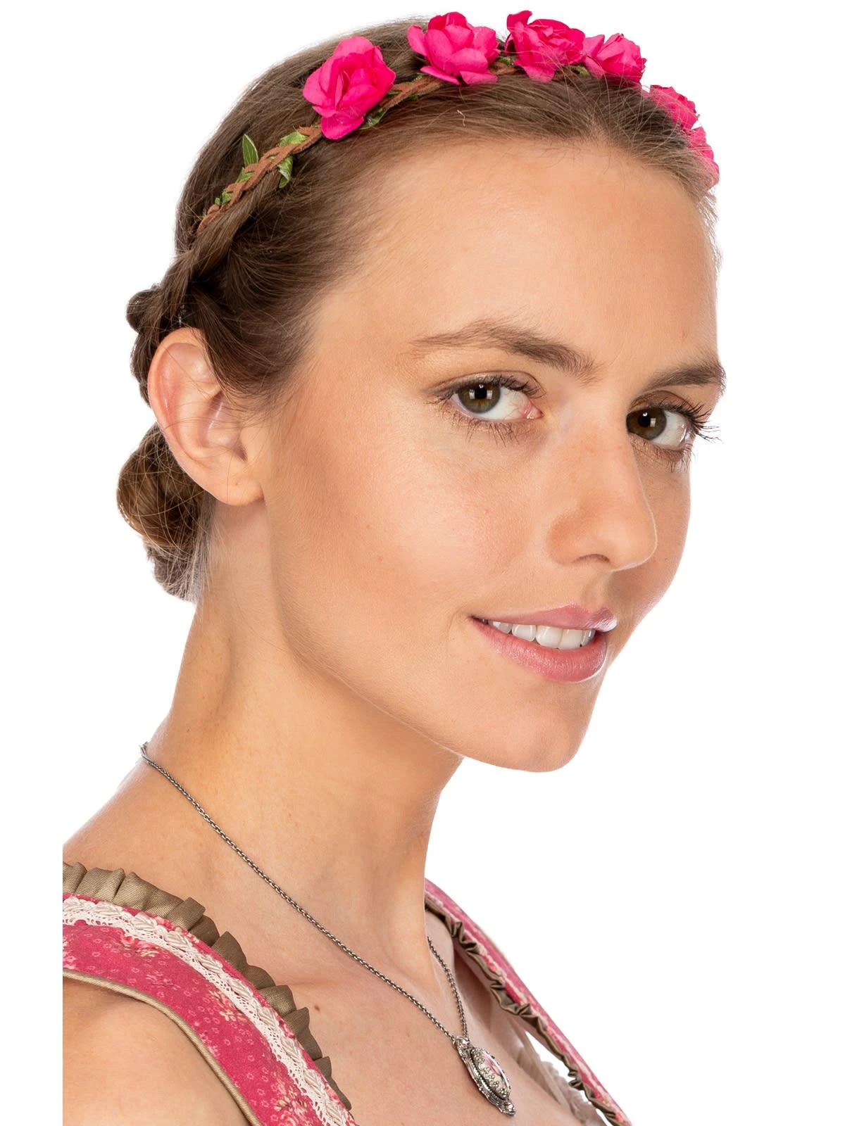 Trachten Haarband von Schuhmacher mit kleinen Röschen in Pink. Passender Haarschmuck verleiht jeder Tracht das gewisse Etwas. Blumen im Haar unterstreichen die Weiblichkeit und verleihen mädchenhaften Charme. Wer nicht auf einen geflochtenen Blumenkranz aus frisch gepflückten Blumen zurückgreifen kann, findet hier eine hübsche Alternative. Das geflochtene Haarband bezaubert mit kleinen, originalgetreuen Papierröschen, die in Sekundenschnelle einen romantischen Look zaubern, ohne überladen oder gar kitschig zu wirken. Das dezente Gummiband ist sehr elastisch und passt sich mühelos der Kopfform an. Nach dem Fest lässt sich das Haarband ganz einfach wieder in der Schublade verstauen und bleibt das ganze Jahr über frisch. Ein schönes Accessoire, das lange Freude bereitet.•Haarschmuck •Haarband •Schuhmacher