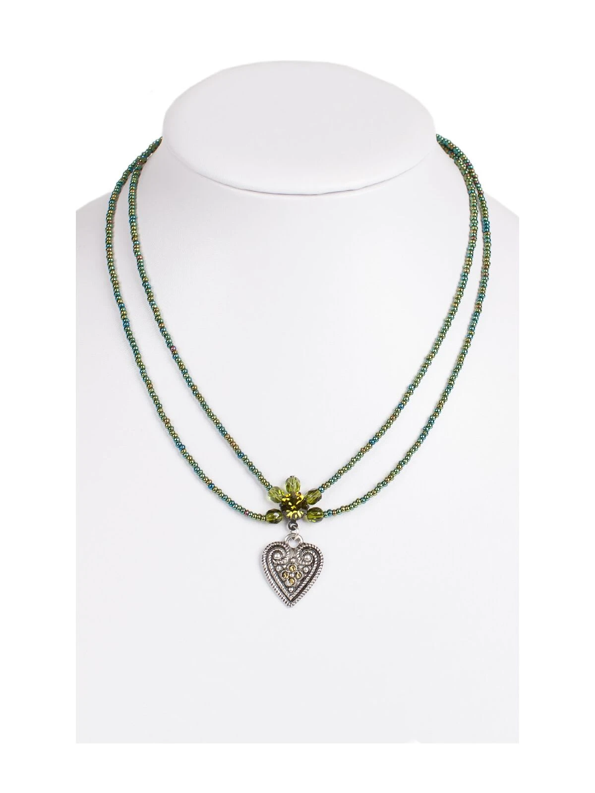 Halskette mit besonderem Reiz. Die Halskette von Schuhmacher besteht aus zwei nebeneinander verlaufenden Perlenreihen, die im Farbton Oliv gehalten sind. Dadurch wirkt die Kette klassisch und stilvoll. Das optische i-Tüpfelchen bildet das in der Mitte angebrachte Herz, das geschwungene Muster und glänzende Steine aufweist. Passend zu den verschiedensten Arten von Outfits.•Trachtenketten •Perlenkette •Schuhmacher