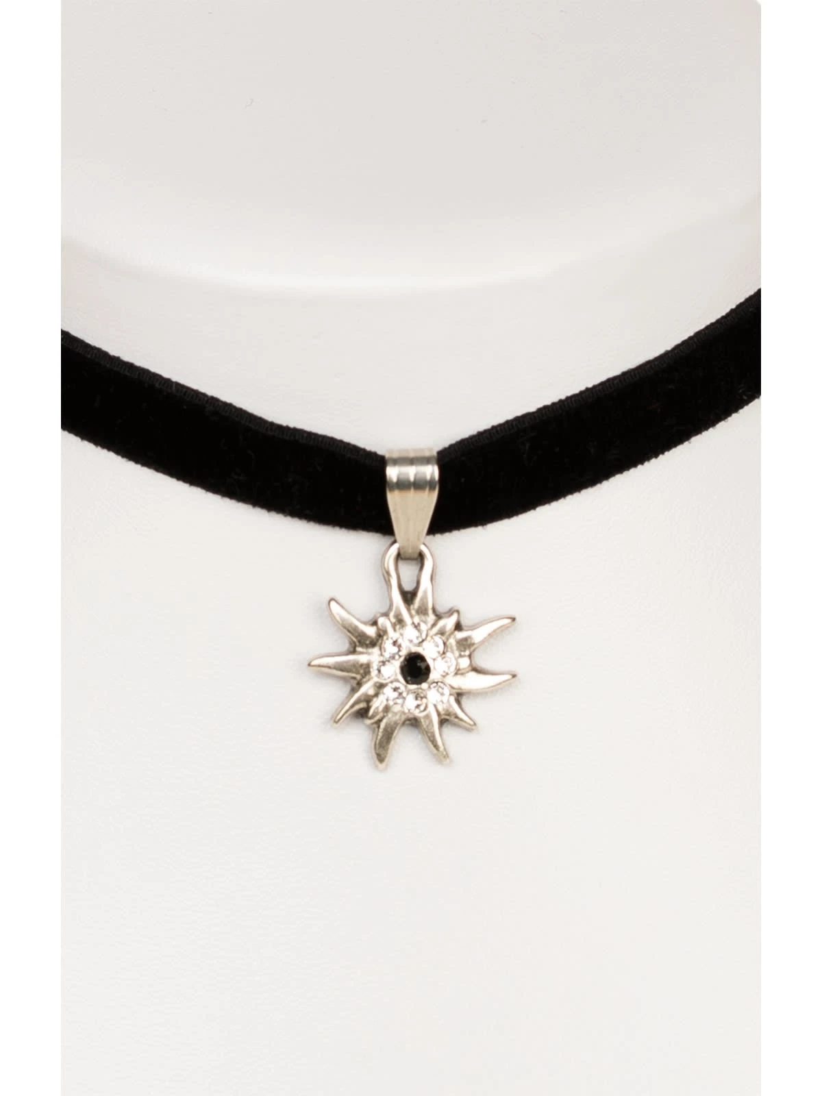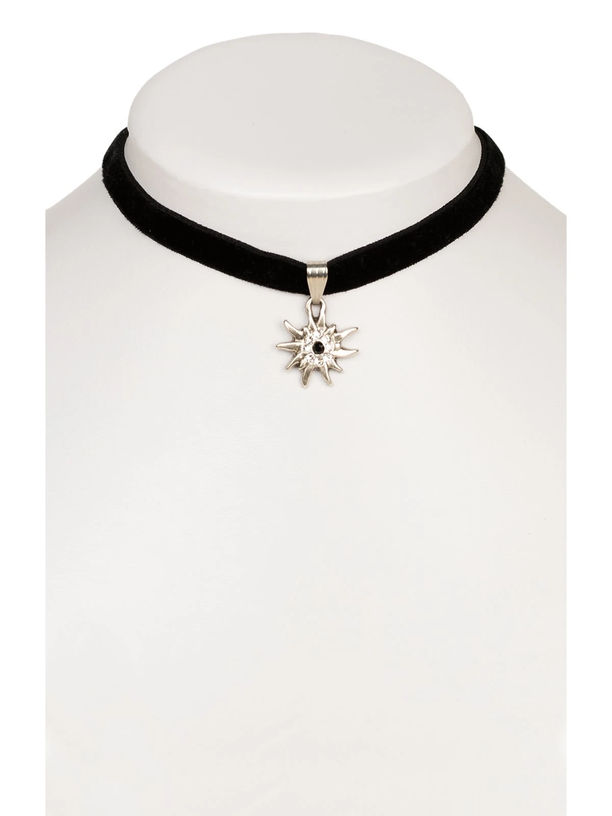 Passend zum Dirndl und wie das Tüpfelchen auf dem “i”. Die richtige Halskette zum Dirndl macht aus einem Dirndl ein perfektes Dirndl. Früher ein Kropfband, heute modifizert, schmal gehalten und nah am Hals getragen passt die schwarze Samtbandkette wunderbar zum Dirndl und zeigt sich jung und kess. Das kleine alpine Edelweiss ist mit kristall und schwarz farbenen Strasssteinen besetzt und sorgt für etwas Glanz und Glamour beim Outfit. Das Samtband ist in der Weite verstellbar und passt für alle gängigen Halsweiten.•Trachtenketten •Samtband •Schuhmacher