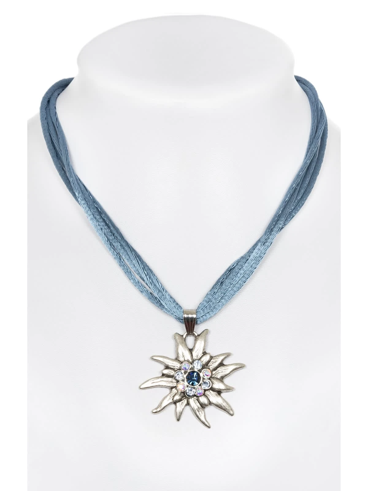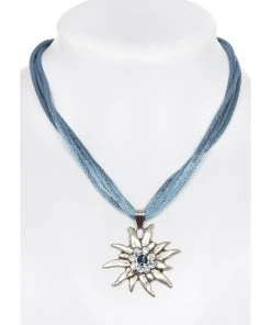 Moderne Halskette mit Edelweiß. Ideal zum Dirndl oder der Trachtenbluse passt die Halskette im Farbton Jeans. Die aus Stoff gefertigte Kette für Damen lässt sich sehr angenehm tragen. Der Anhänger in Form einer Blüte punktet mit funkelnden weißen und blauen Schmucksteinen. Das markante Accessoire ist ein schöner und traditioneller Blickfang.•Trachtenketten •Edelweiss •Schuhmacher