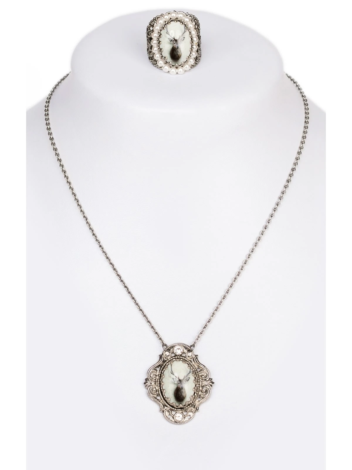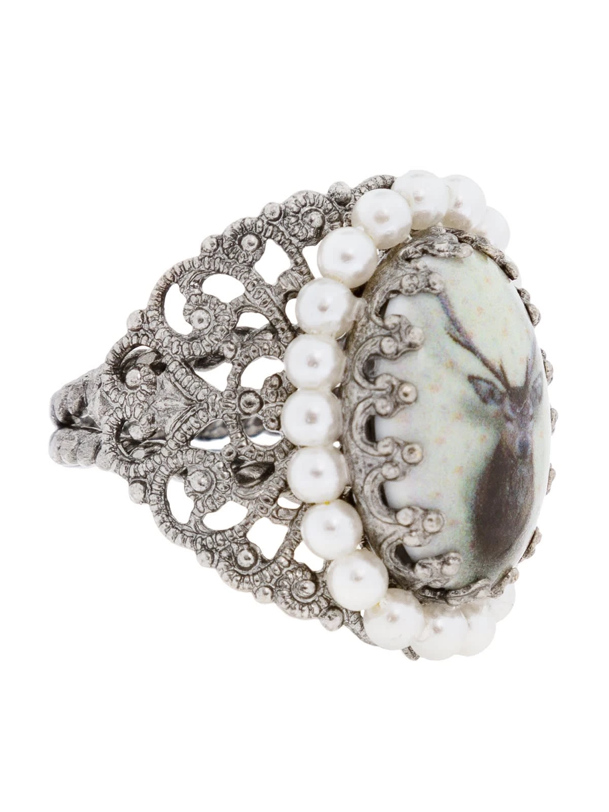 Extravagant mit Hirschmotiv. Der Ring hat einen Durchmesser von etwa 20 Millimetern. Fein ziseliert und mit Perlen eingefasst ist der Ring extrem ausdrucksstark und ein echter Blickfang. Die passende Halskette mit gleichem Motiv gibt es auch.•Trachtenringe •OneSize •Schuhmacher