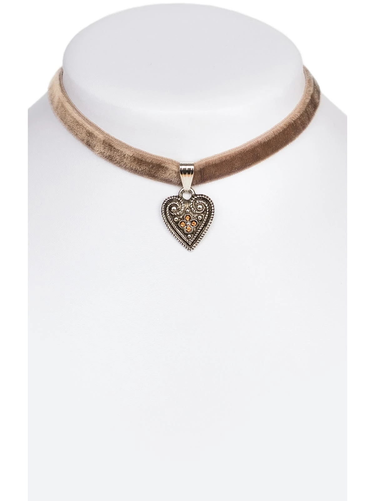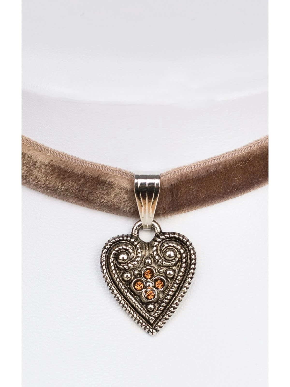 Dirndl Samtbandkette mit Herzanhänger. Die Alternative junge Halskette zum Dirndl. Die passende Halskette zum Dirndl macht aus einem Dirndl ein perfektes Dirndl. Der Trend zum kompletten authentischen Outfit ist ungebrochen und so gehört die Halskette einfach zum Dirndl dazu weil sie ein schönes Dekoletté macht. Während bei normalen Halsketten die Farben meist im Anhänger der Kette und somit unscheinbarer sind, lässt sich mit der taupe farbenem Samtbandkette direkt auf die Dirndlfarbe eingehen. Nah am Hals getragen wirkt das jung und kess und der kleine Herzanhänger mit den farblich passenden Strassteinen ist traditionelles Element und toller Blickfang zugleich.•Trachtenketten •Samtband •Schuhmacher