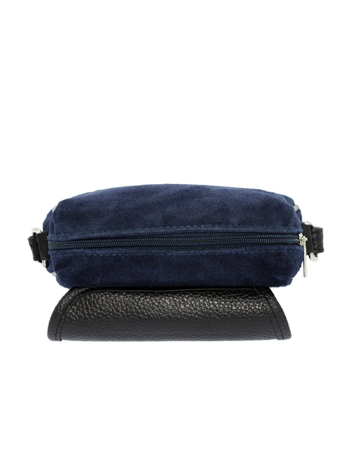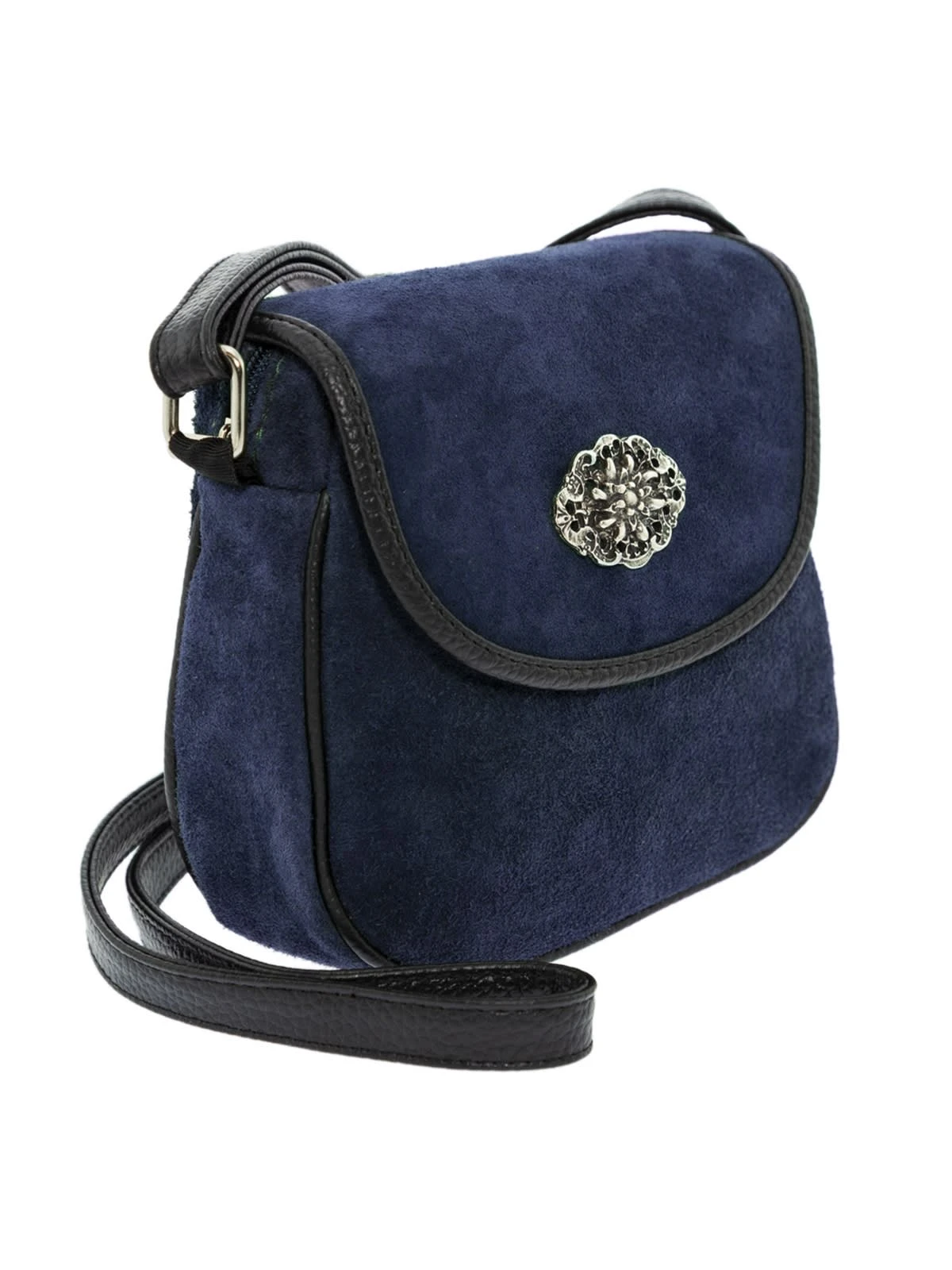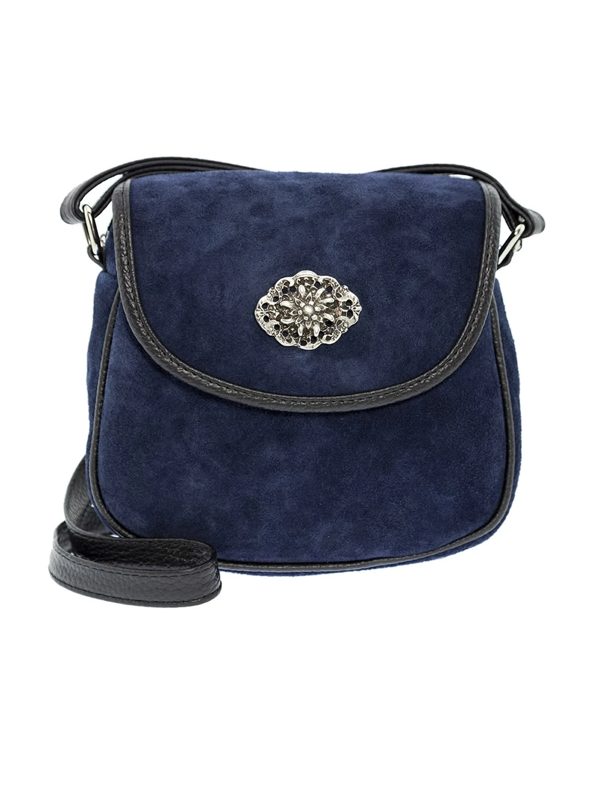 Marineblaues Lieblingsstück. Herzallerliebst ist die Trachtentasche TA3000 von Schuhmacher aus marinefarbenem Veloursleder. Ein praktischer Magnetverschluss mit Innenreißverschluss verwahrt Handy, Geld und Schlüssel sicher. Die zeitlose Umhängetasche passt perfekt zum blauen Dirndl oder zur Jeans. Zierpaspeln und eine attraktive Edelweißapplikation aus Metall machen sie zum Hingucker nicht nur für eine Saison.•Tasche •Tracht •Wildleder, ca. 20 x 18 x 6 cm, Schulterriemen 1,39 m verstellbar