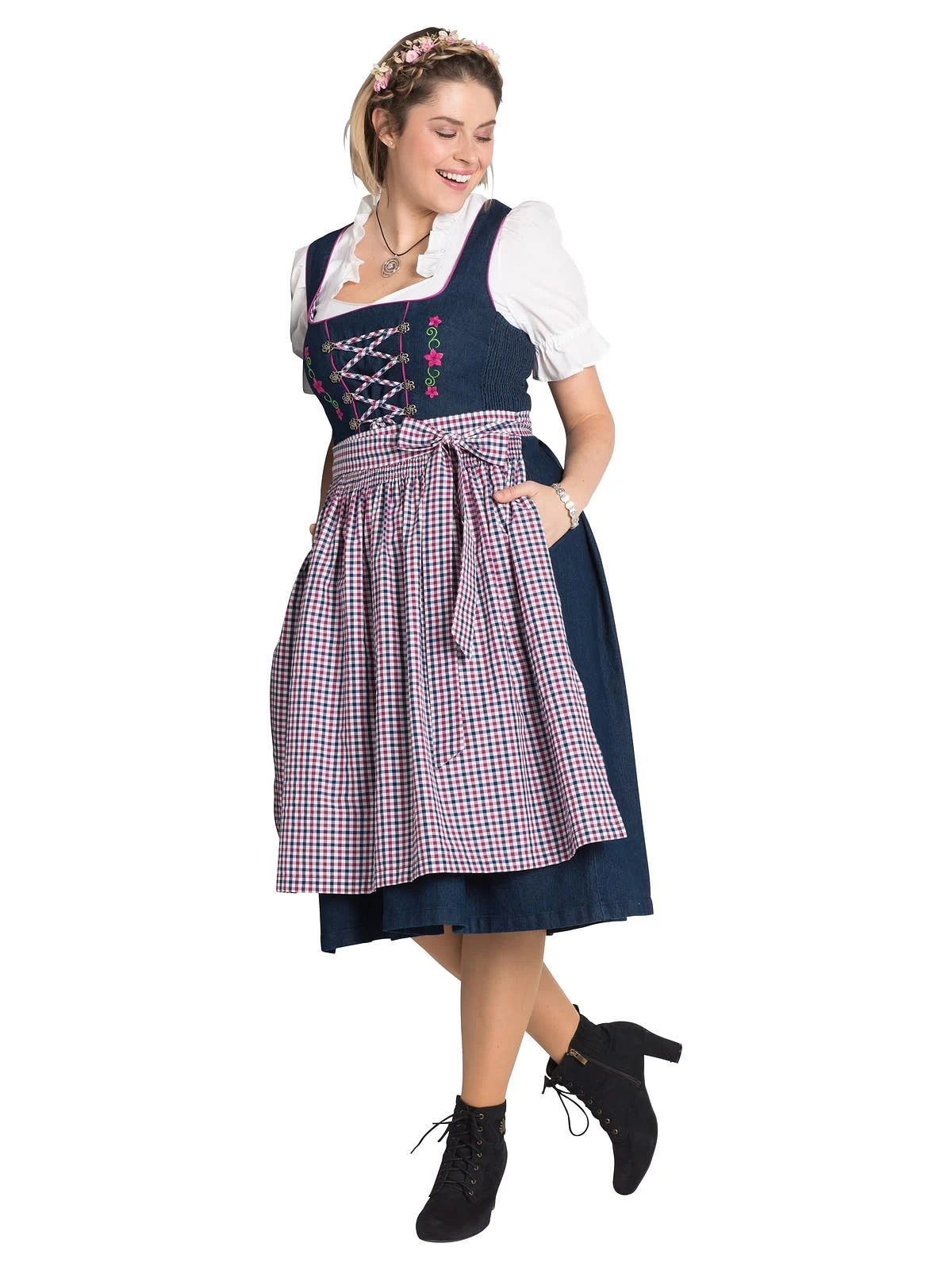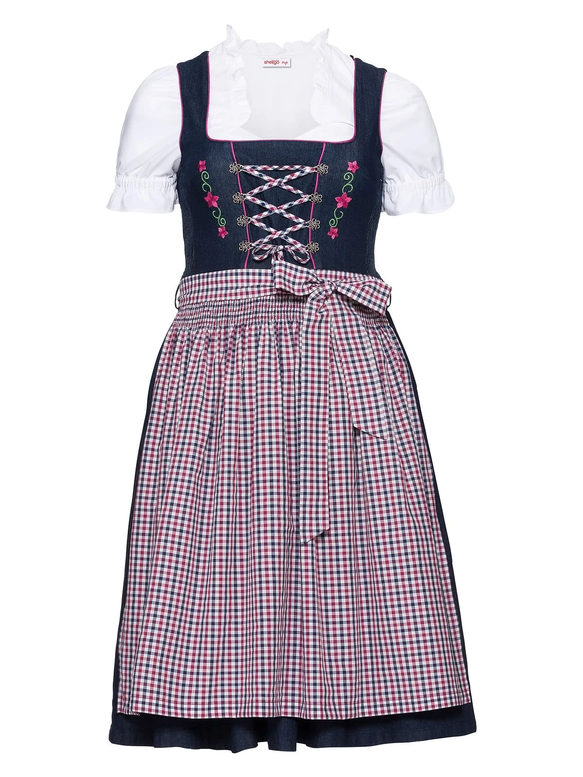 Modern, jung und angesagt präsentiert sich dieses Dirndl von sheego. Der Jeans- Look lockert die traditionelle Optik auf. Das Oberteil besitzt dekorative Stickereien, eine Schnürung mit Zierösen und kontrastfarbene Biesen. Die Schürze ist im typischen Trachtenkaro gearbeitet. Im Rücken befindet sich ein nahtfeiner Reißverschluss.
