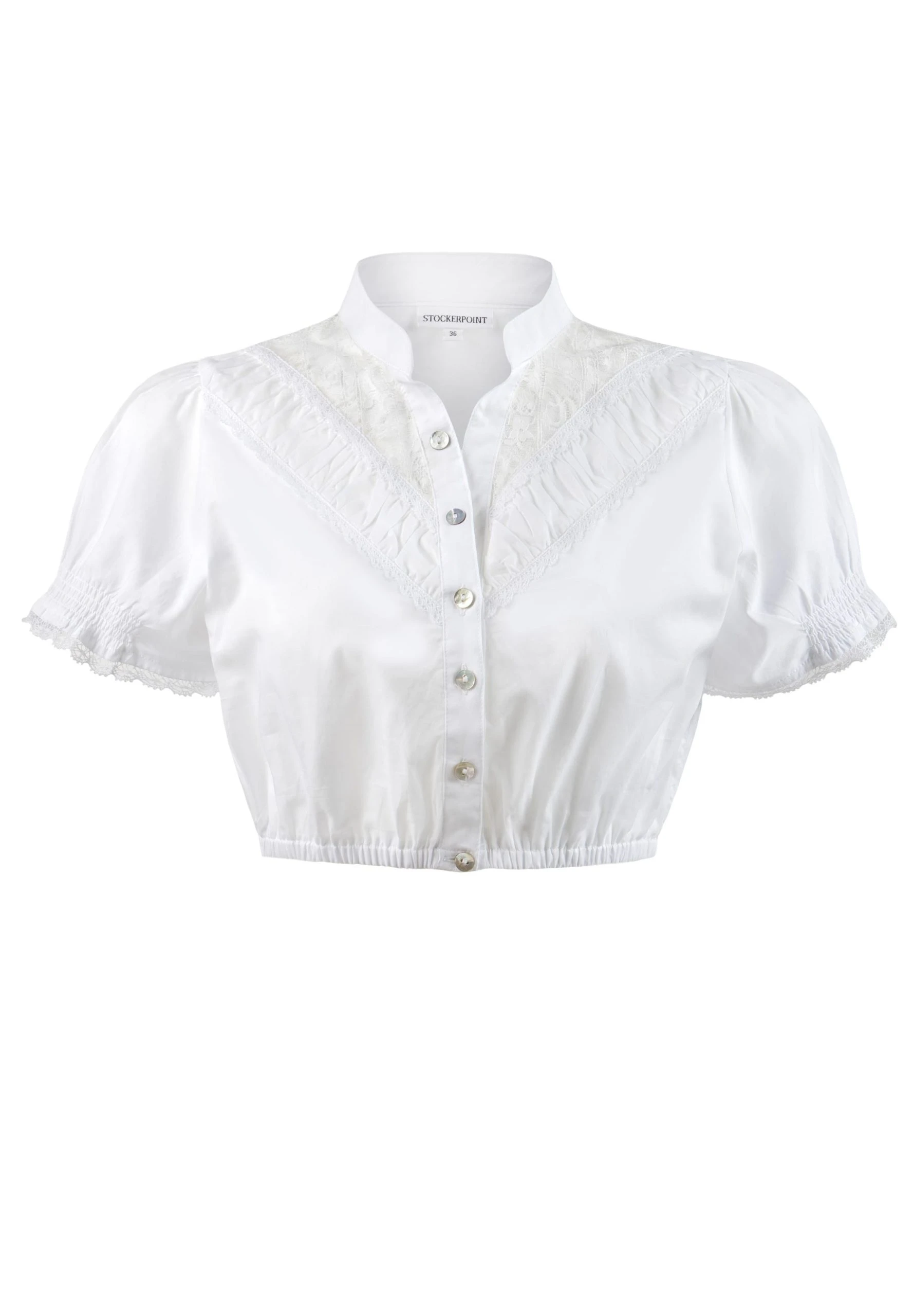 Dirndlbluse B-4020 von Stockerpoint in weiß. Die klassische Damenbluse ist mit feinen Spitzen und stilvollen Borten liebevoll veredelt und prägen diesen besonderen Stil. Der kleine Stehkragen und die durchgehende Knopfleiste setzen sich gekonnt in Szene und runden das edle Design gekonnt ab. Diese hochwertig verarbeitete Bluse ist vielseitig kombinierbar und zieht alle Blicke auf sich.