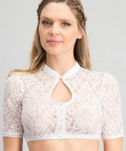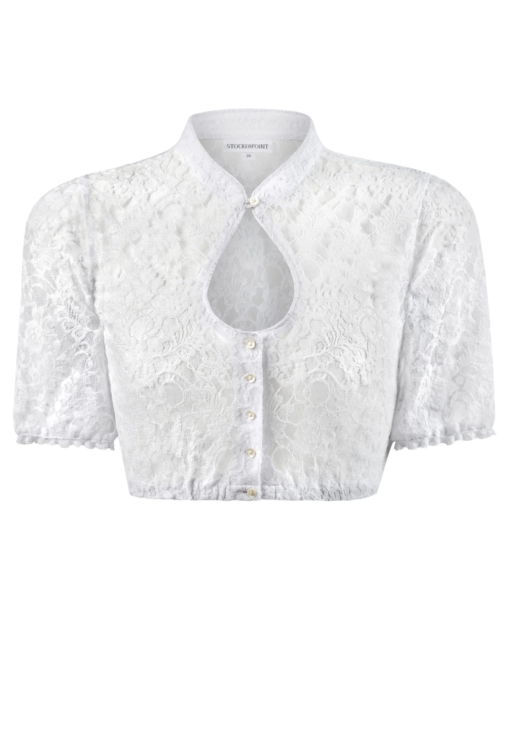 Dirndlbluse B-5075 von Stockerpoint in weiß. Die hochgeschlossene Damenbluse aus hochwertigem, transparenten Spitzenstoff zeichnet sich durch liebevolle Details aus. Der elegante Stehkragen und der feminine Tropfen-Ausschnitt ist mit einer feinen Spitze veredelt und umschmeichelt gekonnt das Dekolleté. Diese hochwertig verarbeitete Bluse ist vielseitig kombinierbar und zieht alle Blicke auf sich.