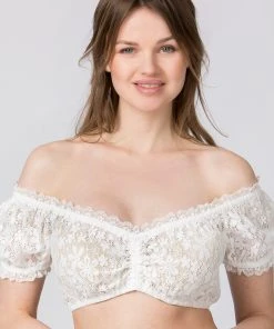 Dirndlbluse Katya von Stockerpoint in creme. Diese raffinierte Damenbluse aus transparentem Spitzenstoff kann im Carmen Look getragen werden und überzeugt durch ihre hervorragende Passform. Sie ist mit einer feinen Spitze verziert und umschmeichelt gekonnt das Dekolleté. Durch den Tunnelzug in der vorderen Mitte kann die Weite am Ausschnitt reguliert werden und passt sich somit perfekt an das Mieder an. Die kleinen Spitzen am Ärmelbund sorgen für einen zusätzlichen Akzent und runden das Design perfekt ab.