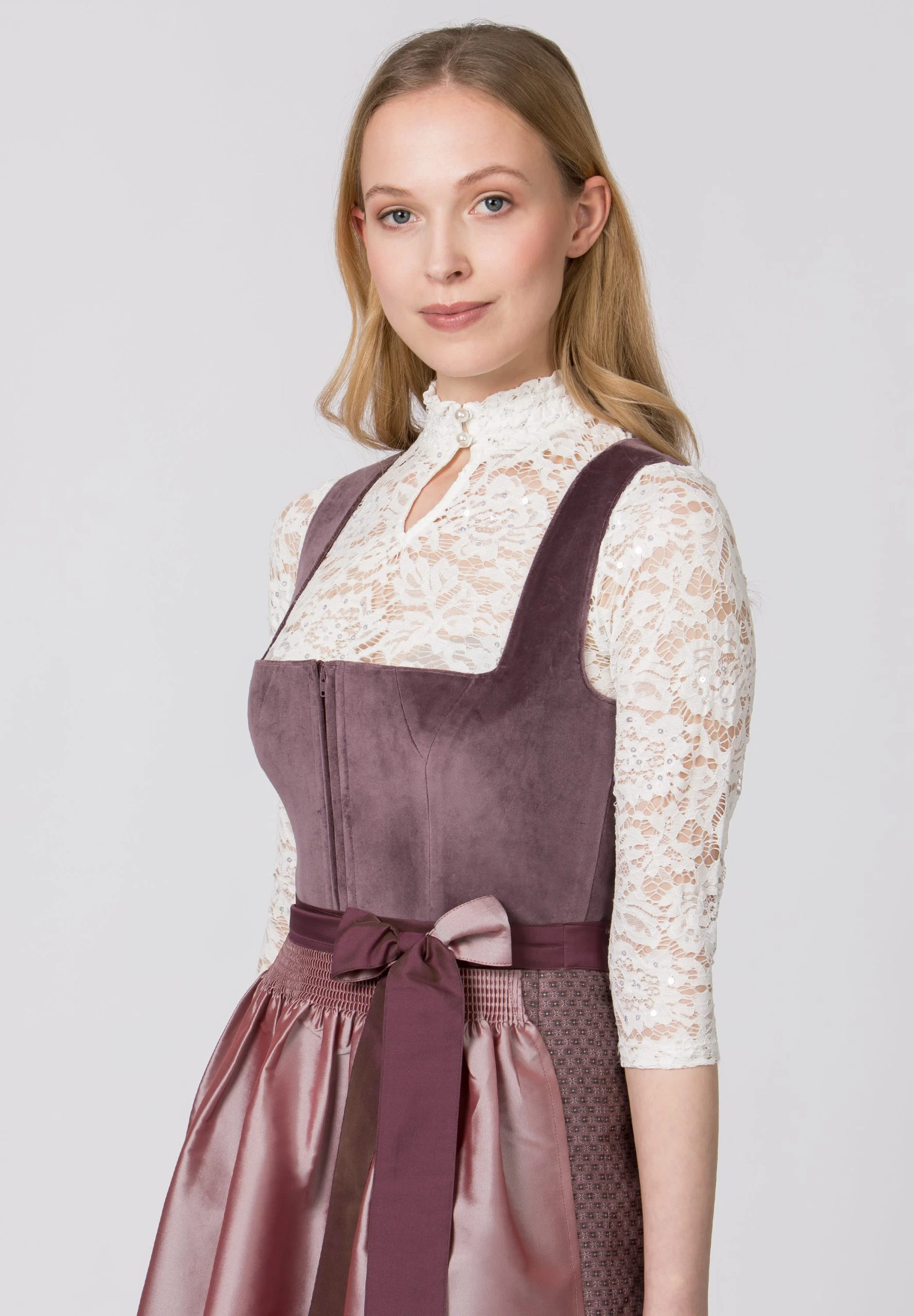 Dirndlbluse Deliane von Diamond en vogue in creme. Die hochgeschlossene Damenbluse aus hochwertigem, transparenten Spitzenstoff zeichnet sich durch liebevolle Details aus. Der elegante Stehkragen und der feminine Tropfen-Ausschnitt ist mit einer feinen Spitze veredelt und umschmeichelt gekonnt das Dekolleté. Diese hochwertig verarbeitete Bluse ist vielseitig kombinierbar und zieht alle Blicke auf sich.