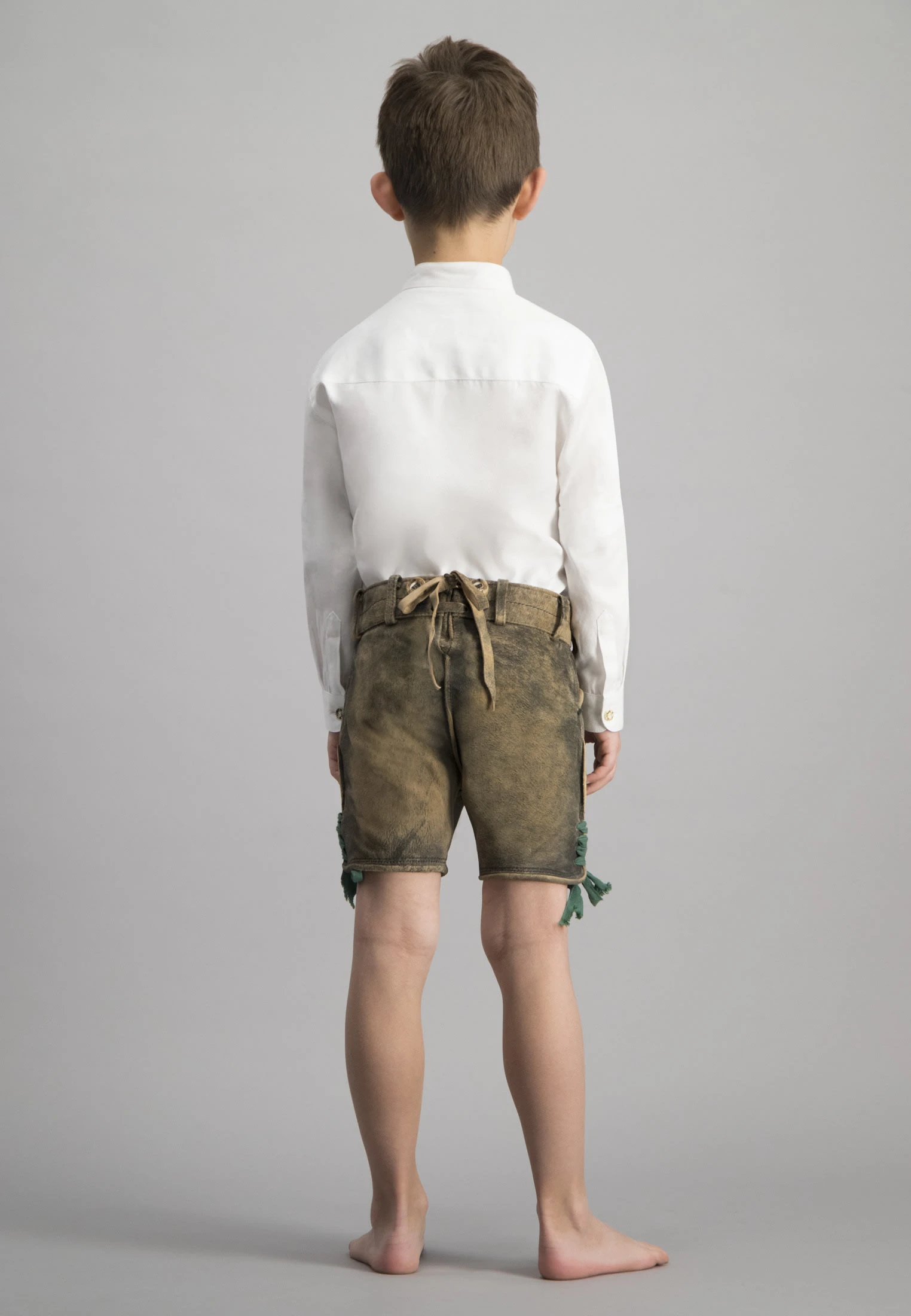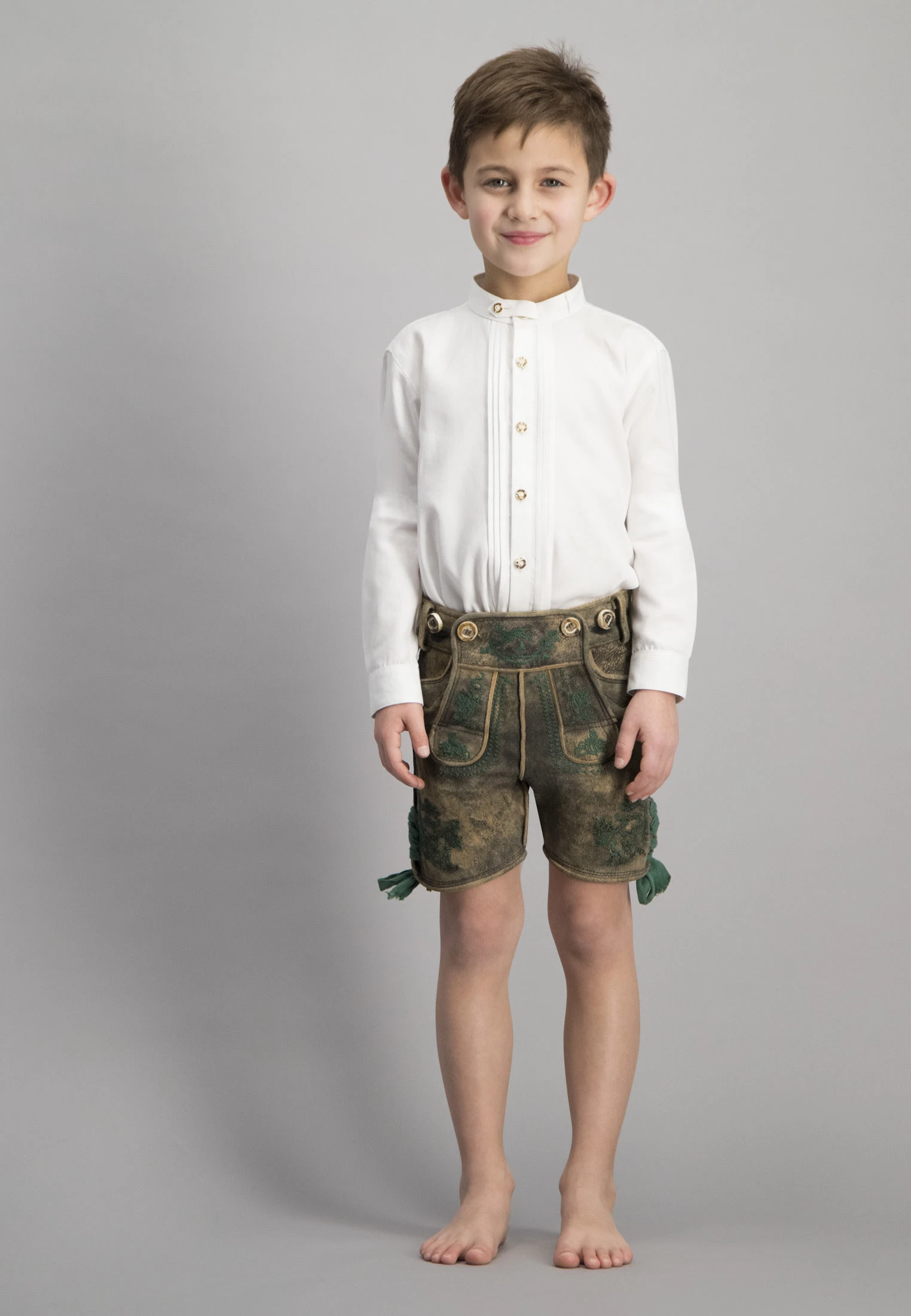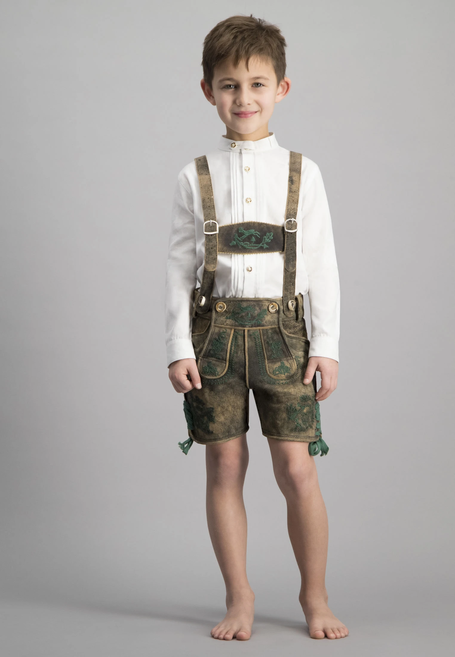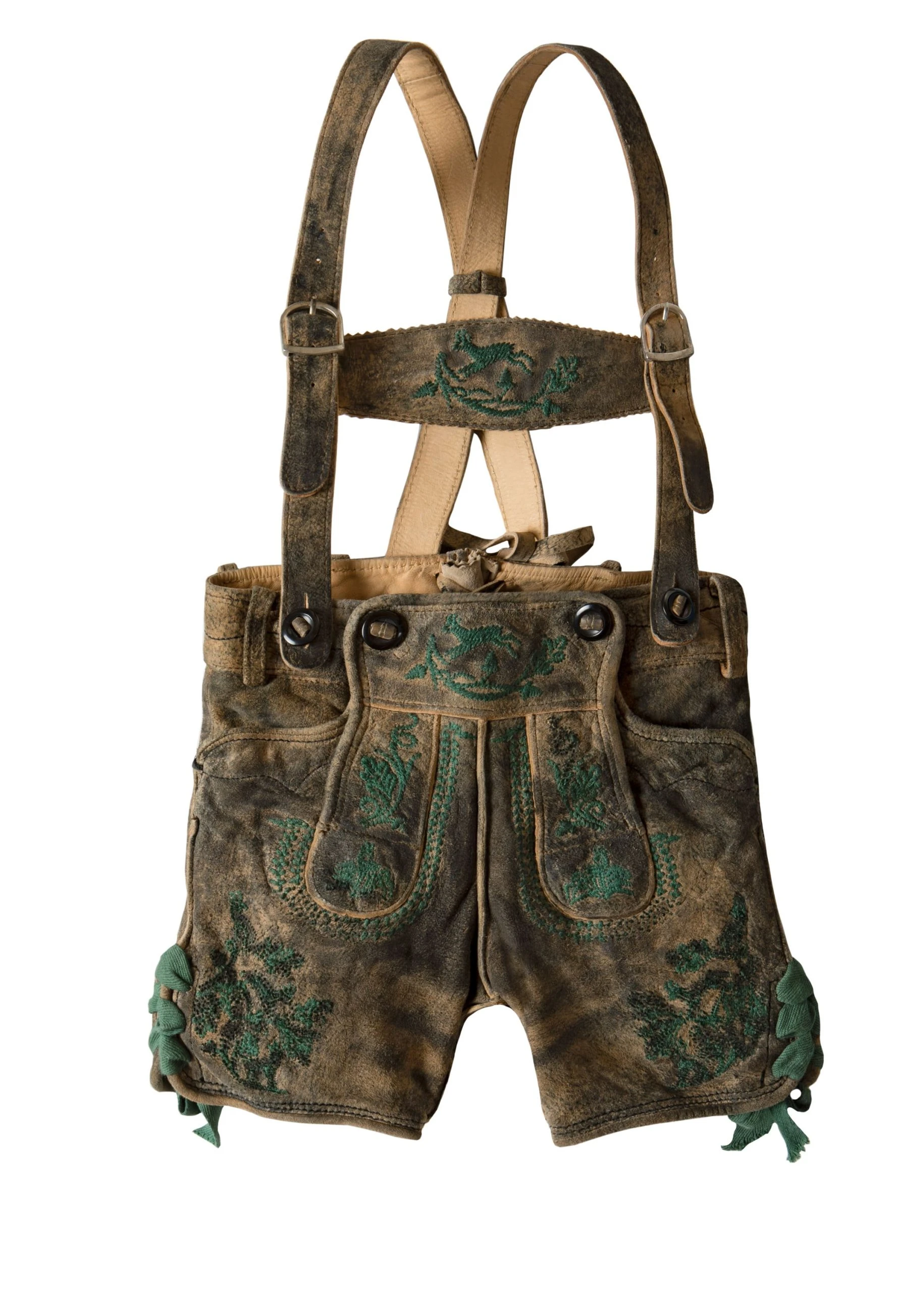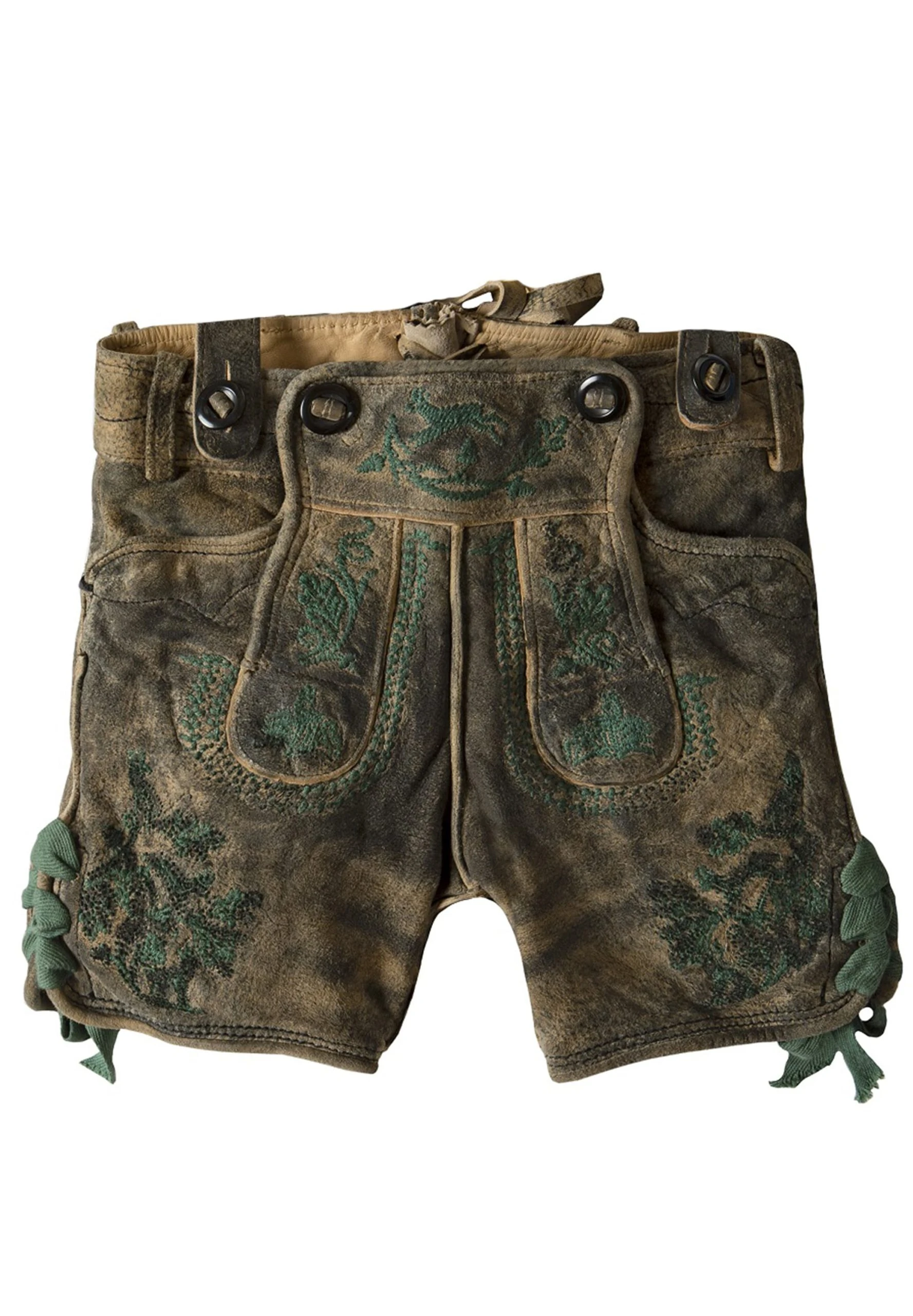Kinderlederhose Charly kurz von Stockerpoint in oid-tanne. Die Lederhose aus hochwertig, gegerbten Wildbock-Leder in Hirschoptik zeichnet sich durch den ausgefallenen Vintage-Look aus. Die nach alten Vorbildern gefertigte Stickerei harmoniert perfekt mit den Knöpfen in Hirschhorn-Optik. Die außergewöhnliche Strukturierung des Leders mit antiken Farbverläufen verleihen dem Modell eine einzigartige Note. Dank Schnürung an Bund-Rückseite kann die Lederhose in der Weite angepasst werden. Die Hose wird mit Träger geliefert. Dieses Modell gibt es auch für Erwachsene für den perfekten Partnerlook.
