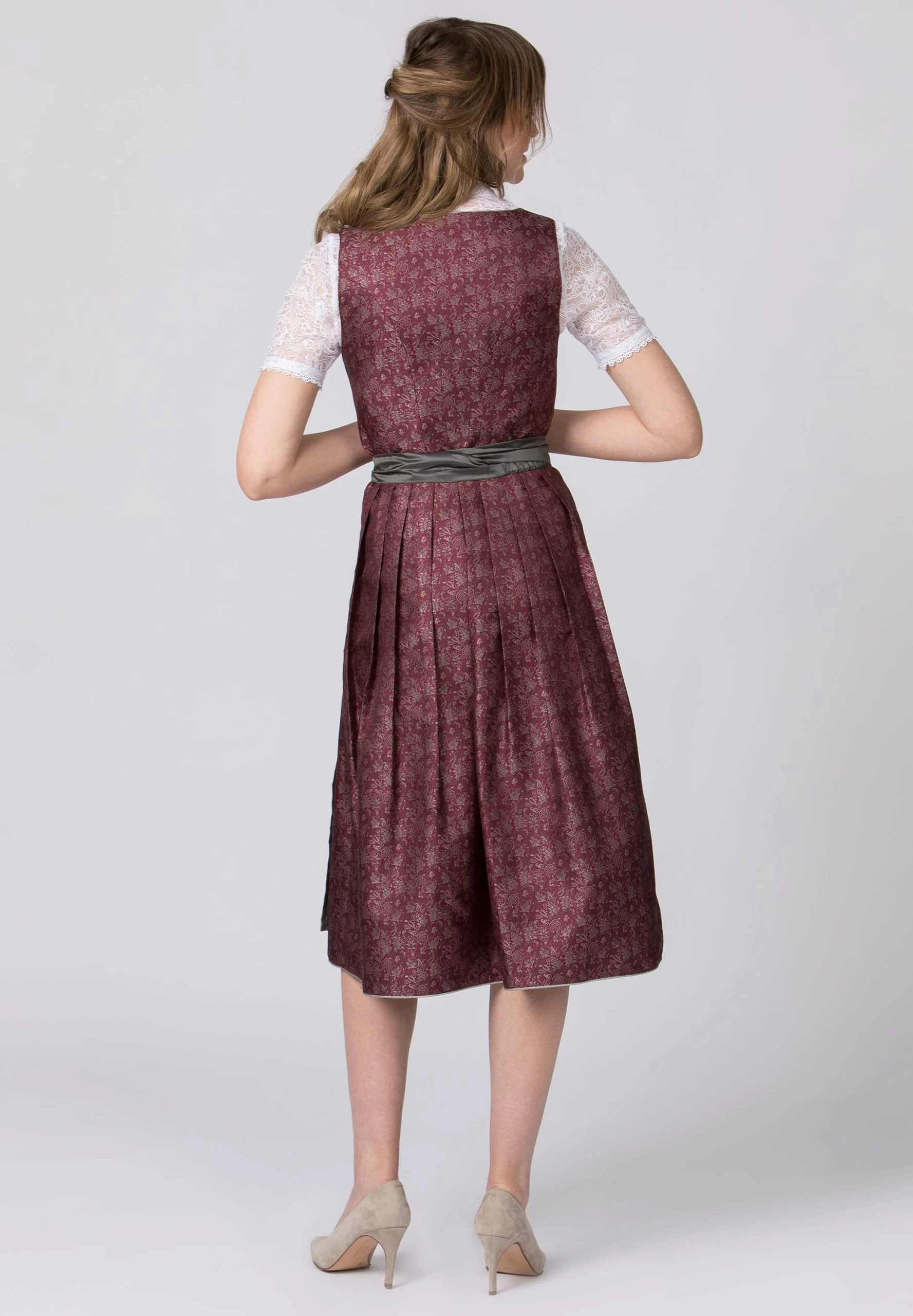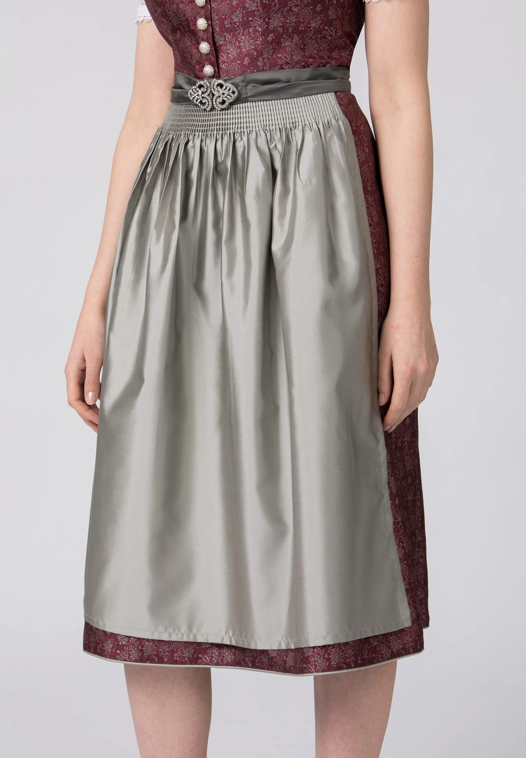 Dirndl Leonora von Heimatgwand. Das Modell besticht durch den Münchner Schnitt und überzeugt mit schlichter Eleganz. Der gemusterte, hochwertige Jacquardstoff setzt besondere Akzente. Die edle Schürze mit exklusiver Zierschnalle prägt den eleganten Look. Ein hinreißendes Lieblingsstück für viele Feierlichkeiten. Unser Model trägt die Dirndlbluse Lyla in weiß.