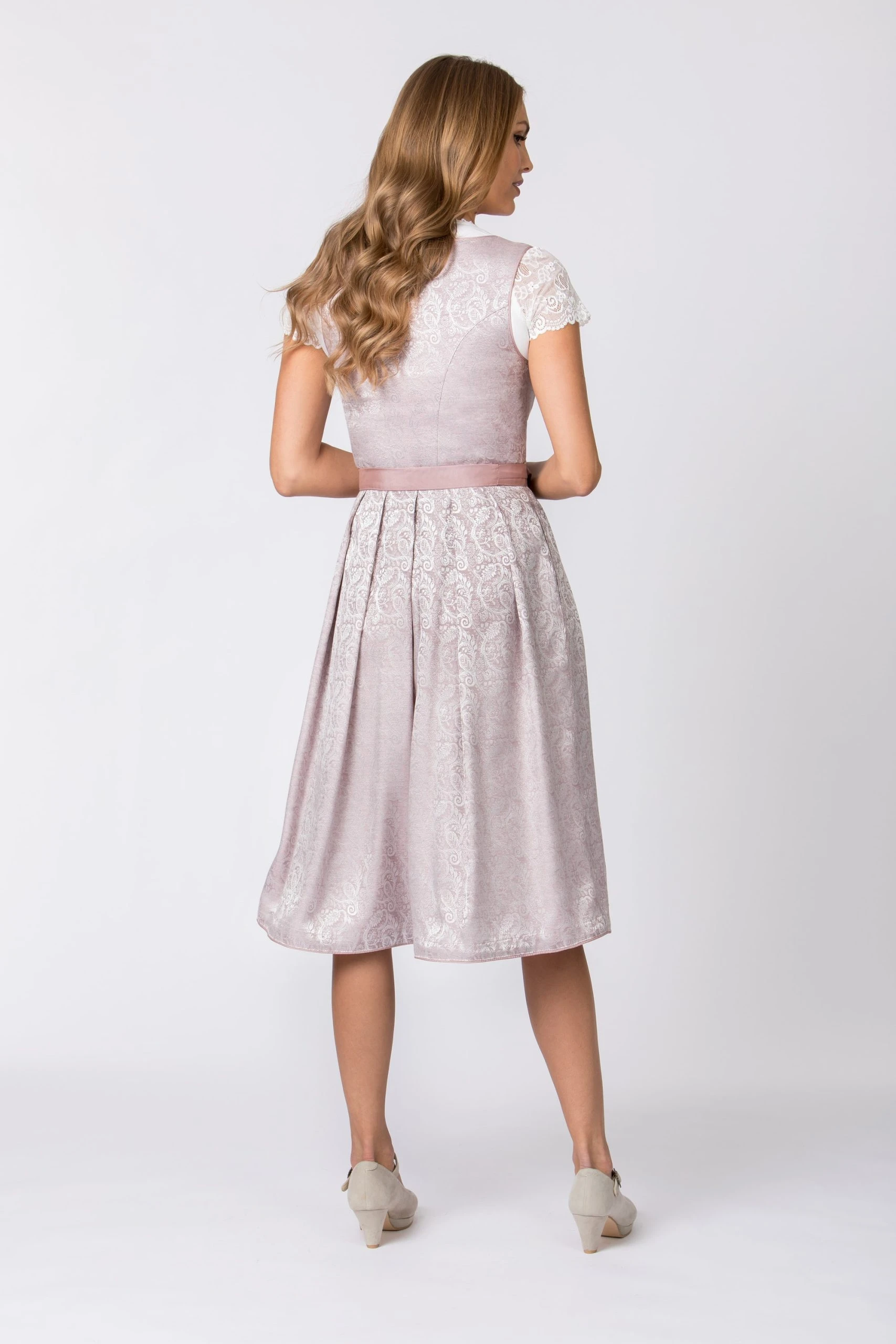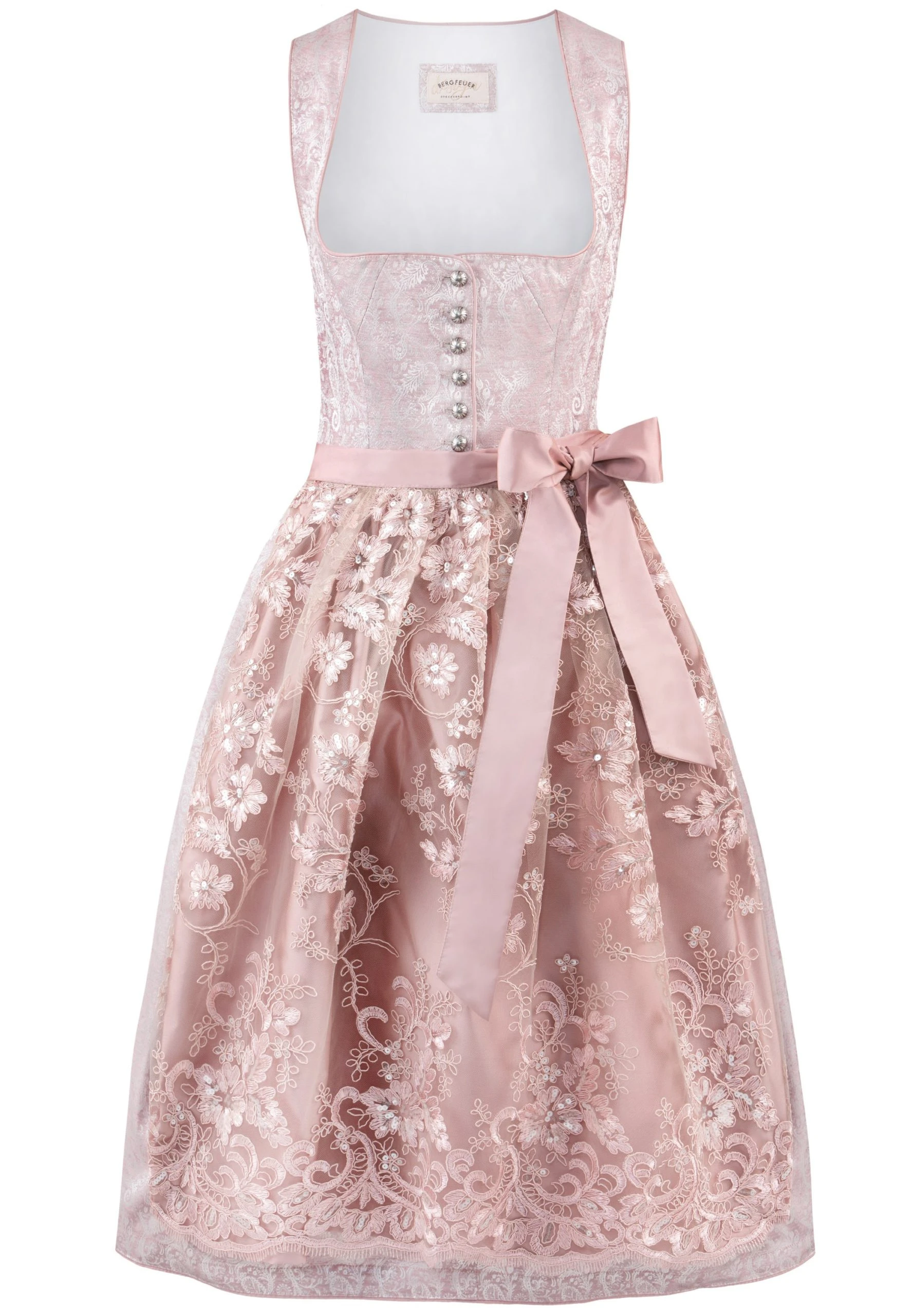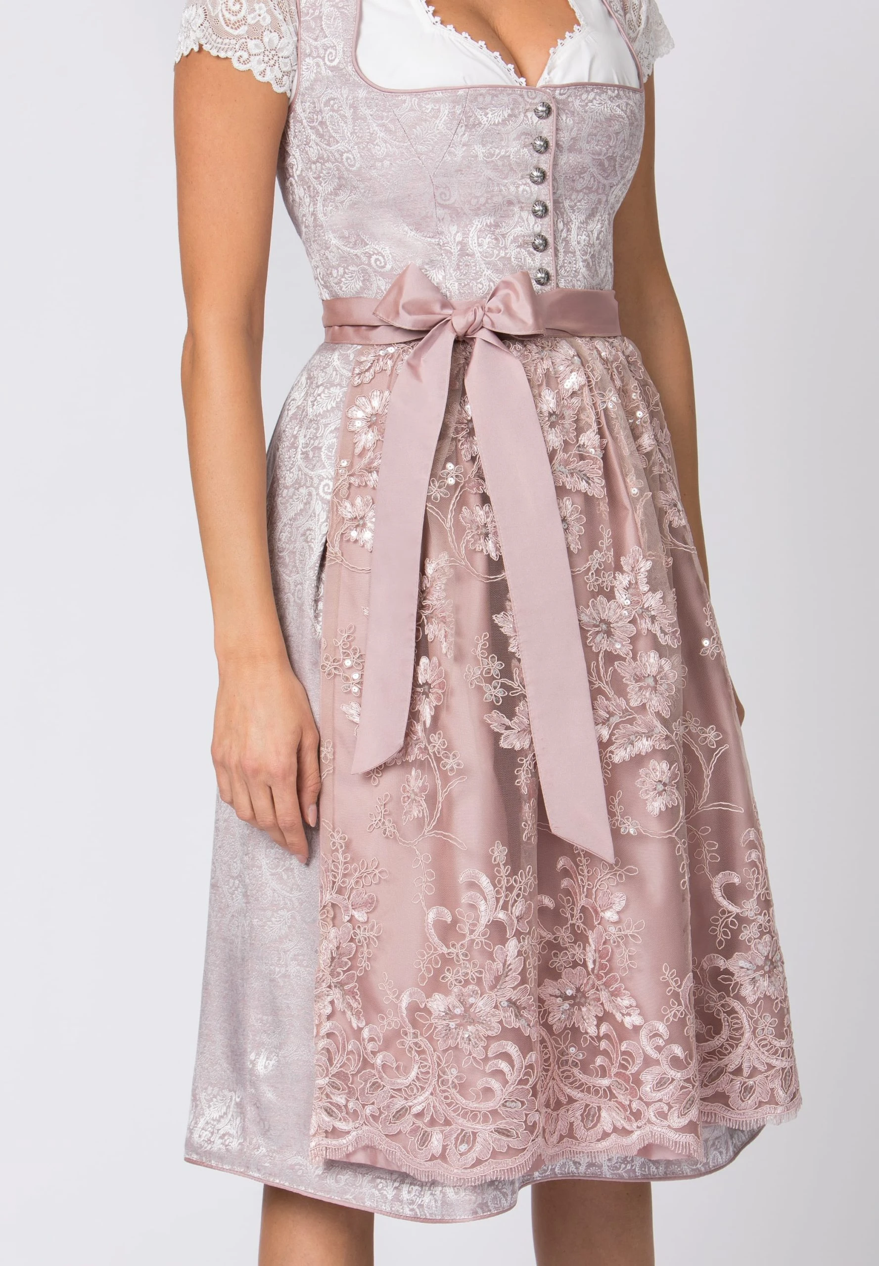 Dirndl Sidonia von Bergfeuer. Mit stilvollem trachtigen Paisley Muster versehen, verzaubert das edle Dirndl mit zahlreichen liebevollen Details. Das Mieder mit einem Münchener Schnitt überzeugt durch schlichte Eleganz und zaubert ein schönes Dekolleté. Die exklusiven Knöpfe verfeinern das gesamte Erscheinungsbild. Der in Falten gelegte und elegant fallende Rock wird durch die farblich abgestimmte Spitzenschürze perfekt abgerundet.