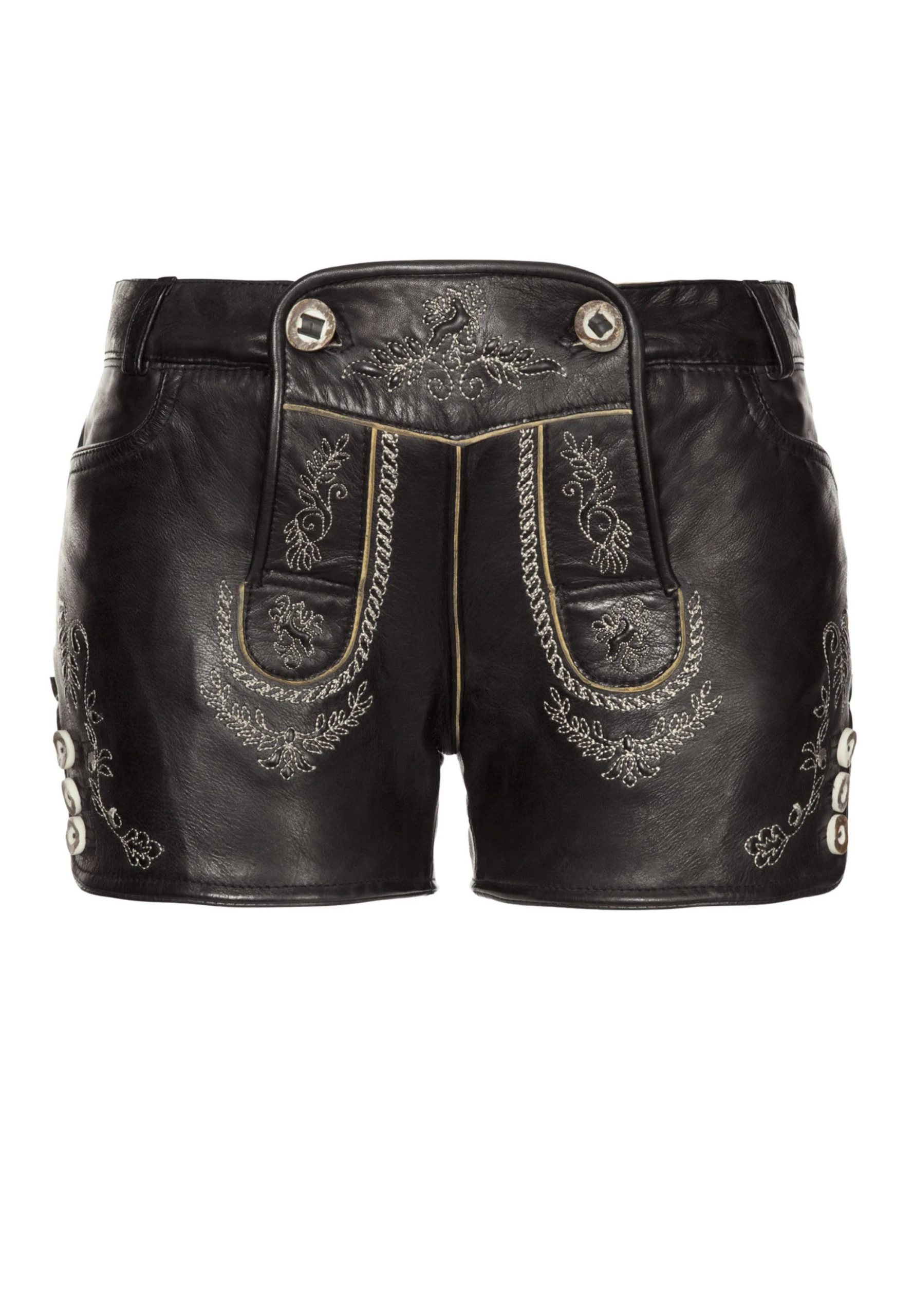 Lederhose Mona von Stockerpoint in schwarz. Die kurze, feminine Damenlederhose aus hochwertigem weichem Nappa Leder zeichnet sich durch den ausgefallenen Trachten-Look aus. Die Hose ist mit einer filigraner Stickerei aufwendig bestickt und liebevoll von Hand veredelt. Hochwertige Hornknöpfe setzten das Modell gekonnt in Szene und prägen den besonderen Look. Die kurze Hose ist dein ständiger Begleiter und ein „must have“ für jede Trachten Liebhaberin.
