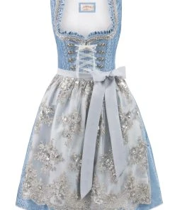 Dirndl Anastasia von Bergfeuer in hellblau-silber. Das zeitlose Dirndl begeistert durch das trendige Allover Muster und ist mit liebevollen Details versehen. Für die feminine Note sorgen die eingearbeiteten Rüschen am Rundausschnitt, die aufgenähten Zierborten sowie die mit Strasssteinen verzierten Miederhaken in altsilber. Die Schnürung aus einem farbig passenden Organza Band unterstreicht das edle Design. Ein Lieblingsstück für viele Festlichkeiten. Unser Model trägt die passende Bluse Jasmin in der Farbe weiß.