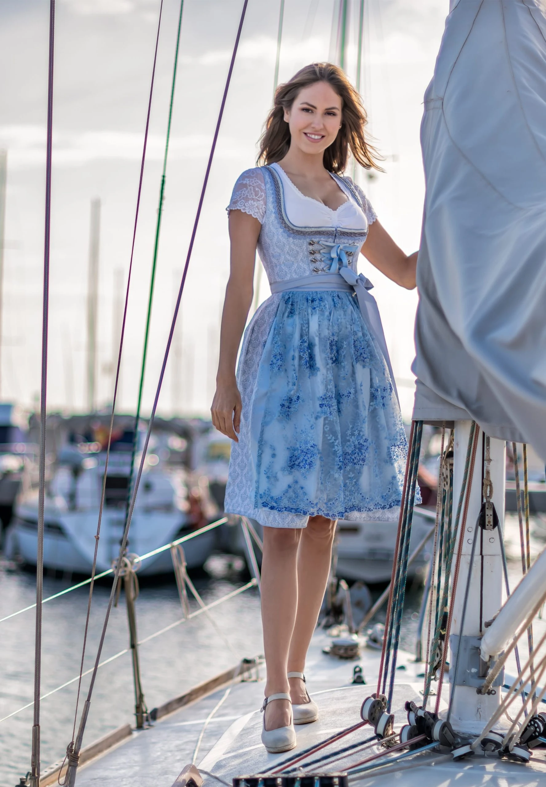 Dirndl Annabelle für Damen von Bergfeuer in hellblau. Das exklusive, trendfarbige Dirndl aus elegantem Jacquard besticht durch das aufwendig verarbeitete Dekolleté. Die von Hand bestickte Spitzenschürze ist hochwertig verarbeitet und liebevoll verziert. Der Rock ist stilvoll in Falten gelegt und mit einer Schubtasche versehen. Das kontrastfarbige Schürzenband spiegelt sich in den Farben wider. Unser Model trägt die dazu passende Bluse B-5077 der Farbe weiß.