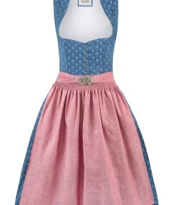 Dirndl Coraline von Heimatgwand in blau-altrosa. Das Modell besticht durch den trachtigen, gemusterten Baumwolldruck. Das Schalkragen Dirndl wird durch hochwertige Knöpfe in altsilber verziert. Klassische Akzente setzt die geschmackvolle Schürze mit erlesener Metallschließe. Ein Klassiker für die traditionelle Dirndl Liebhaberin. Unser Model trägt die Dirndlbluse B-8033 in weiß.