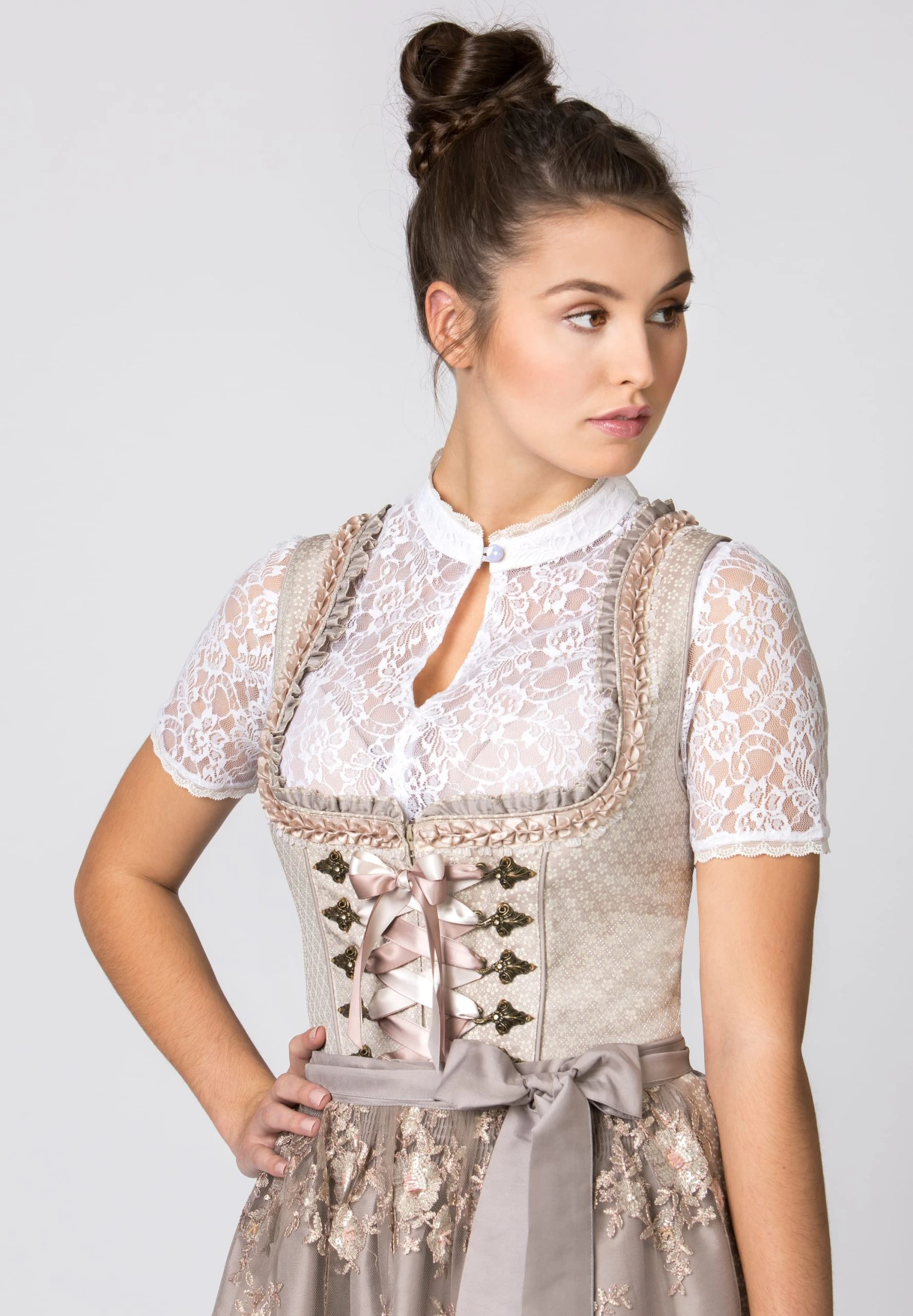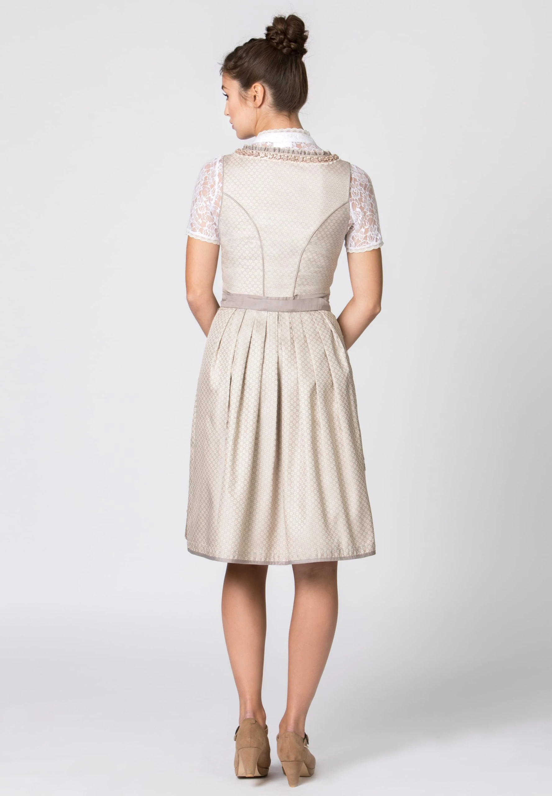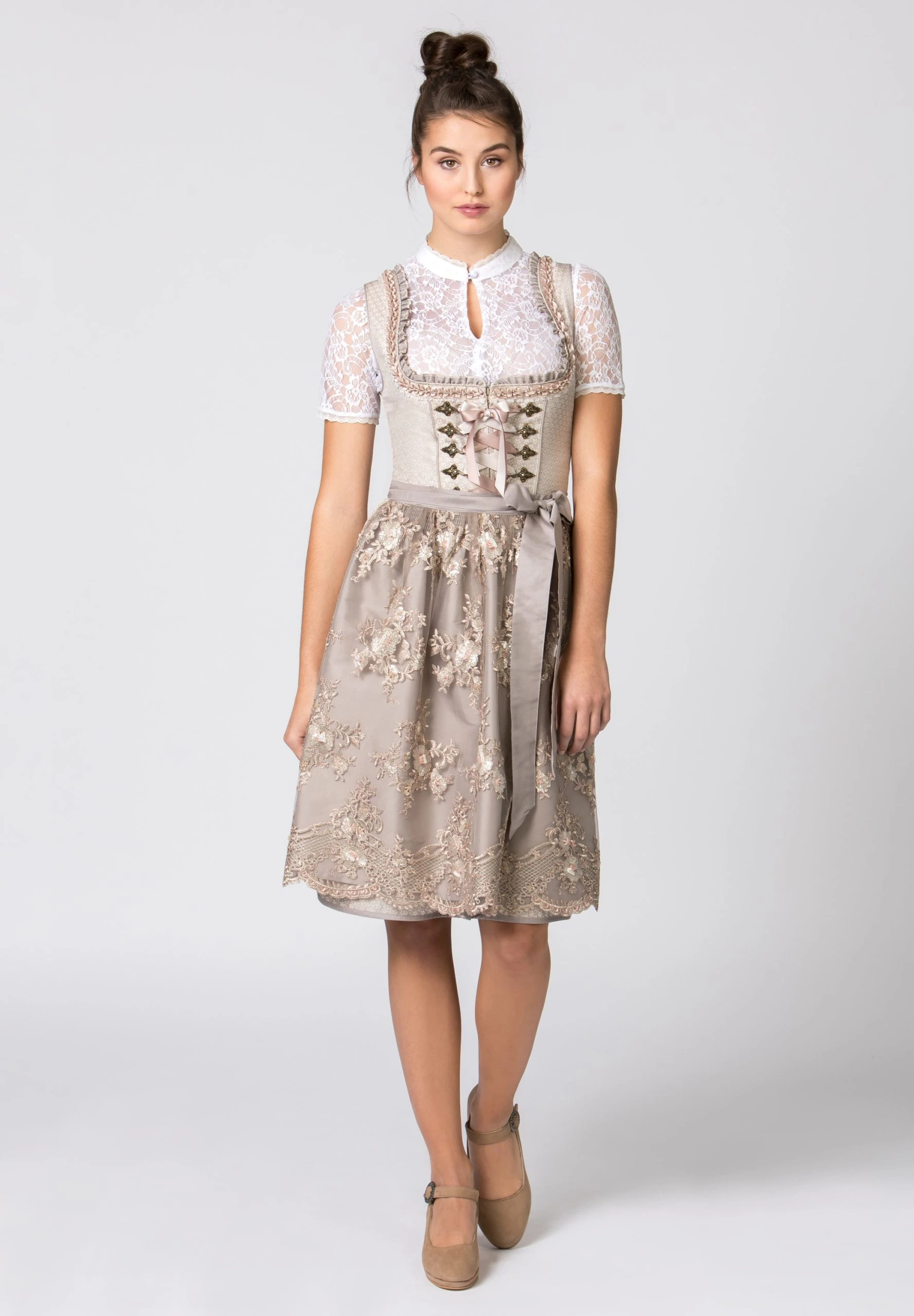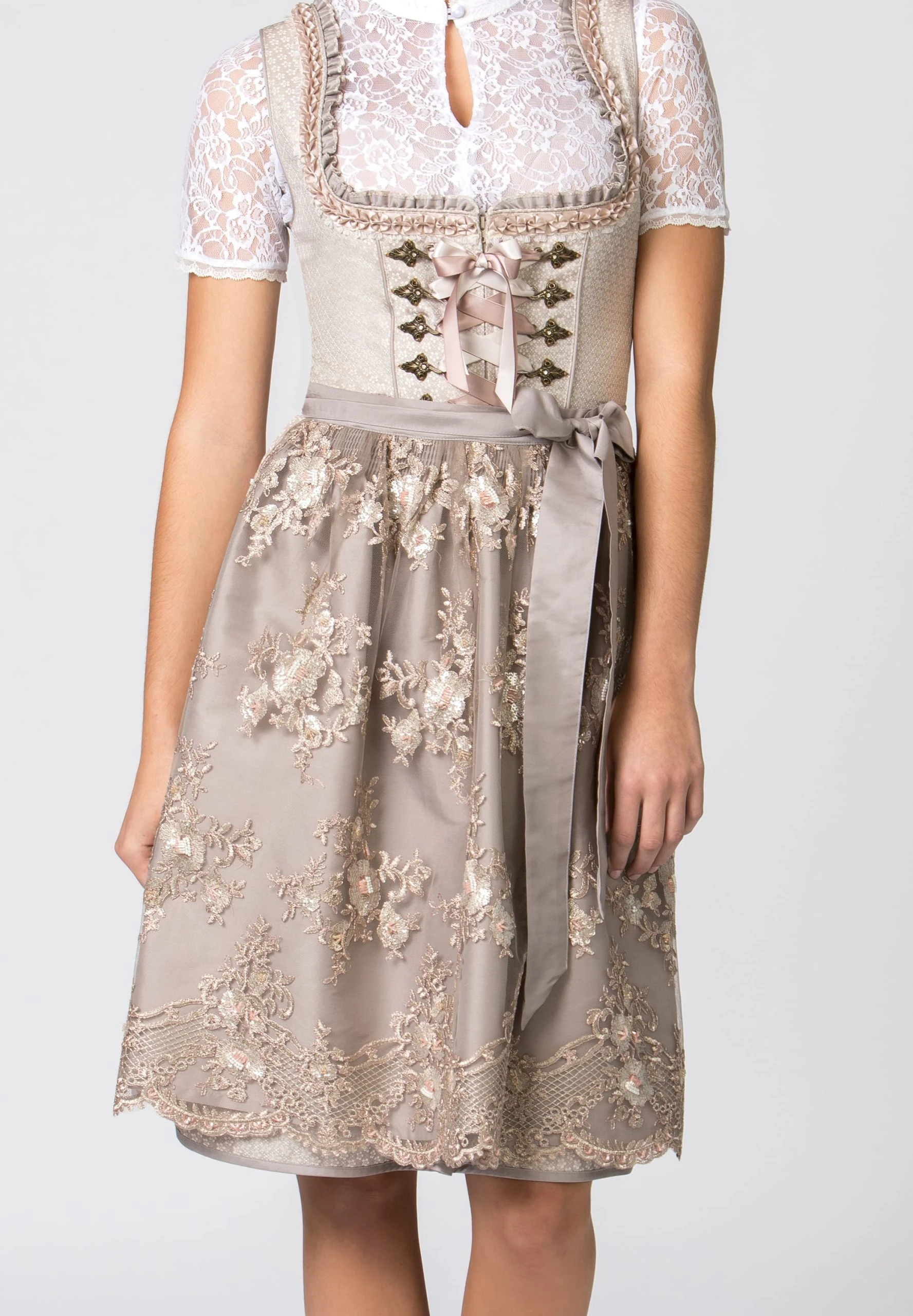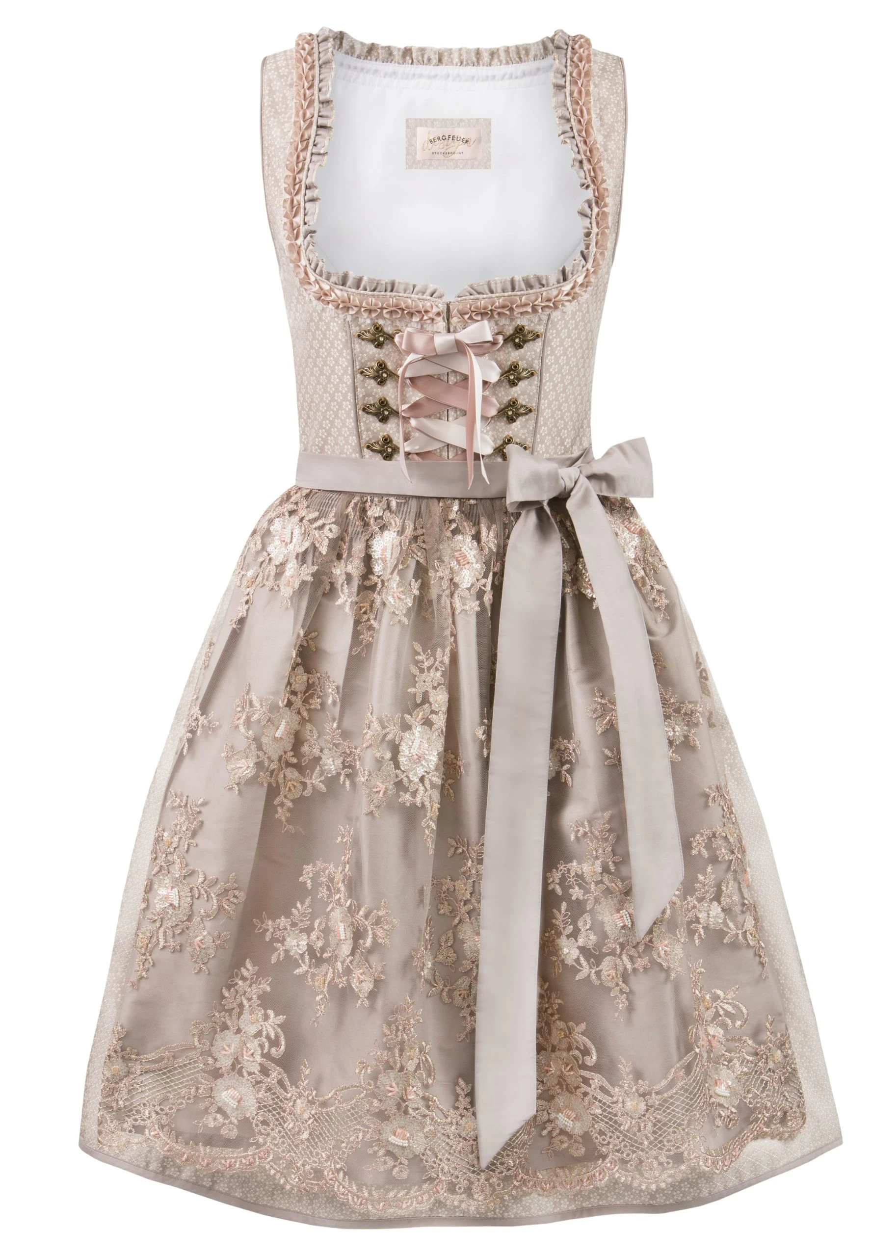 Midi-Dirndl Elyse für Damen von Bergfeuer in taupe. Das stilvolle Dirndl begeistert durch das florale Allover Muster und ist mit liebevollen Details versehen. Für die feminine Note sorgen die eingearbeiteten Rüschen am Rundausschnitt, die aufgenähten Zierborten sowie die mit Strasssteinen verzierten Miederhaken. Die Schnürung aus einem farbig passenden Satinband unterstreicht das Design. Der in Falten gelegte Rock mit einer Schubtasche fällt elegant und wird durch die farblich abgestimmte Spitzenschürze perfekt abgerundet.